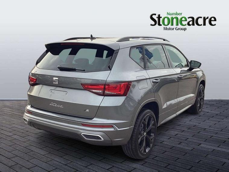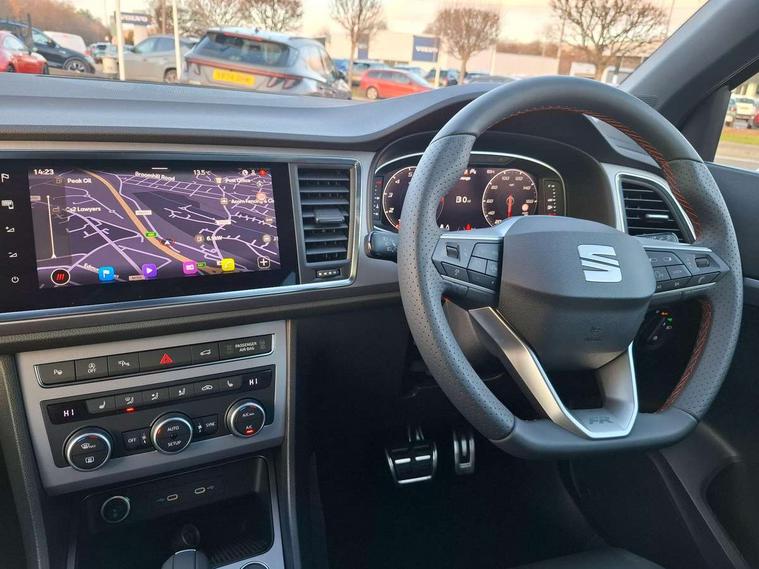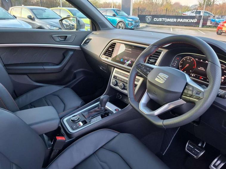 10" Digital cockpit, Bluetooth audio streaming with handsfree system, E-call, Electric tailgate with virtual pedal, Outside temperature gauge, Progressive power assisted steering, SEAT drive profile with driving experience button - Normal, Sport, Eco and Individual mode, steering and throttle response, Self parking functionality (includes front and rear parking sensors), Speed limiter, Start/stop system, Top view camera with rear view camera, Trip computer, wired and wireless full link smartphone integration, Wireless phone charger, Steering wheel mounted audio/phone controls, Black roof rails, Black side window trim, Body colour bumpers, Body coloured wheel arch surrounds, Chrome front grille frame, Dark tinted rear windows, Daytime running lights, Door mirrors with welcome light silhouette, Dynamic headlight range control with self adjusting whilst driving, Electric adjustable/heated/folding door mirrors, Front and rear electric windows, Illuminated aluminium front door sill, LED 3rd brake light, LED headlamps with lens and LED front fog lamps with cornering function, LED rear tail lights with dynamic indicators, Rear exhaust tailpipe, Rear fog lights, Rear side wing doors, Rear spoiler, Rear wash/wipe, Variable front intermittent wipers, 12V socket in front, 3 seat bench in 2nd row, 60/40 split folding rear seat, Aluminium pedals, Black greenhouse interior roof, Dual zone climate control, Electric adjustable driver seat with memory function, Front and rear head restraints, Front centre armrest, Front seat back storage pockets, Heated front seats, Height adjustable passenger seats with lumbar adjustment, ISOFIX points in outer rear seats with top tether anchorage points, Leather sports steering wheel and gear knob, Leather upholstery with front comfort seats, Rear armrest and easy back seat release mechanism from boot, Single front passenger seat, Convenience pack - Ateca, Interior lighting pack - Ateca, Navigation system pack with DAB - Ateca, Safety and driving pack (L) - Ateca, Safety and driving pack with attention and drowsiness assist - Ateca, 3x3 point rear seatbelts, ABS, Traction control system (TCS), Electronic stability control (ESC) and Electronic differential lock system (XDS), Airbags - Driver and front passenger airbag with deactivation, front side, two curtain and driver's knee airbags, Electric parking brake with auto hold function, Front and rear seatbelt reminder, Hill hold control, Manual rear child locks, Single tone horn, Tyre pressure monitoring system, Alarm, Keyless entry, Locking wheel bolts, Remote central locking, Chrome interior detailing, 19" Exclusive alloy whelels 36/10 in glossy black, Tool kit,