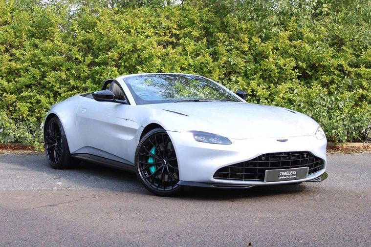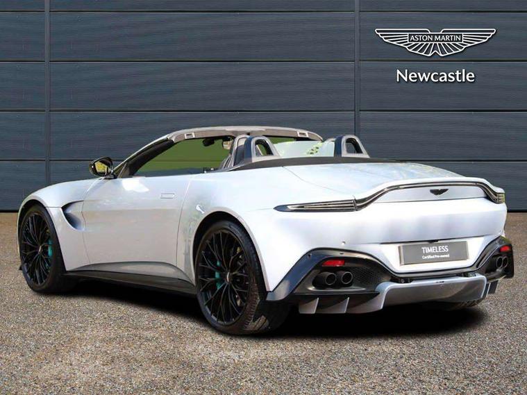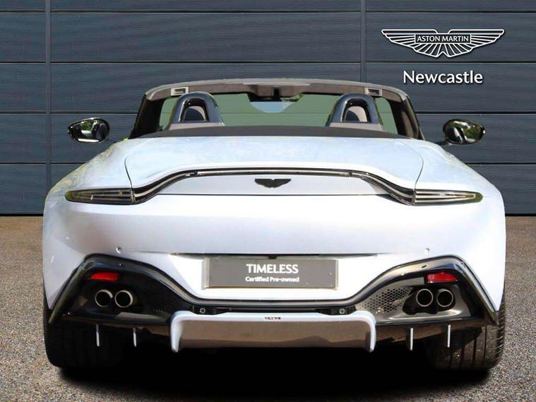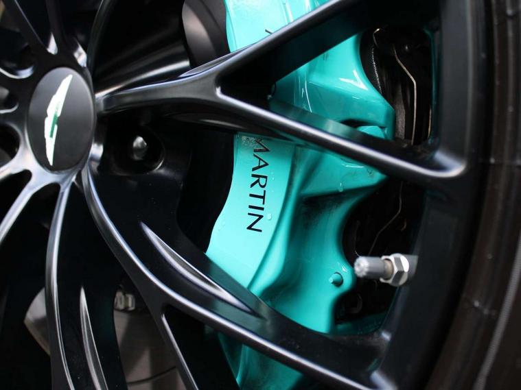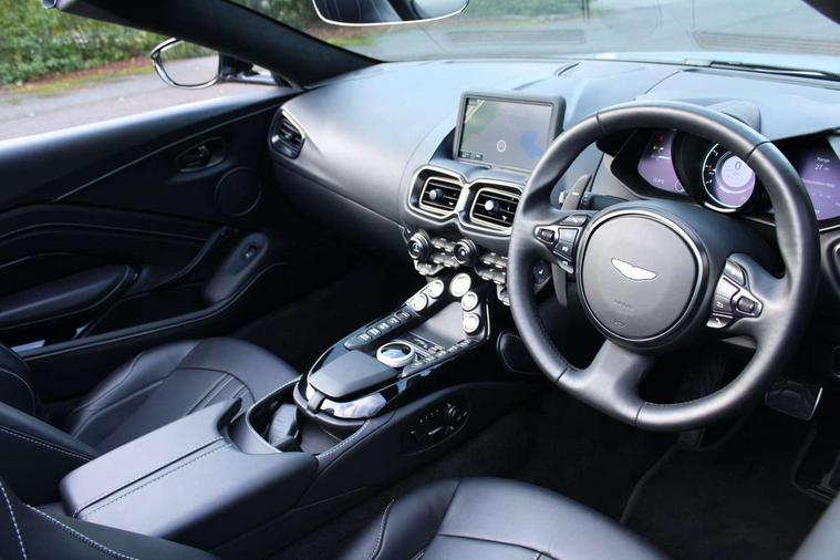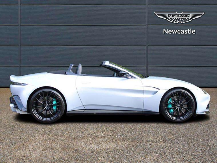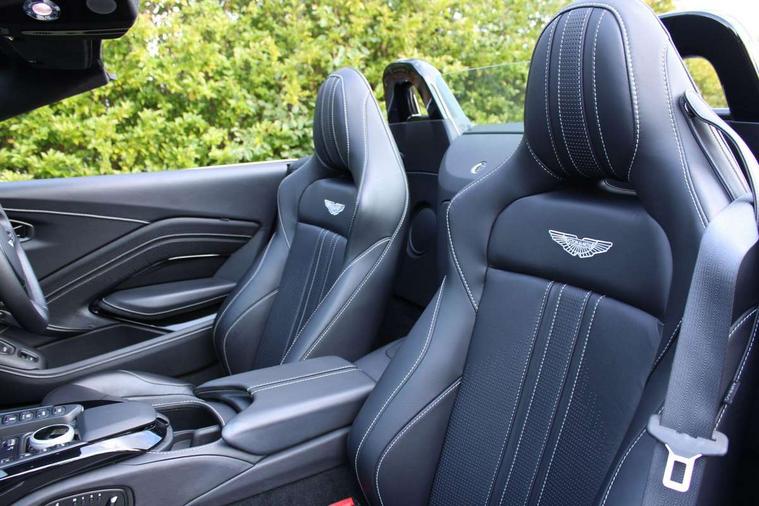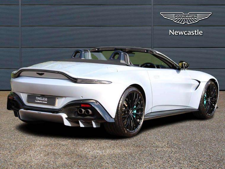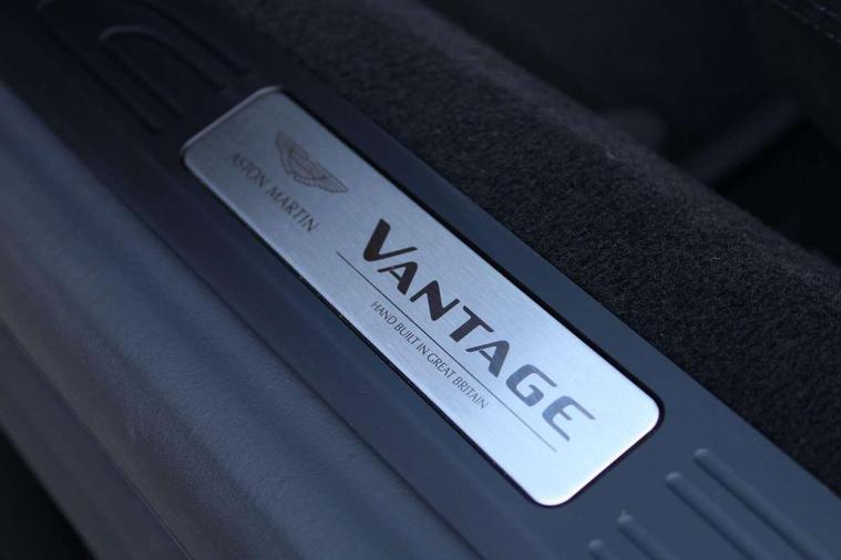 360 degree parking camera, Blind spot monitoring, Bluetooth Telephone preparation, Emergency services call system, Park assist, Rotary dials, Servotronic speed sensitive power steering, Trip computer, Sports suspension, Auxiliary input socket, DAB Digital radio, iPod connection, USB connection, 3rd brake light, Body colour decklid insert, Body colour door handles, Electric folding mirrors, Electric front windows, Full width LED tail lights signature with stop tail and dynamic indicator functions, Heated door mirrors, LED daytime running lights, LED high and low beam headlamps with integrated directional indicator, LED lock/unlock graphic theatre lights, LED position lamp, Paint protection film, Quad matte black exhaust tailpipe finisher, Rear boot, Wind deflector, 8 way electrically adjustable front seats, Black loadspace carpet, Centre console armrest with closed storage, Climate control, Detailing perforation, Electric steering column with cruise control, Embossed - Aston martin wings, Floor mats, Front head restraints, Heated front seats, Single front passenger seat, Service pack - Vantage, ABS + EBD + EBA, Cast iron brakes, DSC - Dynamic Stability Control, Front side airbags, HBA (Hydraulic Brake Assist), Hill hold assist, Traction control, Tyre pressure monitoring system, Alarm, Immobiliser, Keyless entry, Remote central locking + boot release, Glass switches, Colour keyed wheel caps, Tyre repair kit,