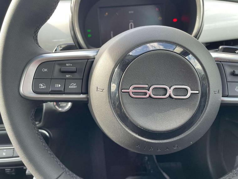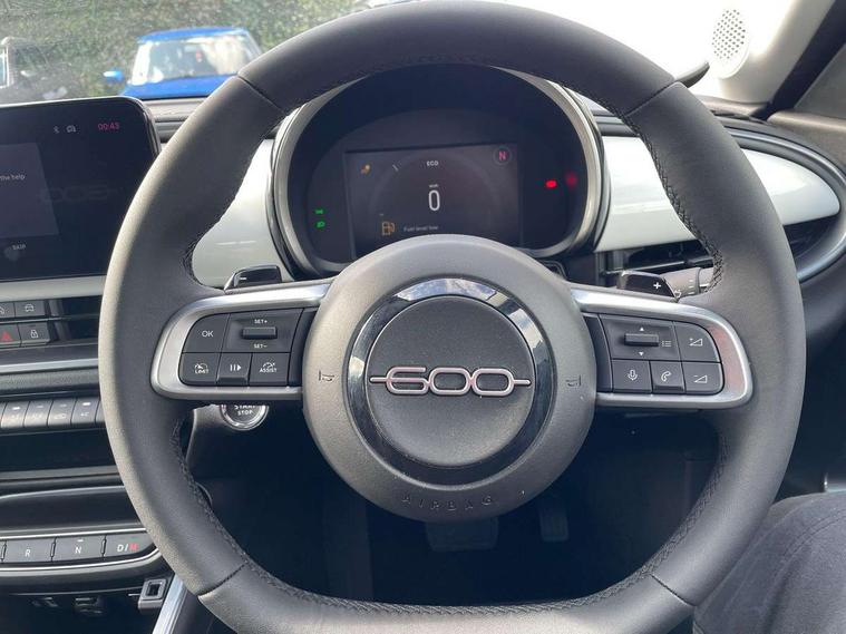 7" TFT digital cluster, Bluetooth connectivity, BSRF connectivity box, Connected services, Cruise control, Drowsy driver detection, Emergency E-call assist, Engine emission level default, GSR II step 1, Intelligent speed assist, Lane keeping assistant (LKA), Odometer, Power assist steering, Rain and dusk sensors, Rear parking sensors, Traffic sign recognition, Wireless apple car play/android Auto, Without drive mode selector, L2-AGM 12V battery, 1st Row USB type-A and USB type-C, 4 speaker audio system, Radio, Uconnect infotainment 10.25" touchscreen with DAB, All power windows express Up/Down, Auto dimming frameless rear view mirror, Automatic headlights, Body coloured door handles, Chrome day light openings, Electric adjustable door mirrors, Exterior chrome accents, Front and rear Chromed 600 logo, Gloss black finish B pillar, Gloss black shark fin antenna, Glossy black door mirrors, Heated windscreen wiper blade area, LED 3rd brake light, LED daytime running lights, LED Fog lamps with cornering function, LED front signature lighting, LED front turn indicators and position lights, LED rear lights, LED rear signature lighting, LED reflector headlamps, Matt black side skirts with 600 chromed logo, Rear bumper embossed 600 logo, Rear roof spoiler, Rear side wing doors, Rear wiper, 2 Spoke synthetic leather steering wheel with audio control, 3 rear headrests, 3 seat bench in 2nd row, 4 way manually adjustable passenger seat, 6 way manually adjustable drivers seat, Auxilliary 12V power socket, Body colour dashboard fascia, Chrome interior door handles, Dark metachrome dashboard ring, English handbook, Front centre armrest, Front headrests, Front passenger grab handle, Front seatback pockets, ISOFIX attachment on front passenger and rear passenger seats, Manual climate control, Metachrome central compartment bezel, Monogram fabric upholstery, Paddle shifts, Partial body cover for shipment, Predisposal for accessory upgrade to default tunnel pad cover (dedicated prnd bezel), Rear seat 40/60 split, Single front passenger seat, Smart 15L storage central tunnel with tunnel pad cover, Sunvisor label ciao Fiat, Sunvisors with vanity mirrors, 3x3 point rear seatbelts, 6 airbags, ABS, Autonomous Emergency Brake (AEB) & Vulnerable Road User (VRU) Protection, Child locks on rear doors, Electronic parking brake with auto hold, ESC (Electronic Stability Control), Front passenger airbag deactivation, Seatbelt reminder and pretensioners for all seats, Anti-theft volumetric alarm, Anti-theft wheel bolts, Keyless Go, 17" Diamond cut alloy wheels, Fix and go puncture repair kit,