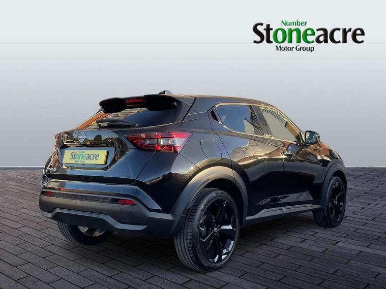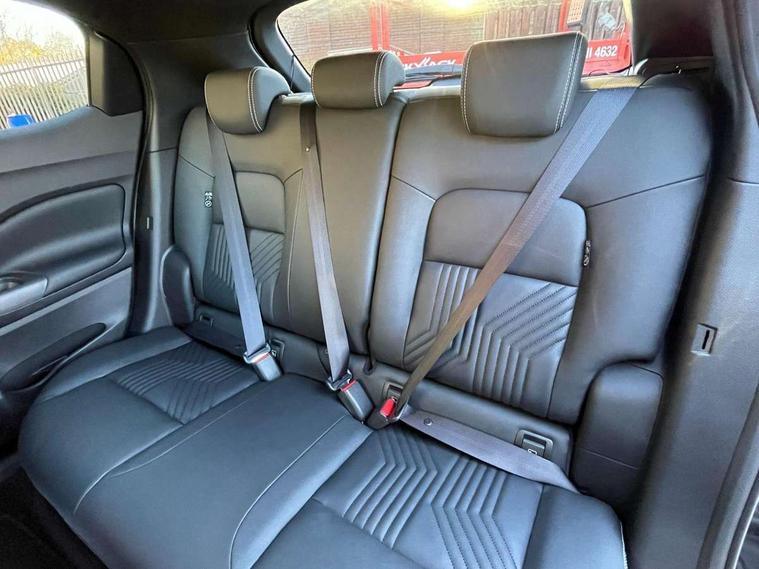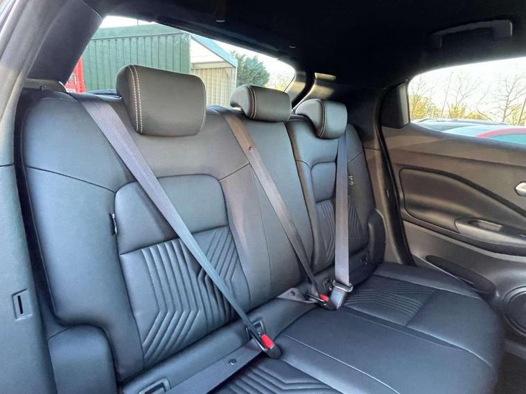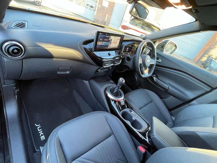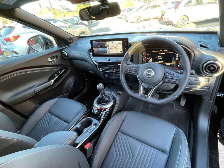 12.3" full colour TFT screen combimeter, Drive modes select (Eco, normal and sport), Emergency and breakdown call, Front parking sensor, Idle start/stop system, Intelligent driver alert system, Intelligent lane intervention, Lane departure warning system, Nissan connect 12.3" touch screen entertainment system, Nissan connect nav with TomTom traffic, Nissan connect services, Outside temperature sensor, Power Steering, Rear parking sensor, Stop/start button, Traffic sign recognition, Trip computer, Voice recognition, WiFi connectivity, Wireless Apple CarPlay and Google Android auto, Wireless Smartphone charger, 10 Bose speakers 8 speakers and 2 headrest speakers for driver/passenger seats, 2 X Rear console USB port, Bluetooth system, USB, Aux-in and 12V socket, Bose personal plus audio system, DAB Digital radio, Auto dimming frameless rear view mirror, Automatic hazard signal with emergency stop signal, Body colour door handles, Electrically adjustable door mirrors with integrated indicators, Follow me home headlights, Front and rear electric window with one touch driver window, High beam assist, LED 3rd brake light, LED daytime running lights, LED front fog lights, LED headlamps, LED rear fog lamp, LED rear lamps, One touch passenger window, Rear privacy glass, Rear side wing doors, Rear wiper, Roof spoiler, Shark fin roof antenna in solid Black, Solid black door mirrors, Three blink turn signal, 3 height adjustable rear headrests, 3 seat bench in 2nd row, 60/40 split folding rear seat, Card holder on driver sunvisor, Door ambient lighting, Driver seat back pocket, Driver side rear coat hanger, Driver/passenger sunvisors and vanity mirrors, Front and rear cabin lights, Front armrest, Front door pockets with bottle holders, Front head restraints, Front/rear passenger grab handles, Gear console ambient circle lighting, Height adjustable driver's seat, Internal chrome door handles, Luggage board, Luggage space lighting, Monoform sporty seats, Multifunction steering wheel, Passenger seat back pocket, Rear door bottle holders, Single front passenger seat, Smooth synthetic leather steering wheel, Synthetic leather kneepad, Synthetic leather shift knob, Synthetic leather upholstery, Telescopic steering wheel adjustment, Two cupholders in front centre console, Two rear isofix child seat anchorage points with top tether, Welcome light and console tray ambient lighting, Advanced safety shield pack - Juke Manual, Comfort pack - Juke, Heat pack with height adjustable passenger seats - Juke, ABS with EBD and brake assist, Active ride control, Active Trace Control, Driver and passenger airbags, Driver and passenger side airbags, Electric handbrake with auto hold function, Electronic Stability Programme (ESP), Front and rear curtain airbags, Height adjustable seatbelts, Hill start assist, Intelligent emergency braking with pedestrian and cyclist recognition, Rear door child safety locks, Seatbelt reminder for driver/front passenger and rear seats, Three 3 point rear seatbelts, Traction control, Tyre pressure monitoring system, VDC Dynamic Vehicle Control, Alarm, Immobiliser, Intelligent key and start push button with walk away lock and approach unlock functions, Remote central locking, 19" Alloy wheels, Tyre puncture repair kit,
