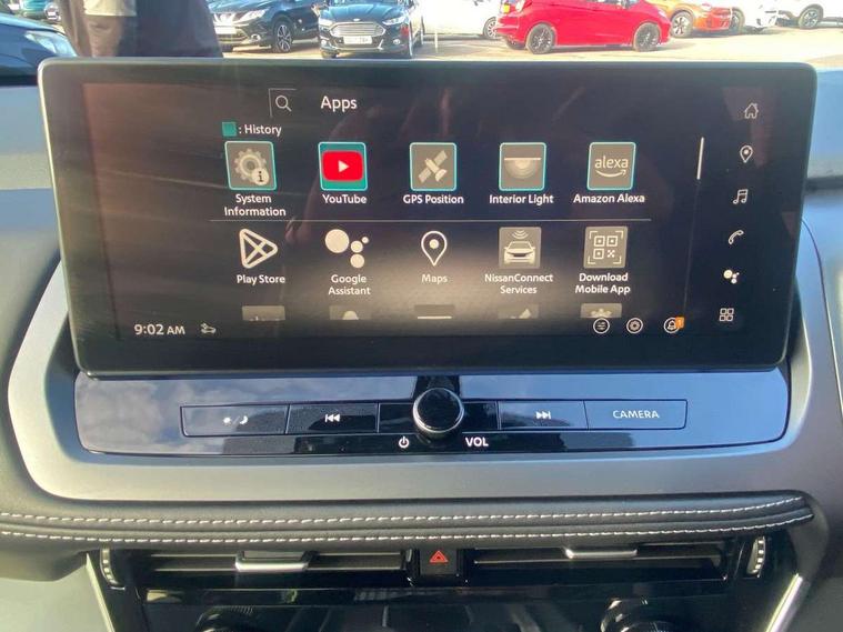 2 front USB-C ports, 2 rear USB-C ports, 360 degree Intelligent around view monitor with moving object detection, Blind spot warning, Drive assist custom mode, Drive modes (sport, normal, eco), Driver drowsiness and attention warning, Electric speed sensitive power steering, Emergency and breakdown call, Emergency lane keep assist, Emergency Stop Signal (ESS), Engine start/stop button, Event data recorder, Front and rear parking sensors, Full Digital 12.3" TFT Digital Combimeter, Google virtual personal assistance, Idle stop/start system, In-car WIFI hotspot, Intelligent Cruise control (ICC), Intelligent driver alert system, Intelligent forward collision warning, Intelligent lane intervention, Intelligent speed assist, Lane departure warning system, Maximum speed limiter, Nissan connect 12.3 inch touchscreen infotainment system, Nissan connect navigation with google maps, Nissan connect services 2.0 (Google Automotive System), Outside temperature sensor, Propilot assist with Navi-Link, Rear cross traffic alert, Remote control services - door locks, lights, horn and car locator, Reversing detection, Traffic jam pilot, Traffic sign recognition with legal speed adjustment, Trip computer, Wireless Apple CarPlay/Android Auto, Wireless charging pad, Limited slip differential, 6 speakers, AM/FM audio system with DAB, Bluetooth audio streaming, Auto rear wiper when reversing, Body coloured door handles, Bodyside mouldings, Chrome side window finisher, Electric auto folding door mirrors, Electrically adjustable and heated door mirrors with LED turn indicator, Follow me home headlights, Gloss black mirror caps, High beam assist, Intelligent auto headlights, LED 3rd brake light, LED daytime running lights, LED Headlights, LED rear lights, One touch front and rear electric windows with remote opening and closing, One touch passenger window, Partially body coloured bumpers, Rain sensing wipers, Rear privacy glass, Rear roof spoiler, Rear side wing doors, Rear styling plate, Shark fin antenna, Silver roof rails, Splash free rain sensing wipers, Super UV and infrared cut glass, Three blink turn signal, 12v power socket in dashboard and luggage, 3 bench rear seats in 2nd row, 3 rear headrests, 60/40 split folding rear seat bench, Chrome interior door handles, Cloth upholstery, Dark headlining, Driver and passenger sunvisors with illuminated vanity mirrors, Driver seat back pocket, Dual zone automatic climate control with pollen filter, Electrically adjustable lumbar support for driver, Front centre console and armrest, Front cupholders, Front door with bottle holders, Height adjustable driver seat, Height adjustable front headrests, Height adjustable passenger seat, Luggage board system, Luggage space lighting, Multifunction steering wheel, Passenger seat back pocket, Rear door bottle holders, Rear seat armrest with 2 cupholders, RGB ambient light (Partial area coverage), Single front passenger seat, Smooth leather steering wheel, Steering wheel gearshift paddles, Tilt/telescopic adjustable steering wheel, Two rear isofix child seat anchorage points with top tether, 3x3 point rear seatbelt pretensioners + load limiters, ABS with EBD and brake assist, Autonomous emergency braking, Child locks on rear doors, Curtain and front side, far side airbags, Driver and passenger airbags, Driver, passenger and 2nd row rear seat belt reminder, Electric handbrake with auto hold function, Front seatbelt pretensioners + load limiters, Height adjustable front seatbelts, Hill start assist, Intelligent blind spot intervention, intelligent front emergency braking, Intelligent rear automatic braking, Tyre pressure monitoring system, Vehicle dynamic control, Engine immobiliser, Intelligent key with walk away lock and approach unlock functions, Remote central door locking with deadlocking, Thatcham alarm, 18" Diamond cut alloy wheels, Tyre puncture repair kit,