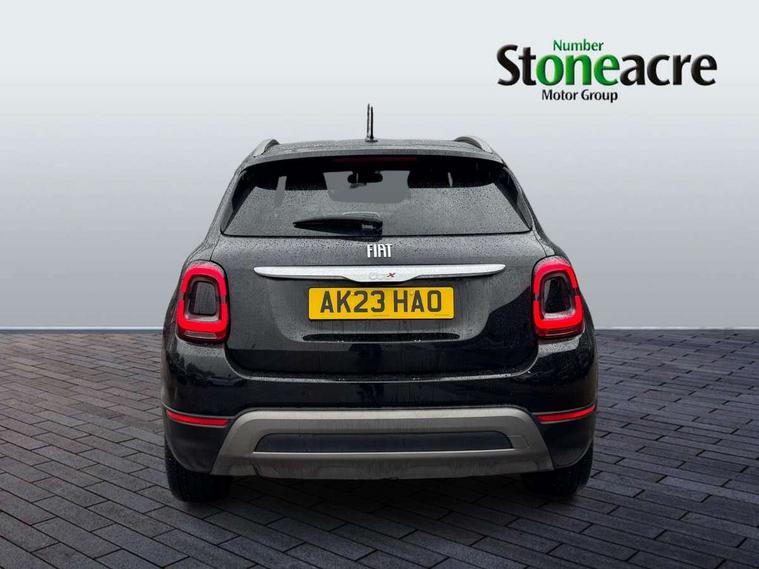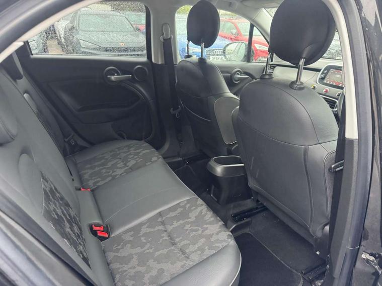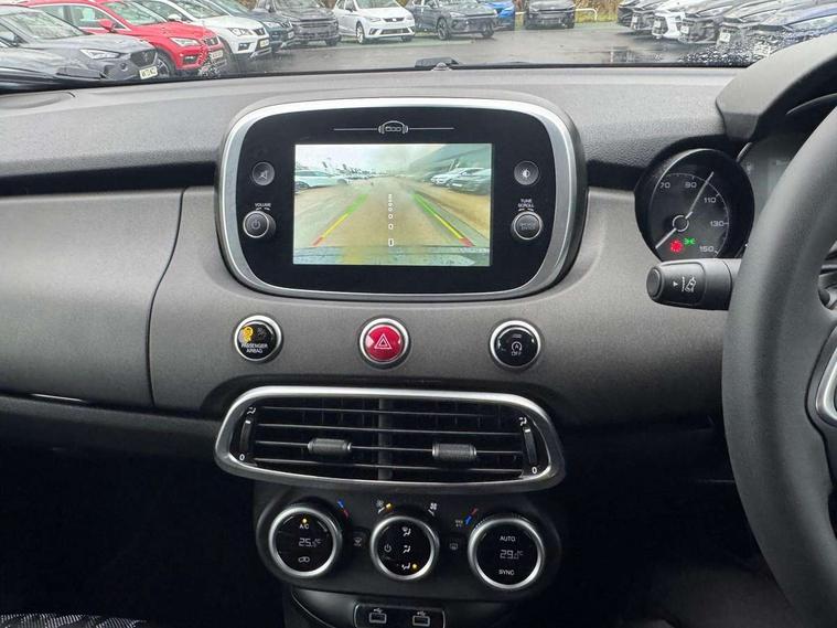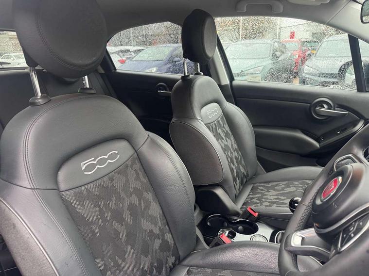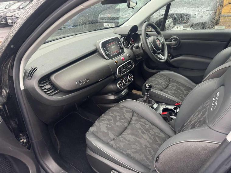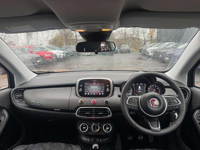 3.5" monochrome TFT display, 7" HD touchscreen DAB radio with bluetooth, 3D navigation, Aux-in and USB in central tunnel, Apple car play/Android Auto, Dusk sensor, E-call, Lane assist with intelligent speed assist and traffic sign recognition, Lane departure warning, Power assist steering, Rear parking sensor, Speed limiter, Stop/start system, Active roll mitigation, 6 speakers, USB port, 3rd brake light, All-road bumpers with protective inserts, Black electrically adjustable door mirrors, Black grained fog lights bezels, Dark tinted rear windows, Electric front and rear windows, Heated rear windows with wash wipe, LED tail lights, Privacy glass, Rain sensor, Rear side wing doors, Rear spoiler, Rear wiper, Satin chrome 500 logo, Satin chrome Fiat logo, Satin chrome front moustache, Satin chrome inserts tailgate, door handles, front moulding, Satin chrome skid plates, 3 seat bench in 2nd row, 60/40 split folding rear seat, Automatic dual zone climate control, Auxilliary 12V power socket, Cooled glovebox, Front head restraints, Height adjustable drivers seat, Height adjustable steering wheel, Parcel shelf, Satin Chrome door handles, Single front passenger seat, Soft touch steering wheel with controls, Sunvisors, Techno leather steering wheel with audio controls, Two rear head restraints, LED lights pack - 500X, 3x3 point rear seatbelts, 6 airbags - Front, side and window, Child locks on rear doors, Electronic parking brake, ESC including ASR, MSR, Hill Holder, ABS, EBD, ERM, DST, BAS, Front and rear seatbelt reminder, Height adjustable seatbelts, Passenger airbag deactivation system, Tyre pressure monitoring system, Deadlocks, Immobiliser, Remote central locking, Cold grey dashboard,
