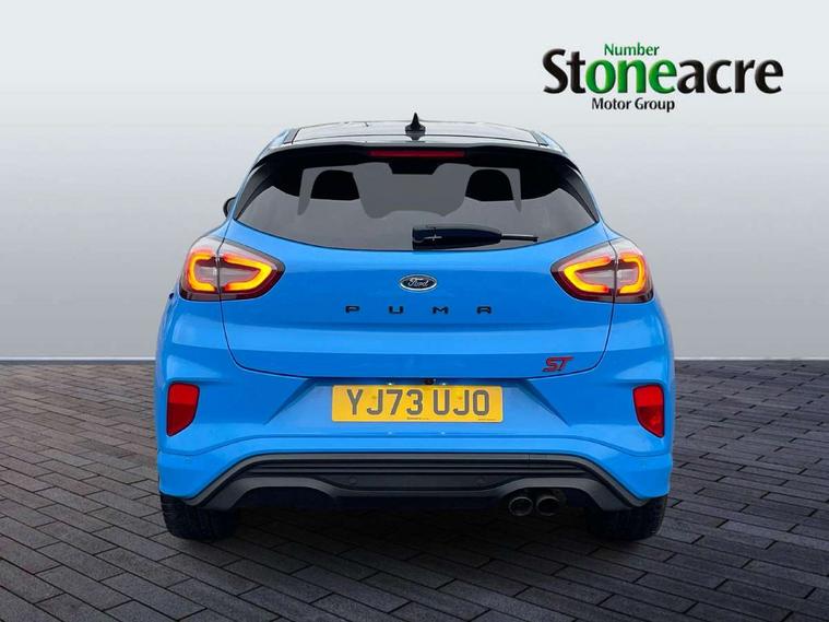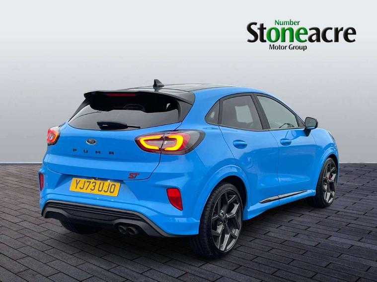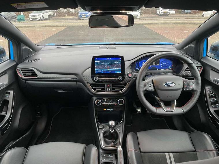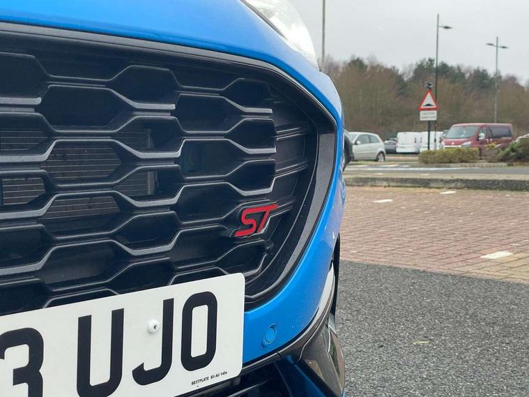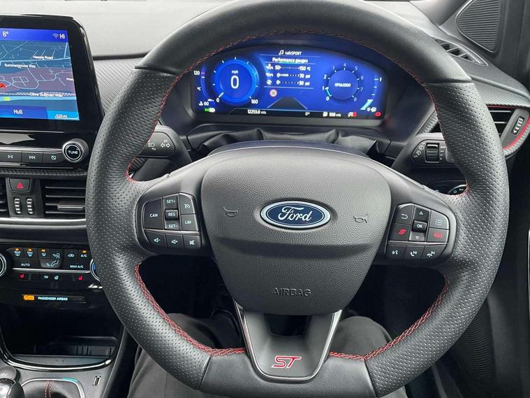 Cruise control with Intelligent speed assist, Driver impairment monitor, Emergency call service, Ford easy fuel, Front and rear parking sensors, Full digital 12.3" instrument cluster, Lane keeping aid with lane departure warning, Power assist steering, Selectable drive modes (normal, sport, eco, track), Speed sign recognition, Engine sound enhancer, ST suspension, Automatic headlights with auto high beam, Automatic rain sensing wipers, Dual chrome exhaust, Fixed LED signature headlamps, Front fog lamps, LED daytime running lights, LED rear lamps, Power foldable heated door mirrors with puddle lamps and puma logo protection, Privacy glass to side rear windows and tailgate glass, Quickclear heated windscreen, Rear side wing doors, Rear wiper, ST scuff plates, Third brake light, Unique ST body styling kit including contrast black roof, large rear spoiler and wing mirrors, plus Ford Performance embossed splitter, 3 seat bench in 2nd row, Alloy sports pedals, Centre console with armrest and stowage, Ford megabox extended bootspace, Ford Performance sensico partial premium leather upholstery with metal grey stitching, Front and rear floor mats, Front and rear head restraints, Manual 6 way driver seat adjust with lumbar adjustment, Manual 6 way passenger seat with lumbar seat adjustment, Single front passenger seat, ST flat bottomed steering wheel with metal grey stitching, ST logo projection, Unique ST gear shift knob, Wireless charging pad with electronic air temperature control (EATC), B&O Premium Audio system + Ford SYNC 3 navigation pack - Puma, Winter pack - Puma, 3 rear seatbelts, Child safety lock, Electronic stability control (ESC) and hill start assist, Pedestrian/cyclist detection & post-collision braking, Pre collision assist system, Red brake calipers, Tyre pressure monitoring system (TPMS), Keyless entry and power start button, Thatcham alarm, Carbon look interior deco spears, 19" 5 Spoke magnetite dark finished alloy wheel, Tyre inflation kit,