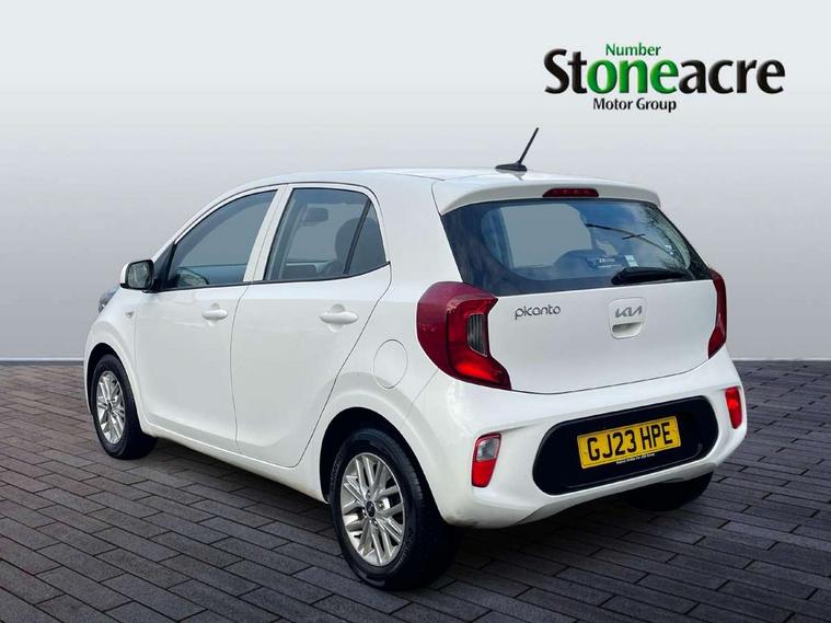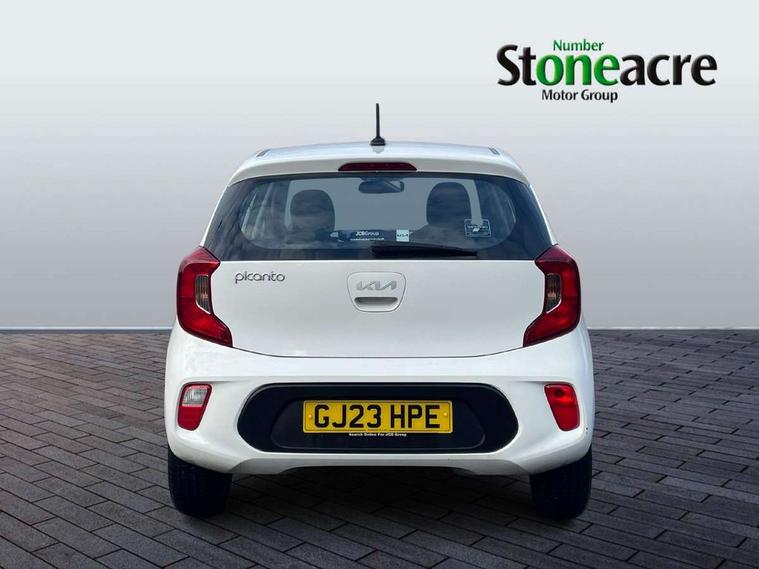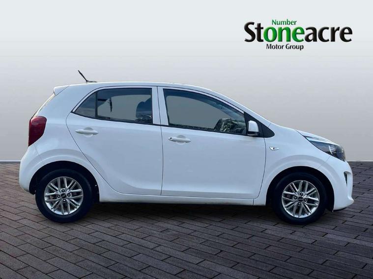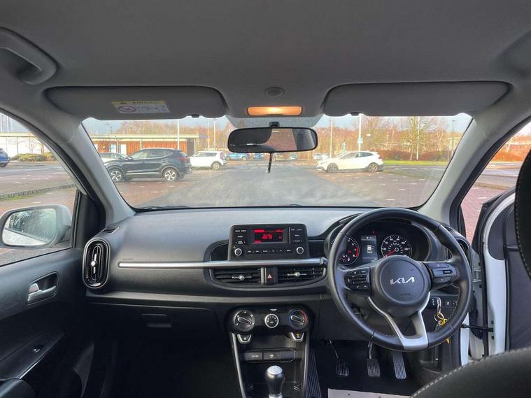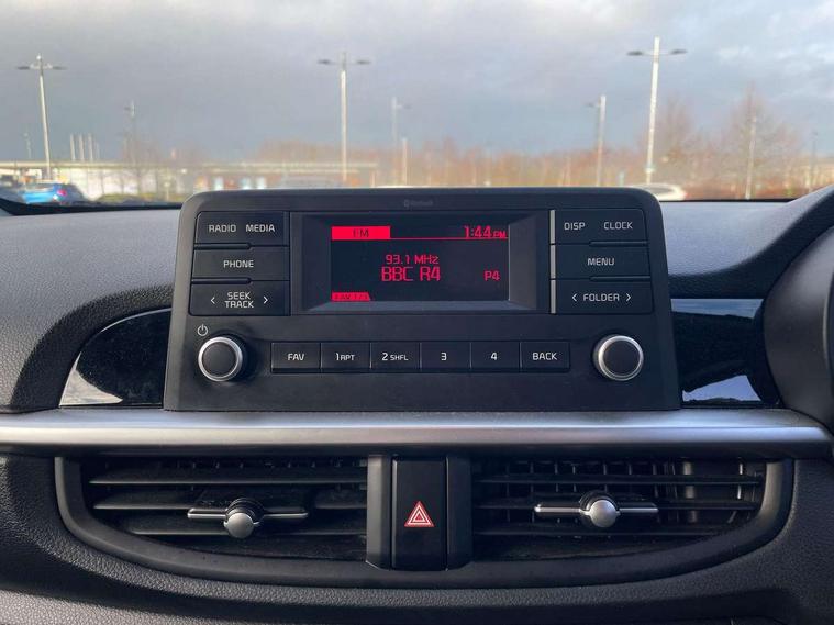 3.8" monochrome audio display with RDS and DAB, Emergency call service, Emergency stop signalling system, External temperature gauge, Motor driven power steering, Tachometer, Tailgate, Trip computer, 4 speaker audio system, Bluetooth with music streaming, Steering wheel mounted controls, USB ports for connection of a media device, Automatic headlight control system, Black radiator grille with chrome surround, Body colour bumpers, Body colour mirrors and door handles, Day/night rear view mirror, Daytime running lights, Electric adjustable heated door mirrors, Front and rear electric windows with drivers's auto up/down function, Headlamp levelling, Heated rear window, High mount brake light, MFR - Multi Focus Reflector halogen headlights with black bezel, Rain sensor, Rear fog lights, Rear side wing doors, Rear wash/wipe, Speed variable front wipers, Tinted glass, Visible VIN plate, Welcome and follow-me home light functionality, 1 x rear coat hook, 12V power point front, 2 seat bench in 2nd row, 3 x passenger assist grips, 60/40 split/folding 2nd row of seats, All round height adjustable headrests, Cupholders in centre console, Driver and front passenger sunvisor with vanity mirror, Driver seat height adjust, Front cabin lights, Glovebox, High gloss lower centre fascia trim, door armrest and air vents, ISOFIX Child seat top tethers and anchor fixings, Leather trimmed steering wheel and gearshift, Luggage area light, Luggage area parcel shelf, Manual air conditioning, Passenger front seatback pockets, Premium cloth upholstery, Silver paint finished interior door handles, Single front passenger seat, Slide/reclining front seats, Tilt adjustable steering wheel, Advanced Driver Assistance Pack - Picanto, 2 x 3-point rear seatbelts, ABS/EBD, Automatic unlocking of doors in case of impact, Dual front airbags, ESC + BAS + VSM + HAC, Front passenger airbag cut-off switch, Front seatbelt height adjusters, Front seatbelt pretensioners + load limiters, Hill hold control, Knee airbags, Rear child proof door locks, Seatbelt warning, Side impact protection, Torque vectoring brake based and straight line stability (SLS), Traction control, Twin curtain airbags, Twin front side airbags, Tyre pressure monitoring system, Anti theft alarm, Engine immobiliser, Folding key, Locking wheel nuts, Remote central door locking, 14" alloy wheels, Tyre mobility kit,
