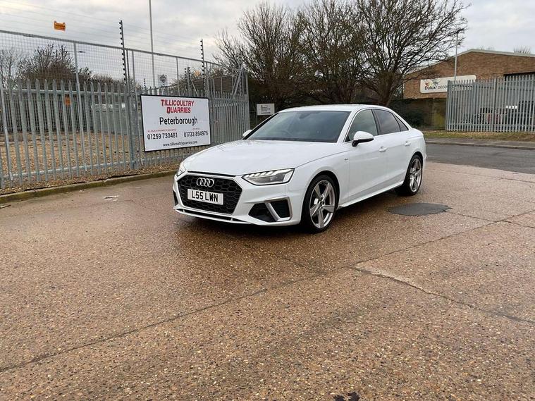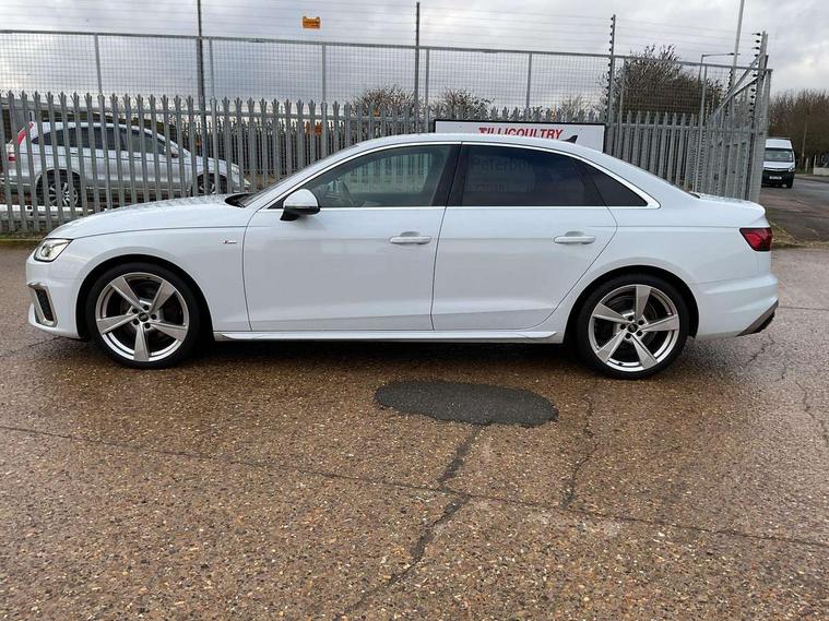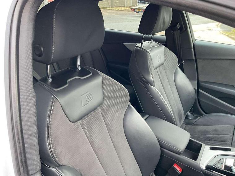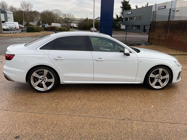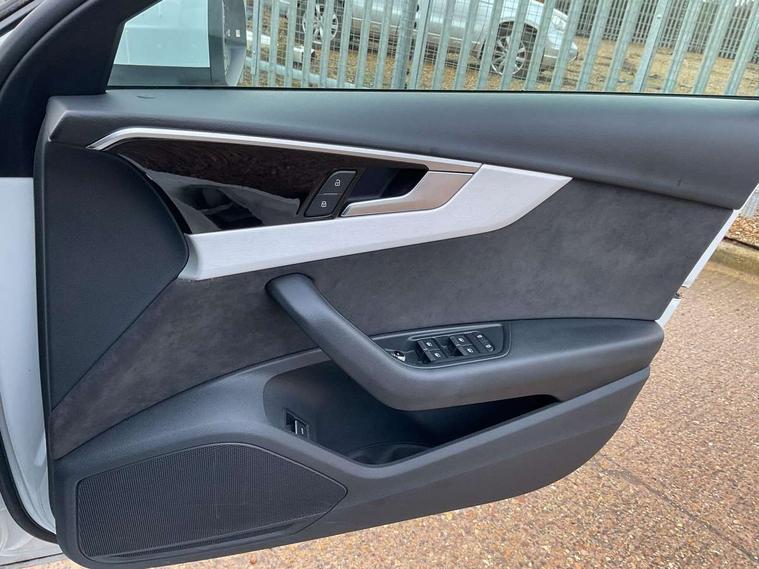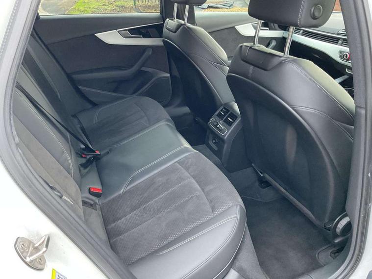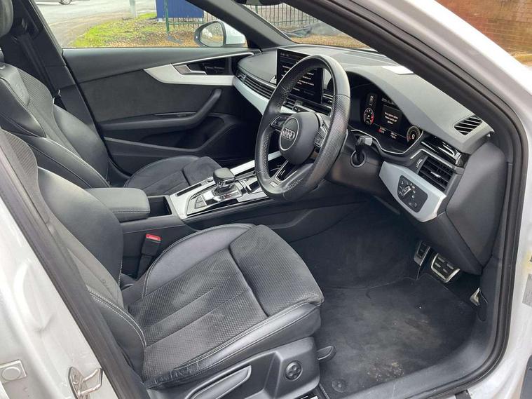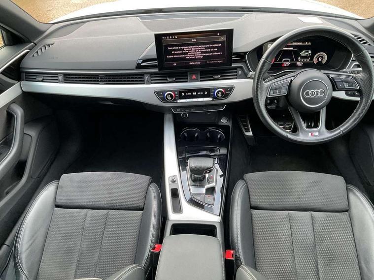 Audi connect safety and service (e-call), Audi connect with Amazon Alexa Integration, Audi drive select, Audi parking system plus with front and rear sensors, Audi smartphone interface, Audi virtual cockpit, Automatic start-stop system with coasting functionality and efficiency programme, Bluetooth interface, Electric boot lid release, Electromechanical power steering, Email, calendar and text messages displayed via MMI, MMI Navigation plus with MMI touch includes 10.1" high resolution colour MMI display, 3D map, Rear view camera, Voice control system, Sports suspension lowered by 23mm, 2 USB charging ports, 8 passive loudspeakers, DAB digital radio reception, Auto dimming rear view mirror, Body colour door handles, Body colour front spoiler lip, Body colour side sill trim, Body coloured door mirrors, Electrically folding auto dimming/adjustable/heated door mirrors with LED side indicators and kerb view function for passenger side, Grained matt black side air inlets with matt aluminium silver inlay, High beam assistant, Honeycomb structure radiator grille in grained matt black, LED headlights with LED rear lights + dynamic rear indicators + headlight adjustment and high beam, turning light + LED daytime running lights, Matt aluminium silver tailpipe trim, Privacy glass, Rain and light sensors, S Line badges on the front wings, S line front and rear bumpers with side skirts, S Line rear diffuser in matt titanium black with trim strip in matt aluminium silver, Windscreen with acoustic glazing, 4 way electric lumbar support for driver and front passenger, 40/20/40 split folding 3 rear seat bench in 3 parts with rear centre armrest, Black cloth headlining, Black perforated leather gearknob, Contrast stitching on seats, steering wheel and gear lever gaiter, Deluxe 3 zone electronic climate control, Door sill trims with aluminium inlay, Front and rear head restraints, Front centre armrest, Heated front seats, Illuminated door sill trims with S logo, ISOFIX child seat mounting and top tether, Manual seat adjustment, Stainless steel pedals and foot rest, High gloss package - A4, LED Interior light pack - A4/S4, 3 rear seatbelts, 6 airbags - Driver, front passenger, curtain and side windows, Electronic Stabilisation Control (ESC) including ABS, ASR and EDL, Hill hold assist, Multi collision brake assist, Pop-up bonnet for pedestrian protection, Pre sense city, Seatbelt monitoring, Warning triangle and first aid kit, Anti theft alarm, Anti theft wheel bolts, Keyless Go, Matt brushed aluminium inlays, Tool kit, Tyre repair kit,