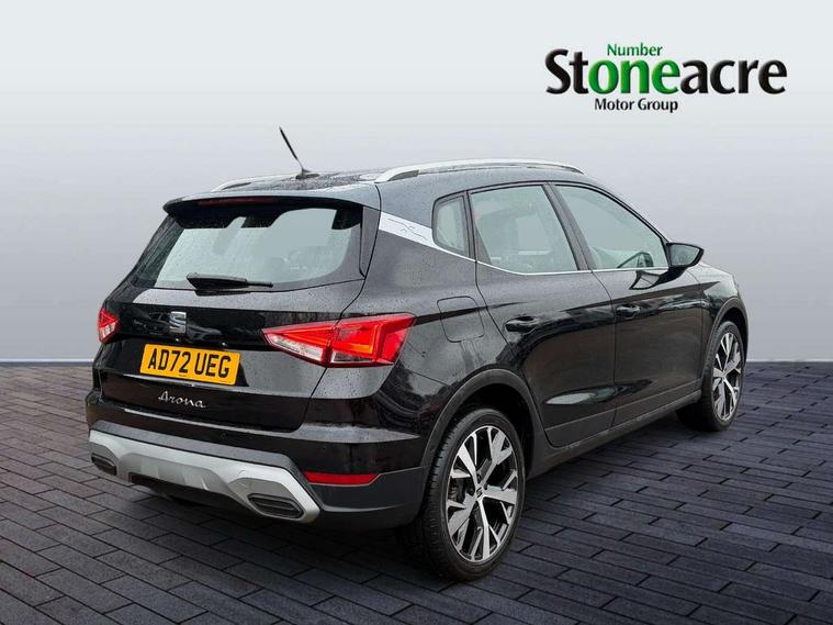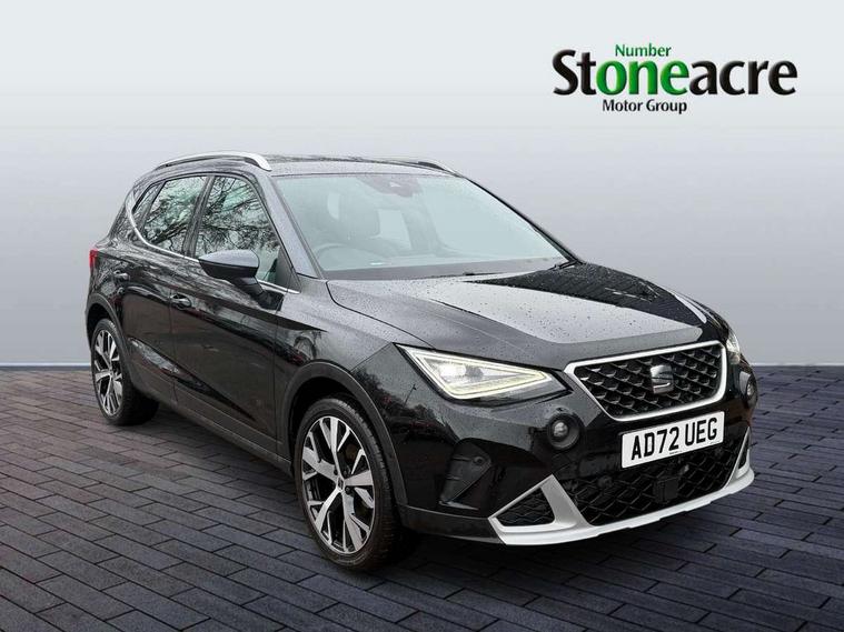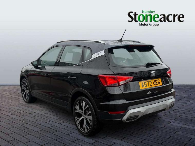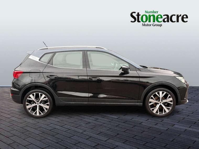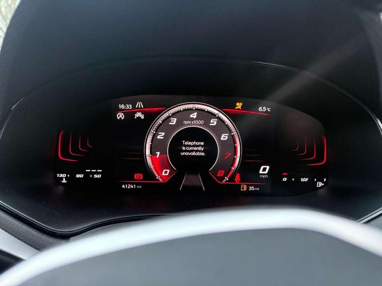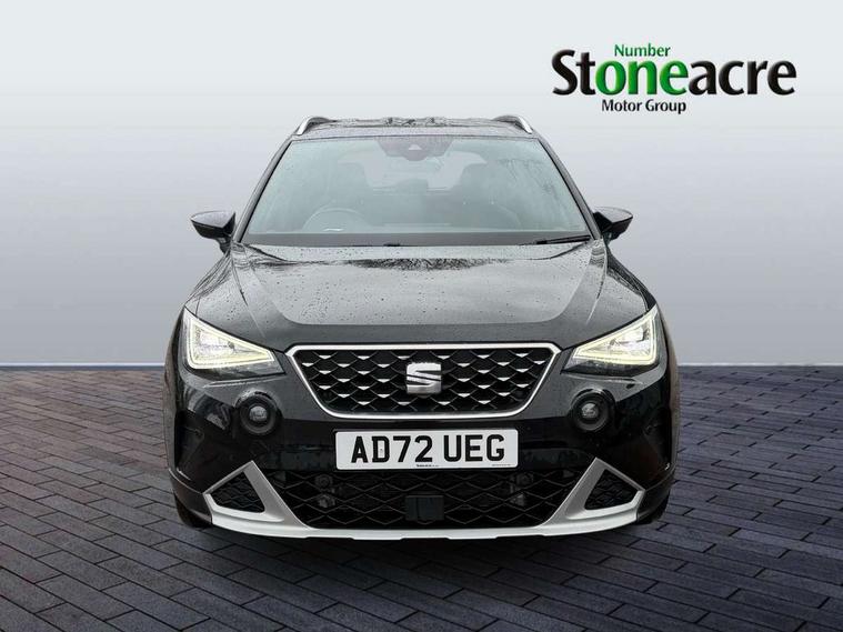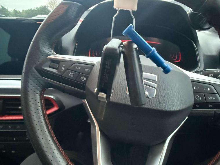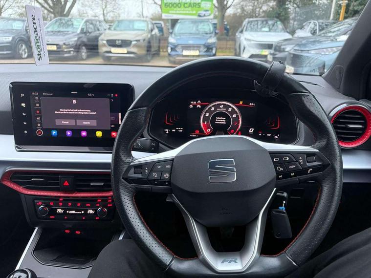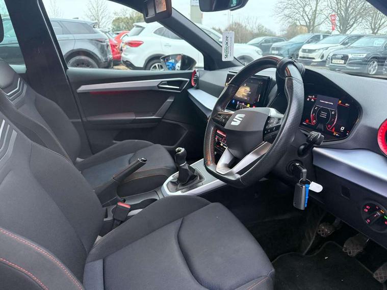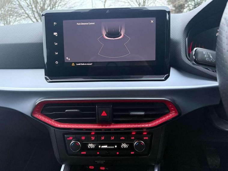 'Lights On' Reminder warning buzzer, 8" Digital cockpit, Digital clock, E-call, Electric speed sensitive power steering, Full Link Smartphone Integration with Mirror Link, Apple Car Play, Google Android Auto with USB Type C cable for Apple and Android compatibility, Lane keeping system, Low fuel warning light, Outside temperature display, Rear parking sensor, RPM counter, Seat connect with safety, service, remote and online, SEAT Drive profile - Four different models normal-sport-eco-individual, steering response, throttle response, Trip computer, Wireless phone charger, 9.2" colour touchscreen with navigation system, voice control and USB port (type c), Bluetooth interface for hands free and audio streaming, DAB digital radio and AM/FM radio, Steering wheel mounted audio controls, Anti theft roof antenna, Auto dimming interior rear view mirror, Automatic activation of hazard warning lights, Body coloured bumpers, Body coloured door handle inserts, Chrome roof rails and window surrounds, Dark tinted rear windows, Electric front/rear windows, Electrically adjustable, heated and folding door mirrors, Front fog lights with cornering function and rear fog light, FULL LED automatic headlights with dynamic headlight range control, coming and leaving home, LED daytime running lights, LED rear tail lights and licence plate lights, Protective side mouldings, Rain sensing wipers, Rear side wing doors, Rear spoiler, Rear window wash/wipe, Roof colour door mirrors, Third brake light, Twin exhaust pipe styling hidden exhaust pipe, Visible VIN plate, Windshield wiper with intermittent control and potentiometer, 2 cupholders, 3 seat bench in 2nd row, 60/40 split folding rear seat, Aircare filter, Black interior roof, Cloth upholstery, Double boot floor, Driver sunvisor with covered mirror + card holder, Dual zone climate control, Front courtesy light with front reading lights, Front sport seats, Gear shift indicator, Height adjustable front seats, Height/reach adjustable steering column, Illuminated boot, Instrument lighting with brightness control, Interior ambient lighting, Interior light in footwell, central console and door panel, ISOFIX points in outer rear seats with top tether anchorage points, Passenger sunvisor with vanity mirror, Perforated flat bottomed leather steering wheel/gear knob/handbrake with red stitching and FR logo, Single front passenger seat, Two front and three rear height adjustable headrests, Interior chrome pack - Arona, 3 point seatbelts on all rear seats, ABS, Active front headrests, Child locks on rear doors, Driver and front passenger airbags with front passenger airbag de activation, front side and curtain airbags, Electronic stability control, Emergency Brake Assist (EBA) and front assist, Front and rear seatbelt reminder, Hill hold control, Multi-Collision braking, Tiredness recognition system, Traction control, Tyre pressure monitoring system, Alarm with back-up horn, Electronic engine immobiliser, Locking wheel bolts, Remote central locking + deadlocks, Tow away protection, Titan black dashboard, 17" Dynamic alloy wheels,