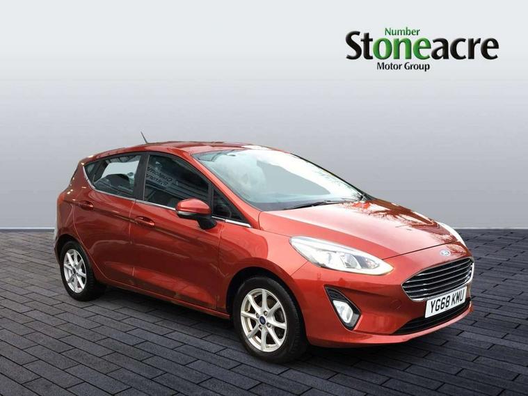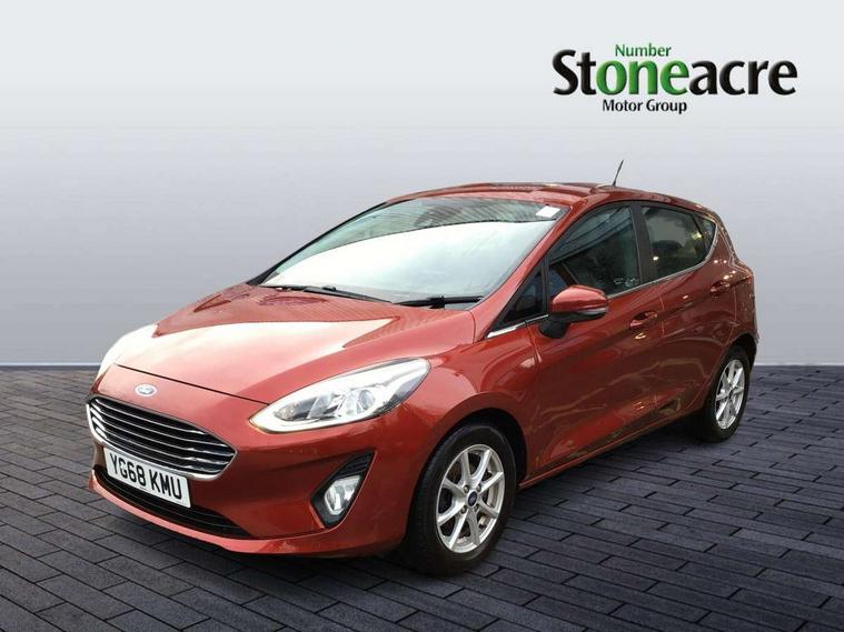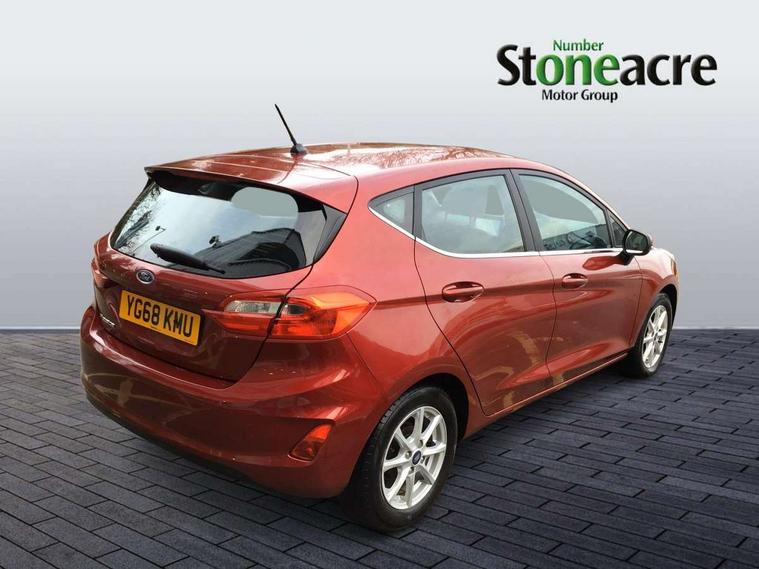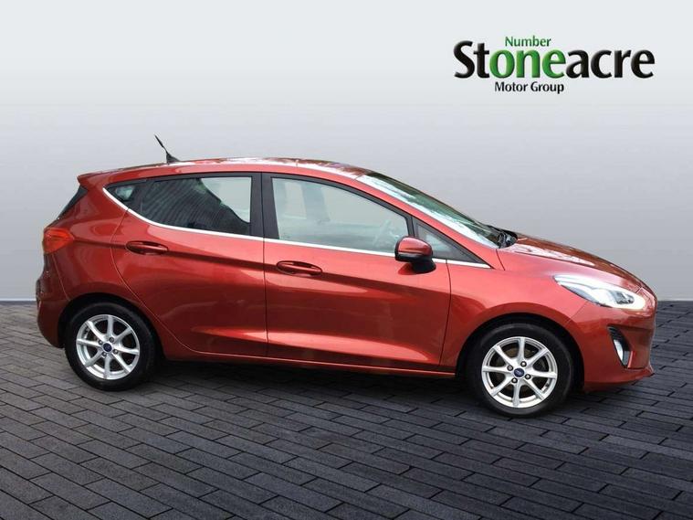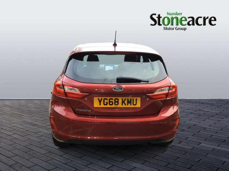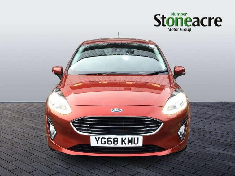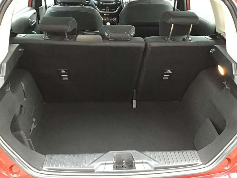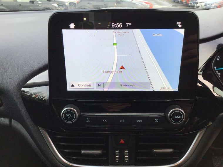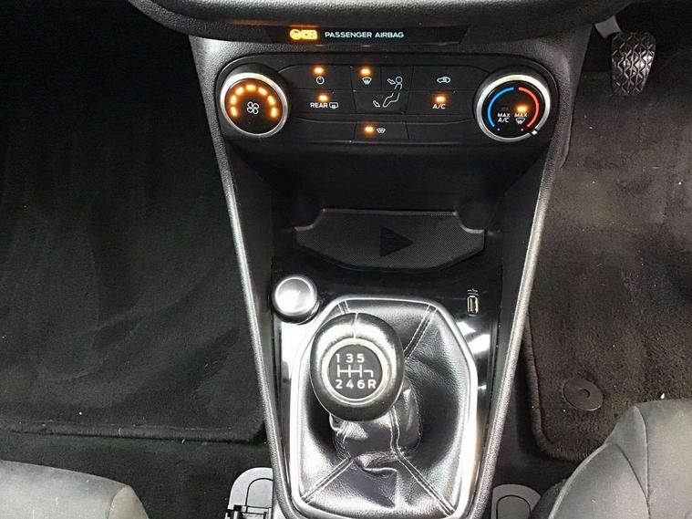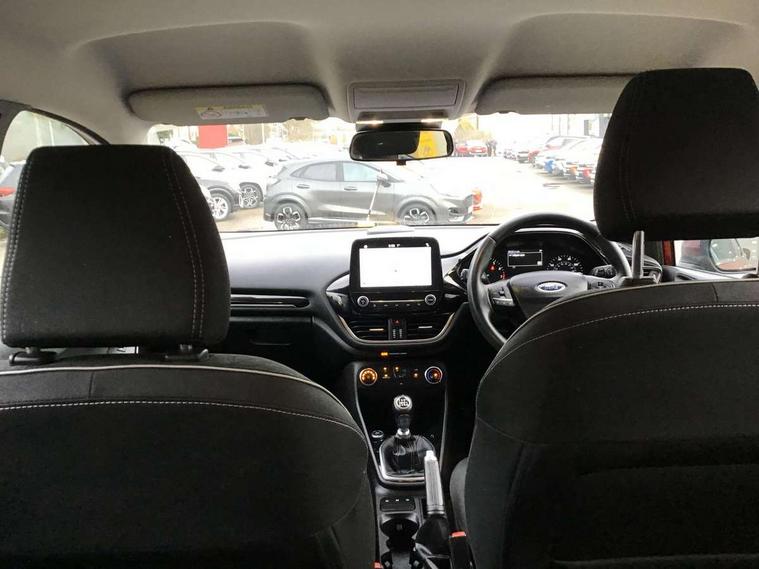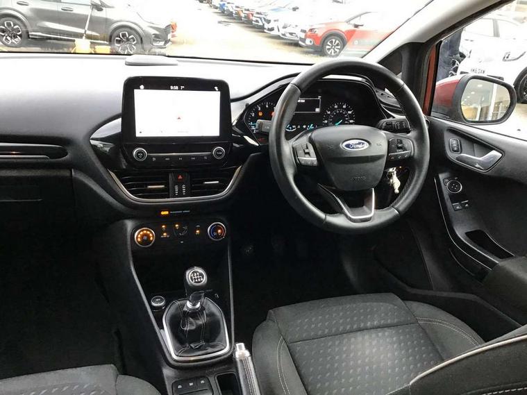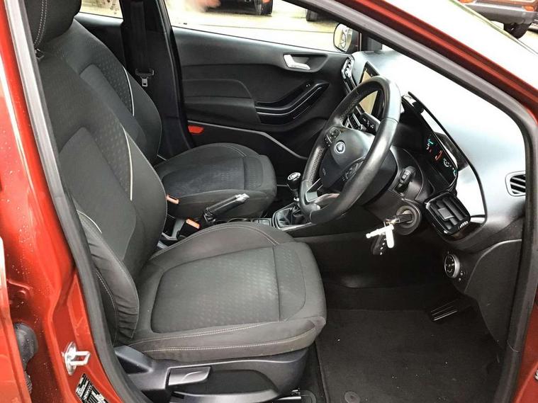 Bluetooth system, Electric power steering, Ford easy fuel, Trip computer, Auxiliary input socket, Steering wheel mounted controls, USB connection, Automatic headlights, Body colour bumpers, Body colour door handles, Body colour electric adjustable heated door mirrors with integral indicators, Body colour rear spoiler, Chrome beltline trim, Cornering front fog lights, Electric front windows/one touch facility, Halogen projector style headlights with static cornering lights + LED daytime running lights, Quickclear heated windscreen, Rear wiper, Tinted glass, Upper front grille chrome surround, 12V Accessory socket in centre console, 3 spoke leather trimmed steering wheel with audio control, 60/40 split folding rear seat, Adjustable head restraints, Boot carpet, Chrome inner door handles, Cloth upholstery, Footwell illumination, Front map reading lights, Front seat and rear pockets, Height adjustable driver's seat, Illuminated glovebox, Leather gear knob, Leather trimmed handbrake handle, Load area light, Luxury woven headliner, Manual air conditioning, Overhead console with sunglasses holder, Pollen filter, Rake/reach adjustable steering wheel, Rear centre head restraint, NCAP Pack - Fiesta, 3 point seatbelts on all rear seats, ABS+EBA, Curtain airbags, Driver and passenger airbags, Drivers knee airbag, Electronic stability control with hill start assist, Front passenger airbag deactivation, Front side airbags, Seatbelt warning, Tyre pressure monitoring system, MyKey system, Remote central locking & engine immobiliser, Thatcham Cat.1 alarm,