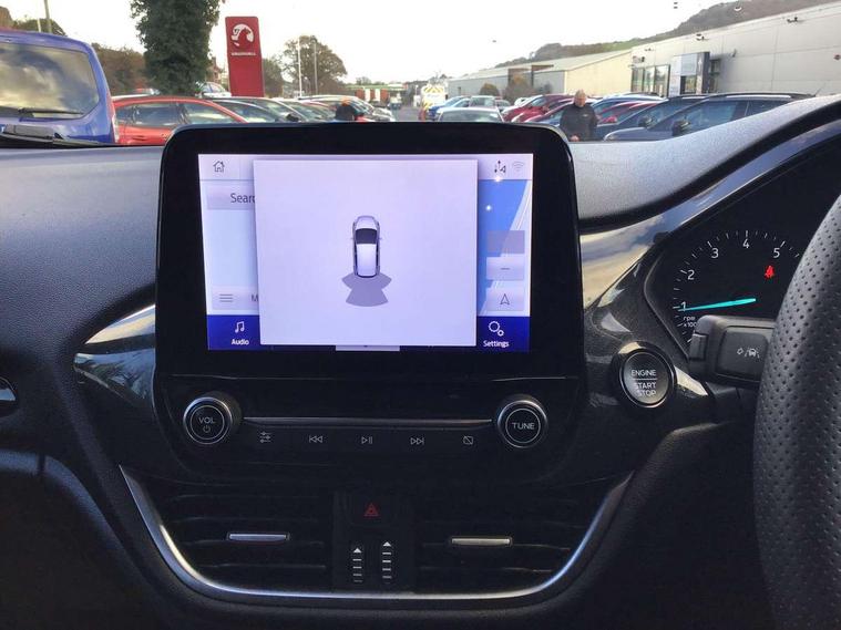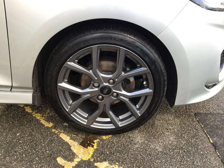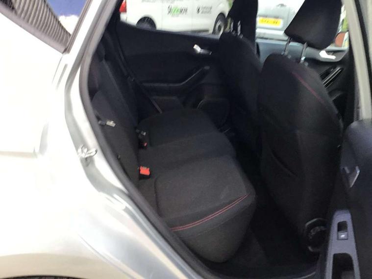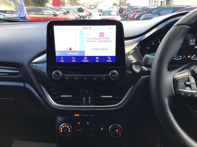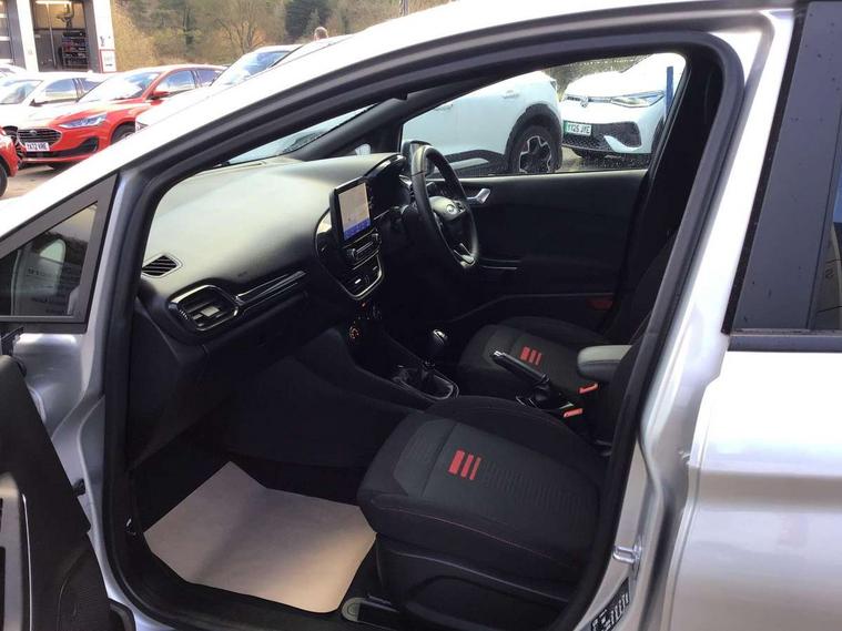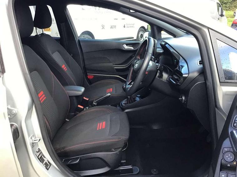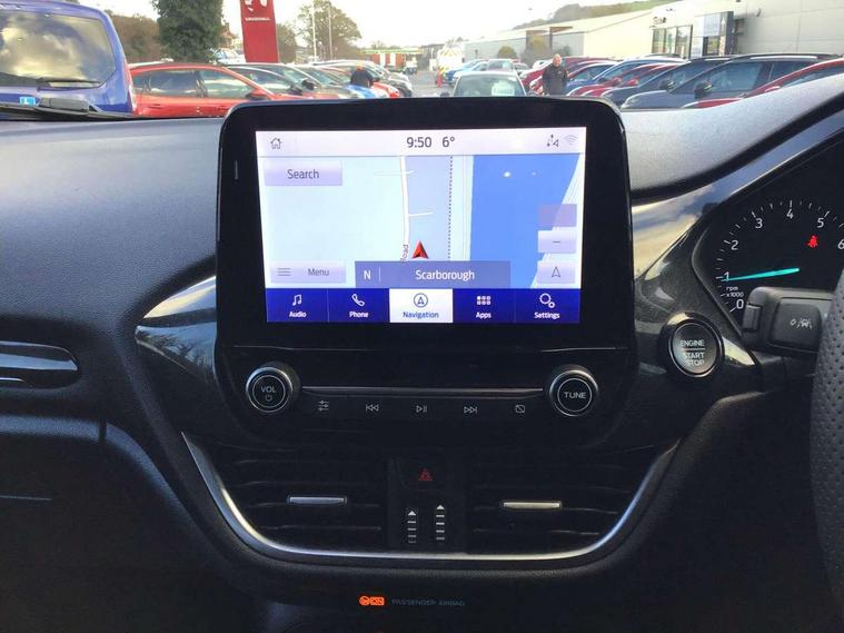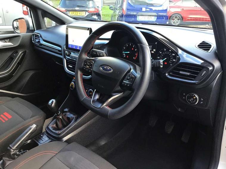 Bluetooth system, Electric power steering, Ford easy fuel, Ford SYNC 3 Navigation system incl 8" touchscreen, 7 speakers, FordPass connect, Apple carplay, android auto, voice control and emergency assistance, Rear parking distance sensors, Selectable drive modes (Normal, Sport, Track), Trip computer, Sports suspension, 2 USB ports, Auxiliary input socket, DAB Digital radio, Steering wheel mounted controls, Body colour bumpers, Body colour door handles, Body colour large rear spoiler, Body coloured electrically operated and heated door mirrors with side indicators, Cornering front fog lights, Electric front windows/one touch facility, Electric rear windows, LED Night signature to rear lights, Quickclear heated windscreen, Rain sensing wipers and auto dimming rear view mirror, Rear privacy glass, Rear wiper, Unique ST-Line upper grille & full bodystyling kit with ST-Line wing badges, 3 spoke flat bottomed leather steering wheel, 60/40 split folding rear seat, Adjustable head restraints, Black headlining, Boot carpet, Centre console with opening armrest, 2x cupholders, 12v and USB, Chrome inner door handles, Cloth upholstery, Footwell illumination, Front floor mats in velour, Front map reading lights, Front seat and rear pockets, Illuminated glovebox, Leather gaiter, Load area light, Manual 2 way passenger seat adjust, Manual 4-way driver seat adjust, Manual air conditioning, Overhead console with sunglasses holder, Pollen filter, Rake/reach adjustable steering wheel, Sensico wrapped steering wheel, Sports front seats, NCAP Pack - Fiesta, 3 point seatbelts on all rear seats, ABS+EBA, Curtain airbags, Driver and passenger airbags, Drivers knee airbag, Electronic stability control with hill start assist, Front passenger airbag deactivation, Front side airbags, Seatbelt warning, Two tone horn, Tyre pressure monitoring system, Keyless start with 'Ford Power' starter button, MyKey system, Remote central locking & engine immobiliser, Thatcham Cat.1 alarm, 17" 5 spoke alloy wheels with rock metallic finish,