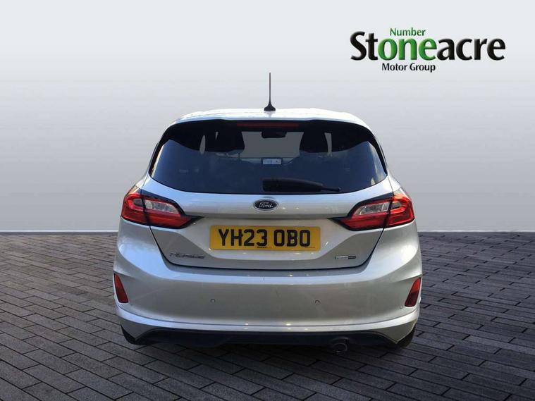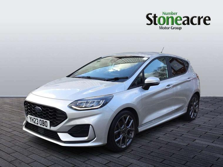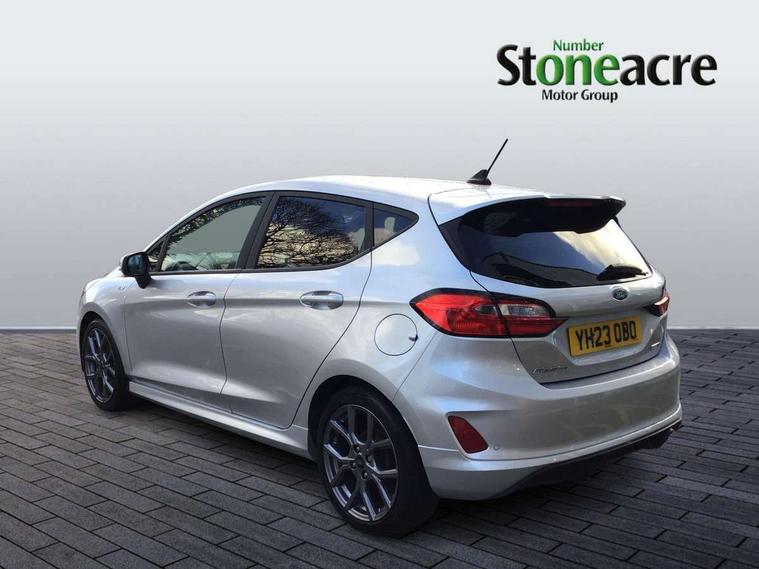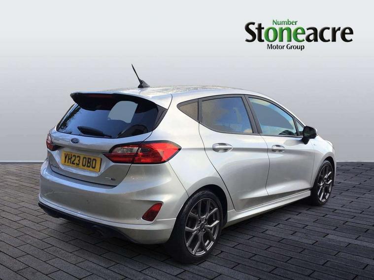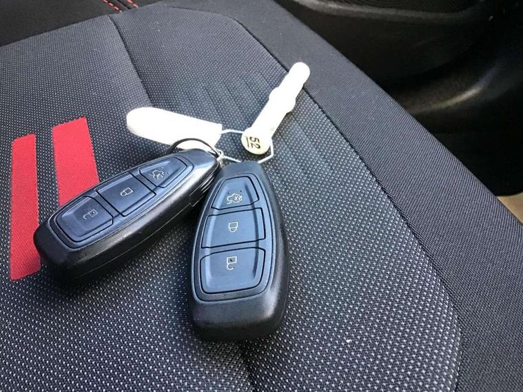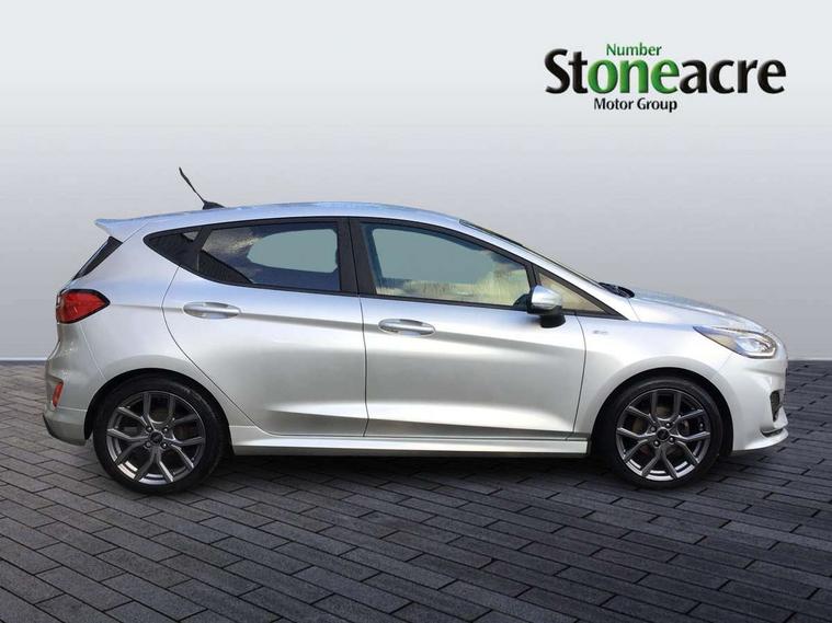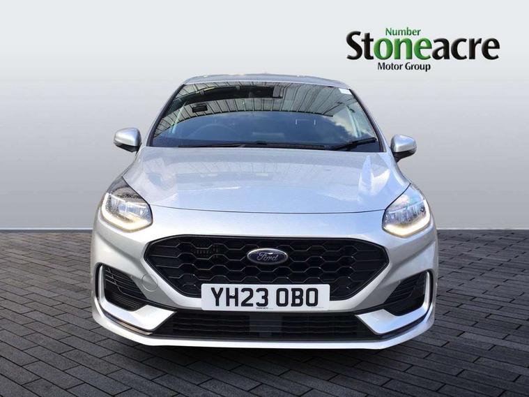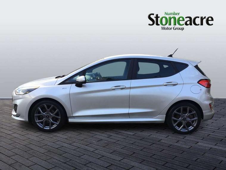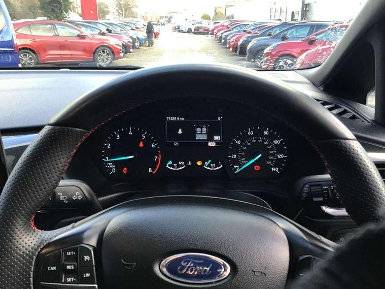 Bluetooth system, Electric power steering, Ford easy fuel, Ford SYNC 3 Navigation system incl 8" touchscreen, 7 speakers, FordPass connect, Apple carplay, android auto, voice control and emergency assistance, Rear parking distance sensors, Selectable drive modes (Normal, Sport, Track), Trip computer, Sports suspension, 2 USB ports, Auxiliary input socket, DAB Digital radio, Steering wheel mounted controls, Body colour bumpers, Body colour door handles, Body colour large rear spoiler, Body coloured electrically operated and heated door mirrors with side indicators, Cornering front fog lights, Electric front windows/one touch facility, Electric rear windows, LED Night signature to rear lights, Quickclear heated windscreen, Rain sensing wipers and auto dimming rear view mirror, Rear privacy glass, Rear wiper, Unique ST-Line upper grille & full bodystyling kit with ST-Line wing badges, 3 spoke flat bottomed leather steering wheel, 60/40 split folding rear seat, Adjustable head restraints, Black headlining, Boot carpet, Centre console with opening armrest, 2x cupholders, 12v and USB, Chrome inner door handles, Cloth upholstery, Footwell illumination, Front floor mats in velour, Front map reading lights, Front seat and rear pockets, Illuminated glovebox, Leather gaiter, Load area light, Manual 2 way passenger seat adjust, Manual 4-way driver seat adjust, Manual air conditioning, Overhead console with sunglasses holder, Pollen filter, Rake/reach adjustable steering wheel, Sensico wrapped steering wheel, Sports front seats, NCAP Pack - Fiesta, 3 point seatbelts on all rear seats, ABS+EBA, Curtain airbags, Driver and passenger airbags, Drivers knee airbag, Electronic stability control with hill start assist, Front passenger airbag deactivation, Front side airbags, Seatbelt warning, Two tone horn, Tyre pressure monitoring system, Keyless start with 'Ford Power' starter button, MyKey system, Remote central locking & engine immobiliser, Thatcham Cat.1 alarm, 17" 5 spoke alloy wheels with rock metallic finish,