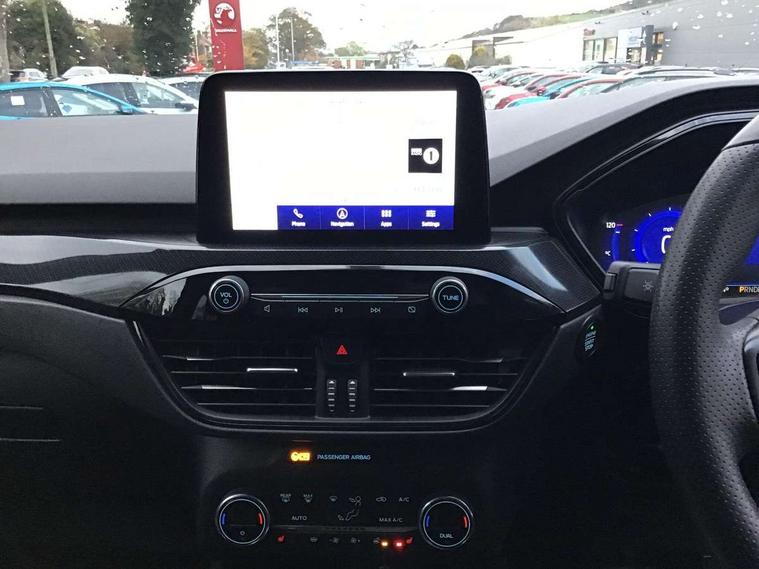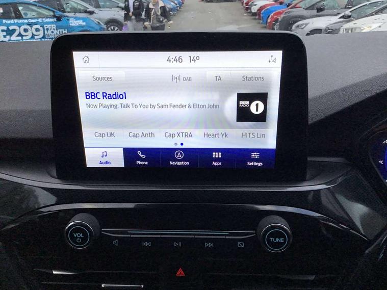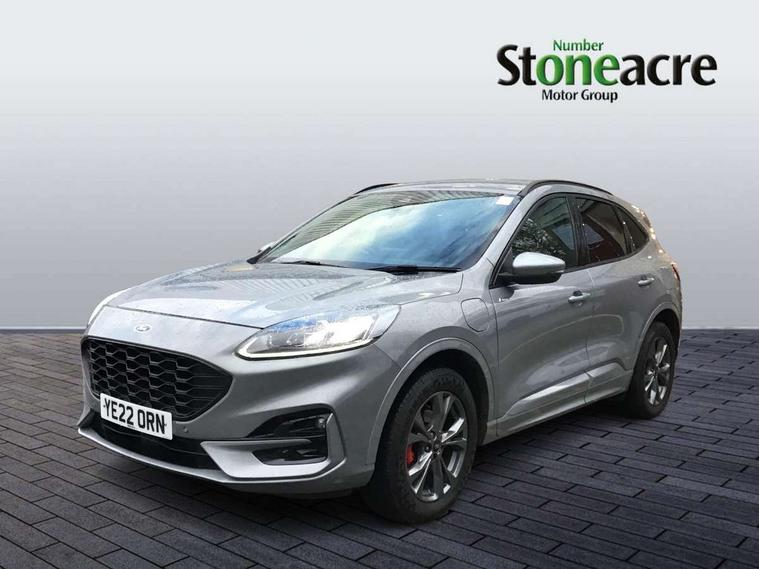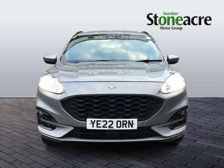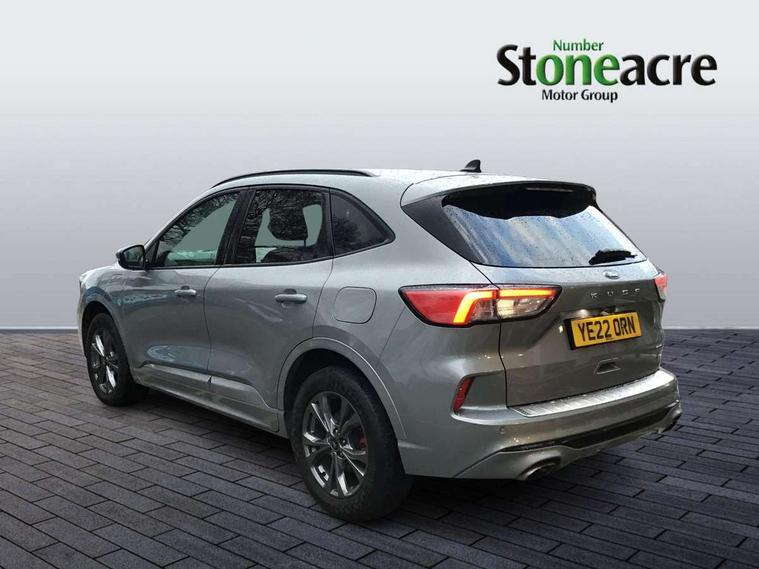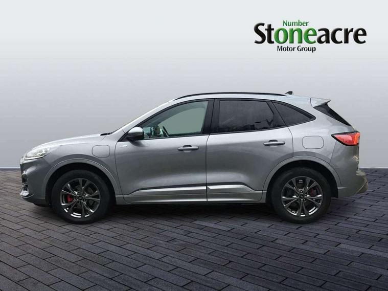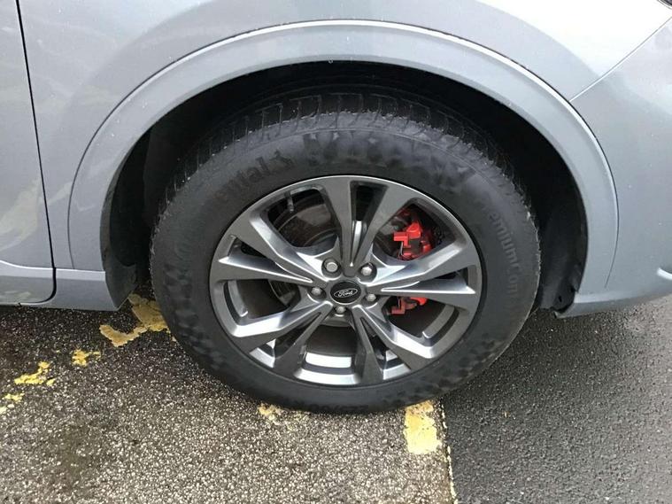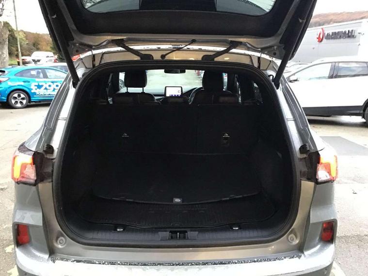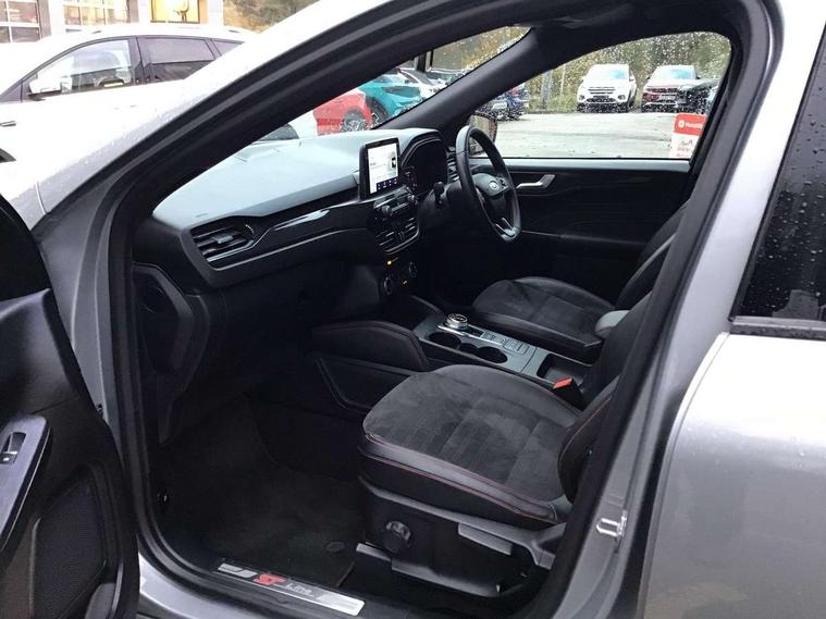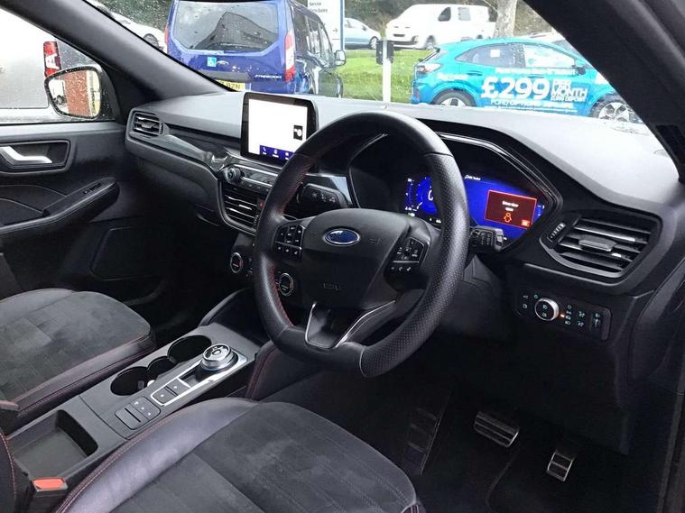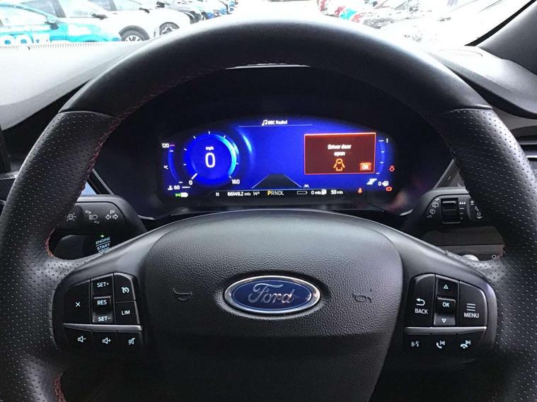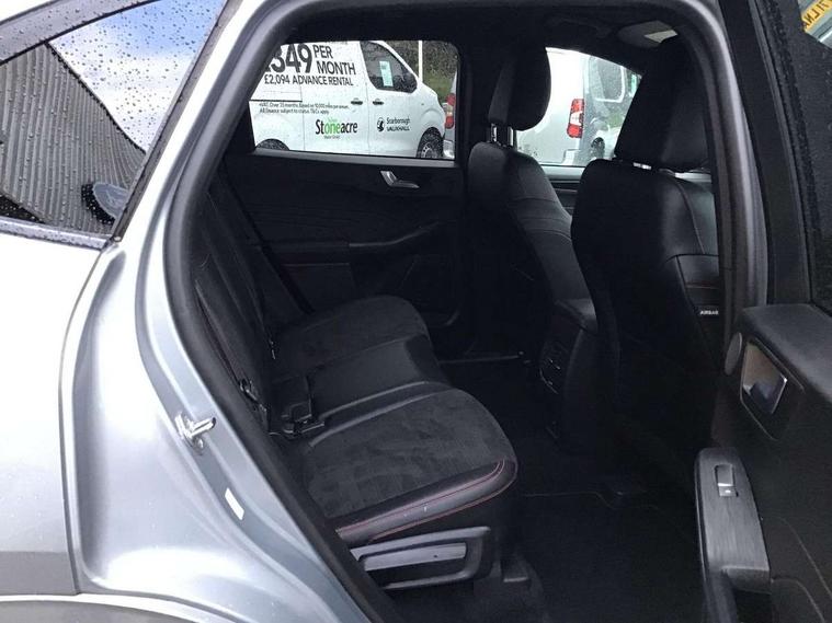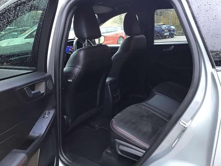 Driver impairment monitor, Ford easy fuel, Ford SYNC 3 with 8" colour touchscreen, App Link, andriod auto/apple carPlay and navigation with Ford pass connect, Front and rear parking sensors, Intelligent speed assist, Lane keeping aid with lane departure warning, Mobile phone wireless charging pad, Power assist steering, Selectable drive modes, 3-Pin 230V Domestic socket home charging cable, Sports suspension, Ford DAB audio system with 6 speakers, Auto dimming rear view mirror, Auto headlamps with high and low beam, Auto wipers, Black roof rails, Front LED fog lights with cornering function, Full LED headlamps, Large rear spoiler, LED daytime running lights, LED rear lights, Power folding heated door mirrors with puddle lights, Power front/rear windows with global close, Privacy glass, Quickclear heated windscreen, ST Line body styling kit with unique front and rear fascia and bumper, rear painted diffuser, front painted skid plates, dark mesh upper grille, ST Line front scuff plates, Twin exhausts, 2nd row sliding seats, 8 way manual passenger seat including lumbar support and height adjust, Alloy pedals, Ambient lighting, Centre console with electronic parking brake, Dark headlining and pillars, Dual electronic automatic temperature control, Flat bottomed leather steering wheel in sensico with red stitching, Front and rear head restraints, Rear charging point, Sensico partial premium leather upholstery, Sports seats, ST Line front and rear floor mats, B&O with large instrument cluster pack - Kuga, 3x3 point rear seatbelts, Airbags - front driver/passenger, front and rear curtain, Drivers knee airbag, Electronic stability control (ESC) and ABS, Ford MyKey Gen 2 safety system, Post collision braking, Powered child proof rear door locks, Pre collision assist with autonomous emergency braking, Red brake calipers, Tyre pressure monitoring system, Engine immobiliser, Keyless entry, Keyless start with 'Ford Power' starter button, Locking wheel nuts, Remote powered central double locking doors, Thatcham category 1 alarm,
