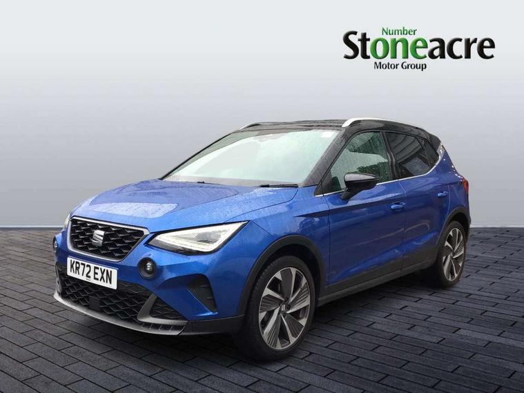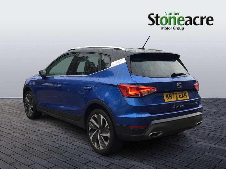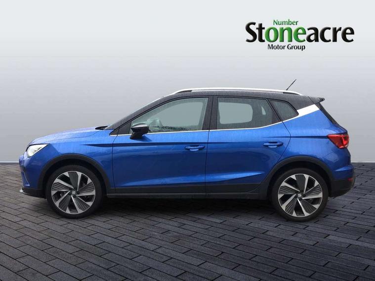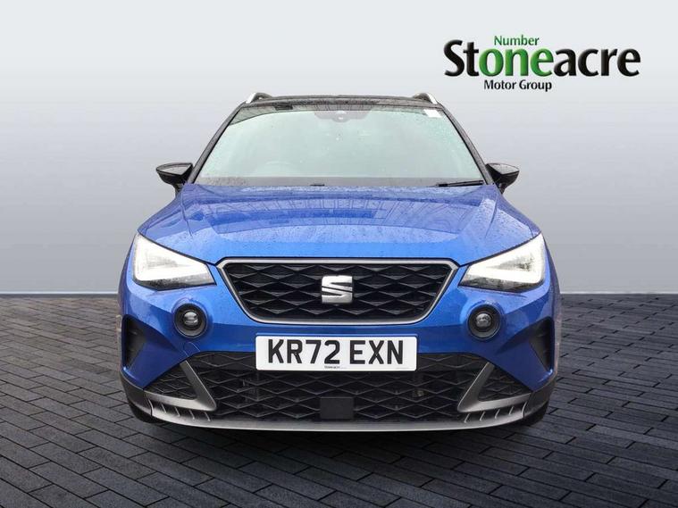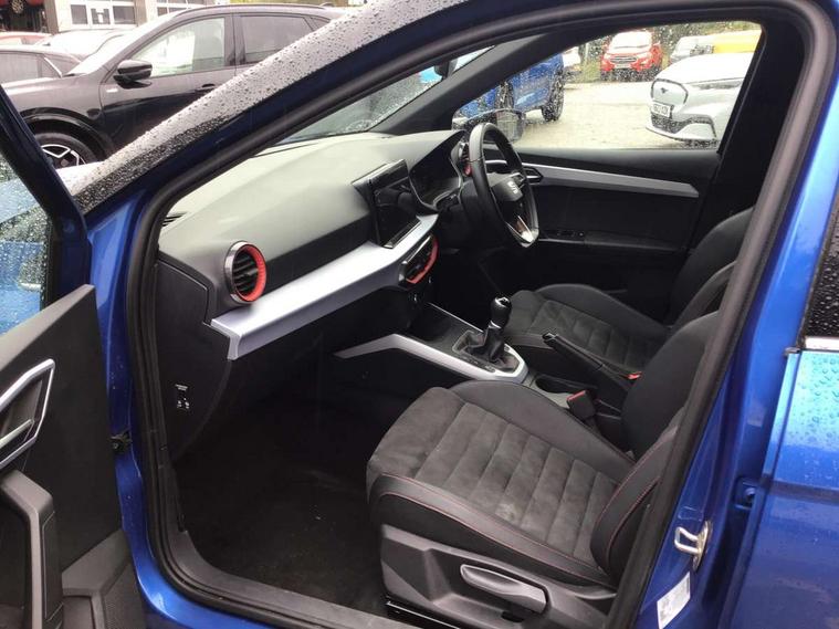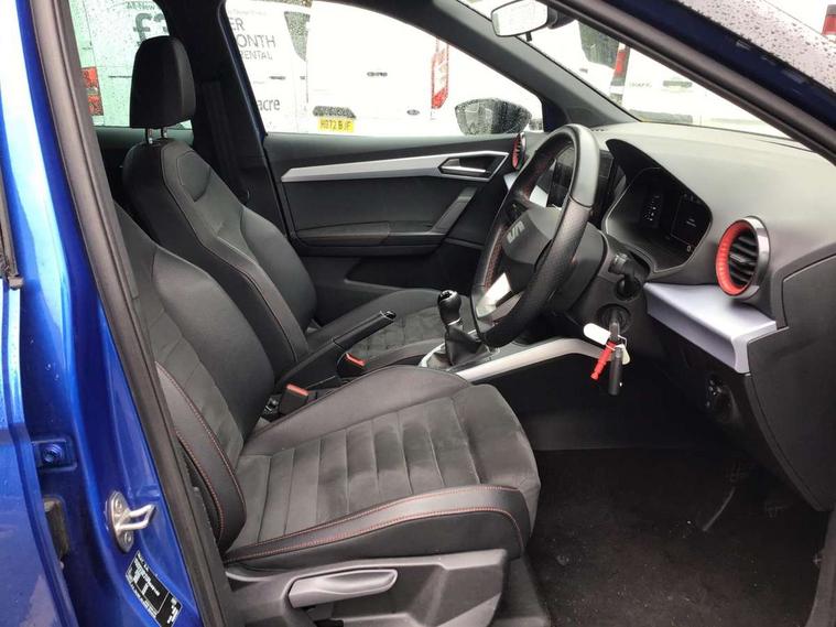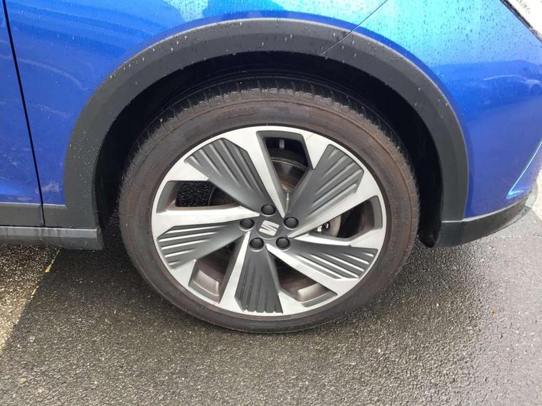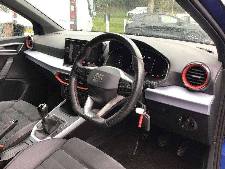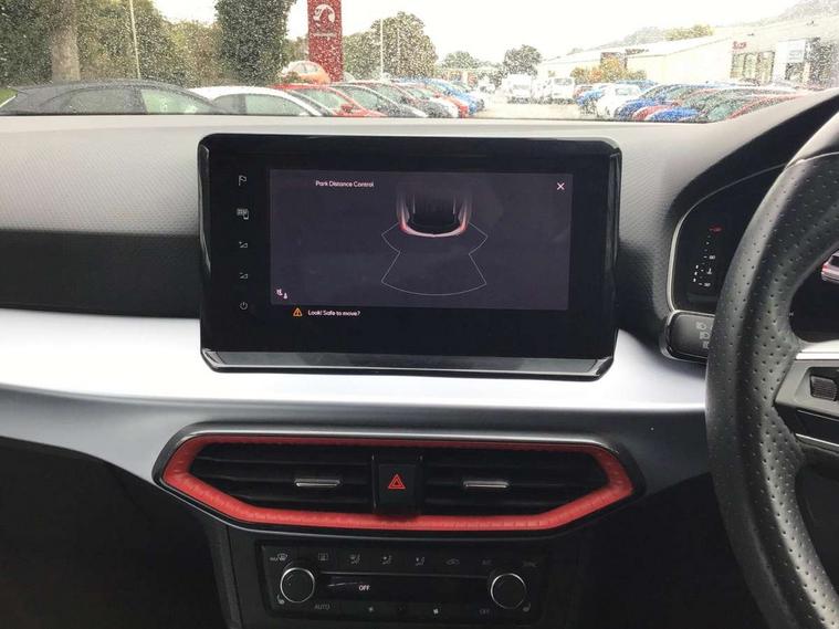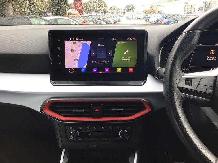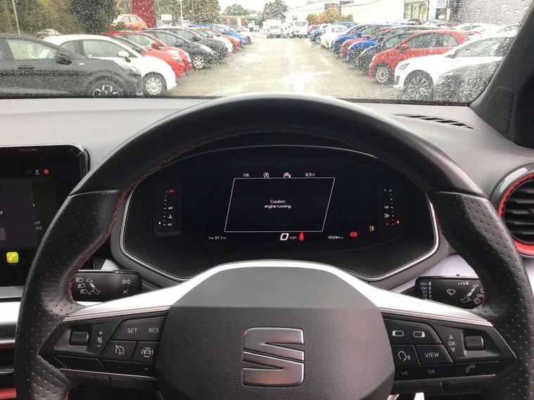 'Lights On' Reminder warning buzzer, 10" Digital cockpit, Digital clock, E-call, Electric speed sensitive power steering, Full Link Smartphone Integration with Mirror Link, Apple Car Play, Google Android Auto with USB Type C cable for Apple and Android compatibility, Low fuel warning light, Outside temperature display, Rear parking sensor, RPM counter, Seat connect with safety, service, remote and online, SEAT Drive profile - Four different models normal-sport-eco-individual, steering response, throttle response, Trip computer, Wireless phone charger, 9.2" colour touchscreen with navigation system, voice control and USB port (type c), Bluetooth interface for hands free and audio streaming, DAB digital radio and AM/FM radio, Steering wheel mounted audio controls, Anti theft roof antenna, Auto dimming interior rear view mirror, Automatic activation of hazard warning lights, Body coloured bumpers, Body coloured door handle inserts, Chrome roof rails and window surrounds, Dark tinted rear windows, Electric front/rear windows, Electrically adjustable, heated and folding door mirrors, Front fog lights with cornering function and rear fog light, FULL LED automatic headlights with dynamic headlight range control, coming and leaving home, LED daytime running lights, LED rear tail lights and licence plate lights, Protective side mouldings, Rain sensing wipers, Rear side wing doors, Rear spoiler, Rear window wash/wipe, Roof colour door mirrors, Third brake light, Twin exhaust pipe styling hidden exhaust pipe, Visible VIN plate, Windshield wiper with intermittent control and potentiometer, 2 cupholders, 3 seat bench in 2nd row, 60/40 split folding rear seat, Aircare filter, Black interior roof, Double boot floor, Driver sunvisor with covered mirror + card holder, Dual zone climate control, Front comfort seats, Front courtesy light with front and rear reading lights, Front seat back storage pockets, Gear shift indicator, Heated front seats, Height adjustable front seats, Height/reach adjustable steering column, Illuminated boot, Instrument lighting with brightness control, Interior ambient lighting, Interior light in footwell, central console and door panel, ISOFIX points in outer rear seats with top tether anchorage points, Microsuede cloth upholstery, Passenger sunvisor with vanity mirror, Perforated flat bottomed leather steering wheel/gear knob/handbrake with red stitching and FR logo, Single front passenger seat, Two front and three rear height adjustable headrests, Interior chrome pack - Arona, 3 point seatbelts on all rear seats, ABS, Active front headrests, Child locks on rear doors, Driver and front passenger airbags with front passenger airbag de activation, front side and curtain airbags, Electronic stability control, Emergency Brake Assist (EBA) and front assist, Front and rear seatbelt reminder, Hill hold control, Multi-Collision braking, Tiredness recognition system, Traction control, Tyre pressure monitoring system, Alarm with back-up horn, Electronic engine immobiliser, Locking wheel bolts, Remote central locking + deadlocks, Tow away protection, Titan black dashboard, 18" Performance Cosmo grey matt alloy wheels,