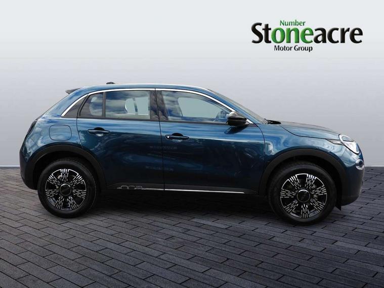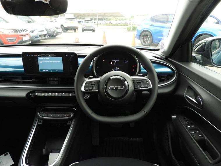 7" TFT digital cluster, Bluetooth connectivity, BSRF connectivity box, Connected services, Cruise control, Drowsy driver detection, Emergency E-call assist, Engine emission level default, GSR II step 1, Intelligent speed assist, Lane keeping assistant (LKA), Odometer, Power assist steering, Rain and dusk sensors, Rear parking sensors, Traffic sign recognition, Wireless apple car play/android Auto, Without drive mode selector, L2-AGM 12V battery, 1st Row USB type-A and USB type-C, 4 speaker audio system, Radio, Uconnect infotainment 10.25" touchscreen with DAB, All power windows express Up/Down, Auto dimming frameless rear view mirror, Automatic headlights, Body coloured door handles, Chrome day light openings, Electric adjustable door mirrors, Exterior chrome accents, Front and rear Chromed 600 logo, Gloss black finish B pillar, Gloss black shark fin antenna, Glossy black door mirrors, Heated windscreen wiper blade area, LED 3rd brake light, LED daytime running lights, LED Fog lamps with cornering function, LED front signature lighting, LED front turn indicators and position lights, LED rear lights, LED rear signature lighting, LED reflector headlamps, Matt black side skirts with 600 chromed logo, Rear bumper embossed 600 logo, Rear roof spoiler, Rear side wing doors, Rear wiper, 2 Spoke synthetic leather steering wheel with audio control, 3 rear headrests, 3 seat bench in 2nd row, 4 way manually adjustable passenger seat, 6 way manually adjustable drivers seat, Auxilliary 12V power socket, Body colour dashboard fascia, Chrome interior door handles, Dark metachrome dashboard ring, English handbook, Front centre armrest, Front headrests, Front passenger grab handle, Front seatback pockets, ISOFIX attachment on front passenger and rear passenger seats, Manual climate control, Metachrome central compartment bezel, Monogram fabric upholstery, Paddle shifts, Partial body cover for shipment, Predisposal for accessory upgrade to default tunnel pad cover (dedicated prnd bezel), Rear seat 40/60 split, Single front passenger seat, Smart 15L storage central tunnel with tunnel pad cover, Sunvisor label ciao Fiat, Sunvisors with vanity mirrors, 3x3 point rear seatbelts, 6 airbags, ABS, Autonomous Emergency Brake (AEB) & Vulnerable Road User (VRU) Protection, Child locks on rear doors, Electronic parking brake with auto hold, ESC (Electronic Stability Control), Front passenger airbag deactivation, Seatbelt reminder and pretensioners for all seats, Anti-theft volumetric alarm, Anti-theft wheel bolts, Keyless Go, 17" Diamond cut alloy wheels, Fix and go puncture repair kit,