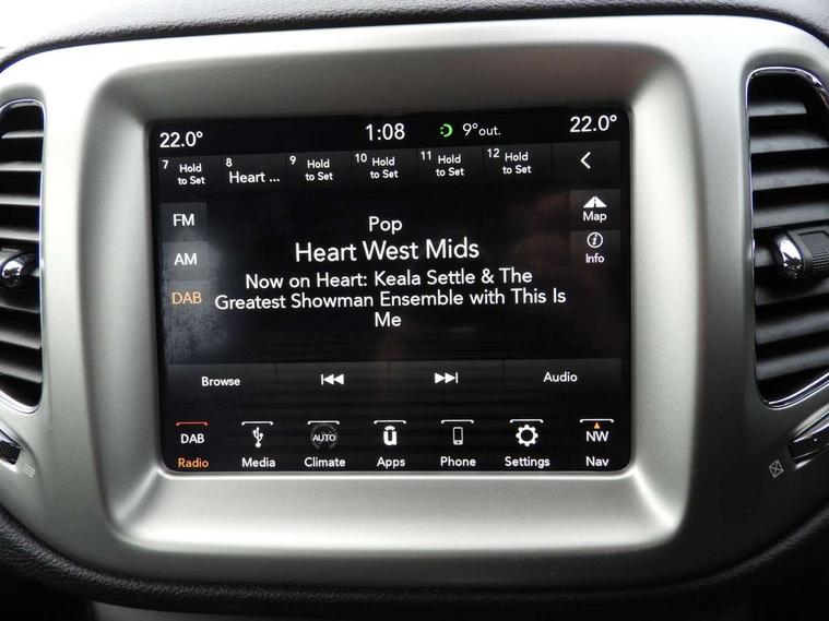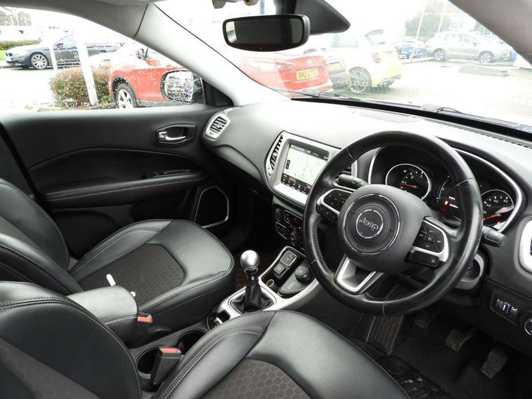 Active speed limiting device, Cruise control, Electric power steering, Forward collision warning plus with mitigation, Lane departure warning system, Media centre electronic storage, Rear view camera, Start/stop system, Temperature and compass gauge, U-Connect hands free phone, Uconnect media centre with 8.4" smart touch screen sat nav, radio CD/MP3, aux-in, hard drive and voice command, Vehicle information centre, Battery run - down protection, Electronic roll mitigation, European suspension, Selec Terrain system, 6 speakers, Bluetooth audio streaming, DAB Digital radio, Remote USB port, Steering wheel mounted audio controls, USB socket, Adaptive brake lights, Aspheric door mirrors, Auto dimming rear view mirror, Automatic headlights, Black and chrome front grille, Black fog light surrounds, Black roof rails, Body colour bumpers, Body colour door handles, Body colour door mirrors, Body colour steel roof, Chrome side mouldings, Chrome window surround, Daytime running lamp system, Diversity antenna, Door mirrors with indicators, Electric adjustable heated door mirrors, Electric folding door mirrors, Electric front windows, Electric rear windows, Front fog lights with cornering function, Front tow eye, Halogen reflector headlamps, Headlamp off time delay, Heated door mirrors, Heated rear window, LED rear lights, Lower body cladding - black, Rain sensitive windscreen wipers, Rear fog lamps, Rear window defroster, Rear window wash/wipe, Removable short mast antenna, Solar control glass, Trailer sway damping, Variable intermittent wiper, 12V power outlets, 12V power point in luggage area, 230V socket, 3 rear seat head restraints, 60/40 split folding rear seat, Advanced multicolour ambient light and LED interior light, Boot mat, Cargo area lights, Cargo compartment carpet, Cargo compartment cover, Cargo compartment organiser, Cargo tie down loops, Centre console with sliding armrest, Centre rear 3 point seat belt, Child seat anchorage points, Cloth/faux leather upholstery, Coat hooks, Driver seat height adjust, Driver sunvisor with illuminated mirror, Dual zone climate control, Electronic seatbelt pretensioners, Front head restraints, Front map lights, Front map reading lights, Front passenger seatbelt alert, Front seats back map pockets, Front sliding armrest with storage compartment, Full length centre console, Gear shift indicator, Height adjustable rear headrests, Illuminated door entry system, Illuminated front cupholders, Leather steering wheel, Lockable glovebox, Luggage cover, Overhead console, Passenger assist handles, Rear air conditioning and heater vents, Satin chrome gear knob, Tilt/telescopic steering column, Business pack - Compass, 3 rear 3 point seatbelts, 4 wheel disc brakes, ABS, Advanced brake assist, Child safety locks on rear door (inc. tailgate), Collision mitigation braking system, Driver / front passenger multi stage airbags, Drivers knee airbag, Dual note electric horns, Electronic parking brake, ESC - Electronic Stability Control + traction control, Front and rear curtain airbags, Front passenger airbag deactivation, Front side airbags, Height adjustable front seatbelts, Hill start assist, Passive pedestrian protection, Traction control, Tyre pressure monitoring display, Capless fuel filler, Immobiliser, Keyless entry and keyless start, Occupant detection system, Premium security alarm, Remote locking fuel filler flap, Speed sensitive power door locks, Front and rear air vents, 17" aluminium alloy wheels,