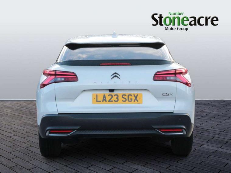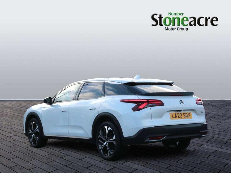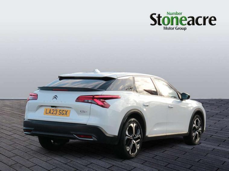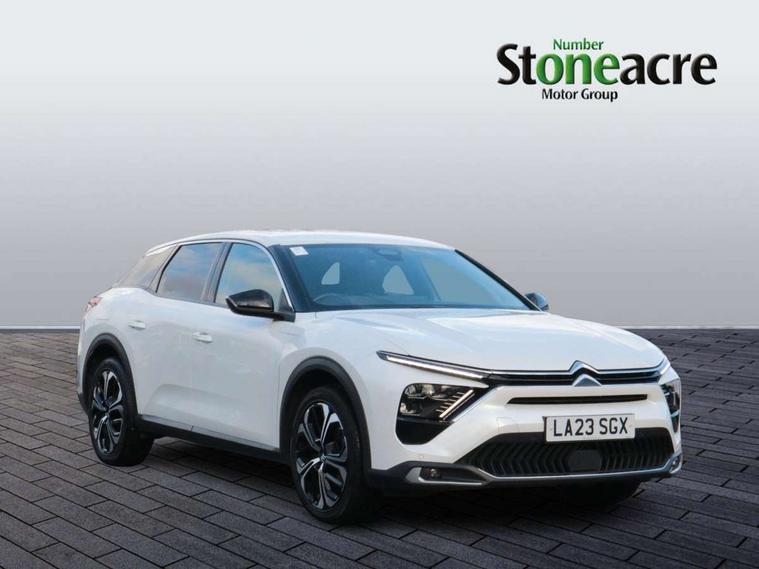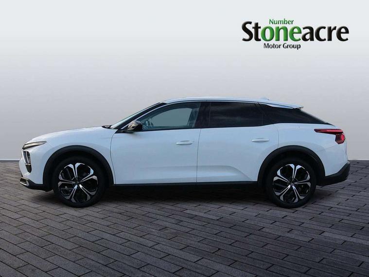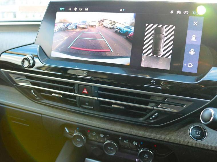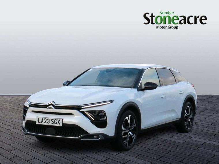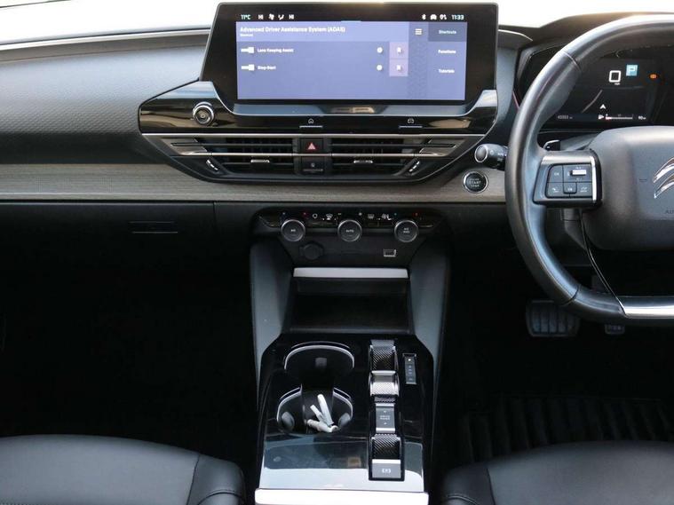 12" Central touch screen with separate heating and ventilation controls (with ADAS and Home buttons), 7'' Digital instrument cluster with smoked glass, 10 + 2 indicator lights and ambiance backlighting, Citroen connect box with emergency and assistance system, Coffee Break Alert, Connected 3D navigation, Driver attention alert system, Driver information panel with lighting fault indicator, E-call, Electric variable power assisted steering, Extended blind spot detection, Extended traffic sign recognition, Forward collision warning, Front and rear parking sensors, Highway Integrated Assist (Adaptive Cruise Control with Stop & Go function and Lane Positioning Assist), In-crash braking, Lane change assistant, Lane keep assist, Multi window screen, MyCitroën Drive Plus (incorporating electronic user guide), Outside temperature display, Radar Controlled Active Safety Brake (with enhanced pedestrian and cyclist pickup and able to function at night), Rear cross traffic alert, Remote functions: horn and lighting, lock/unlock doors, vehicle status, Speed limit recognition and recommendation, Top rear vision reversing camera, Voice recognition, Wireless mirror screen, Wireless smartphone charging, Citroen Advanced Comfort suspension with double (front & rear) progressive hydraulic cushions, 2 front USB plugs : 1 USB type C charge + data (front of centre console), 1 USB type C charge only (under centre front armrest), able to charge IPAD, 2 rear USB plugs charging only (able to charge IPAD), Bluetooth streaming, DAB Digital radio, Hi Fi System: 8 loudspeakers (2 front woofers, 2 front tweeters, 2 rear woofers and 2 rear tweeters), A pillar in black, Acoustic insulated and tinted windscreen with Head Up Display (eHUD), Automatic illumination of headlamps when unlocking, Automatic rain-sensitive flat blade wipers with integrated wash function, Automatic welcome and follow me home lighting, Automatically illuminating LED headlamps with automatic High Beam Assist (with driver adjustment controls in passenger compartment), Body coloured door handles, Chrome Citroën chevrons integrated into front grille and extending outward into front light signature, Electronic, heated, black folding door mirrors with integrated LED indicator, LED approach lighting, Extra tinted rear quarter panel windows, Extra tinted, heated rear window, Frameless electrochrome interior rear view mirror, Front and rear electric windows, Gloss black Citroën chevrons with chrome surround, chrome Citroën lettering and C5 X badging on rear tailgate, High level LED brake light, LED daytime running lights, LED fog lights with static cornering function integrated into front bumper apron, LED front indicators, LED rear lights, LED rear number plate lights, Rear side wing doors, Rear wiper, Remote 4-window opening/closing with plip, Satin chrome trim on rear bumper, Tinted front and extra tinted rear windows, 12V power socket in front centre console, 12V socket in boot, 3 rear headrests, 3 seat bench in 2nd row, Automatic dual zone air-conditioning with Soft/Normal/Fast variable settings, A/C max function and single- zone function (through touch screen), Black leather-effect central armrest with overstitching, Black leather-effect front and rear door panel inserts, Black tie down rings for secure load storage, Cabin air filter, Carpeted boot with low-friction loading floor rails, Courtesy lighting: front roof light, rear roof light, central console lighting, LED illuminated glovebox and LED boot light, Dashboard mounted black, backlit, chrome-ringed start/stop button, Driver and front passenger sun visors with mirrors and LED lighting, Driver's footrest, e-Toggle automatic gear selector switch on centre-console, Front and rear door pockets, Front and rear passenger storage areas in central console, Front headrests, Front seatback storage pockets, Height and reach adjustable steering wheel, High efficiency air filter, Illuminated passenger glovebox, Interior LED welcome lighting - door handles, front foot wells, driver instrument panel, ISOFIX points in outer rear seats with top tether anchorage points, Magic Handles - allows rear seats to be folded flat from the boot compartment, Mistral carpet with reinforced driver's foot well, Multifunction heated, grained leather steering wheel with paddle shifters, driving assistance and infotainment control functions, Plastic boot sill, Rear air vents with independent opening/closing and left and right airflow settings for rear seat passengers, Rear armrest storage and cup holders, Roll up awning fitted to tailgate, Satin chrome dashboard strip and satin chrome decor on bottom of door panels, Satin chrome highlighted air vents and steering wheel, Single front passenger seat, Smartphone storage in front of (front) centre armrest, Storage area for emergency safety triangle/first-aid kit, Storage under central armrest, 2 tone horn, ABS, Curtain airbags, Driver and front passenger airbags, Electric parking brake, Electronic Stability Programme (ESP), Five 3 point inertia reel seat belts, Front inertia reel seatbelt with pre-tensioners and force limiters, Front passenger airbag deactivation, Hill start assist function, Intelligent Traction Control system, Lateral airbags, Pedestrian protection active bonnet, Power child locks on rear doors, Tyre underinflation detection, Unfastened seatbelt visual warning system on all seats + audible warning for driver/front passenger (front passenger presence detection), Deadlocking system, Locking wheel nuts, Perimetric and volumetric anti theft alarm, Proximity keyless entry (doors, boot and fuel filler flap) and start, Dashboard and door panels décor - wood film and grain, 19'' Aero-X Diamond Cut Alloys with Onyx black paint & Onyx black aero inserts,