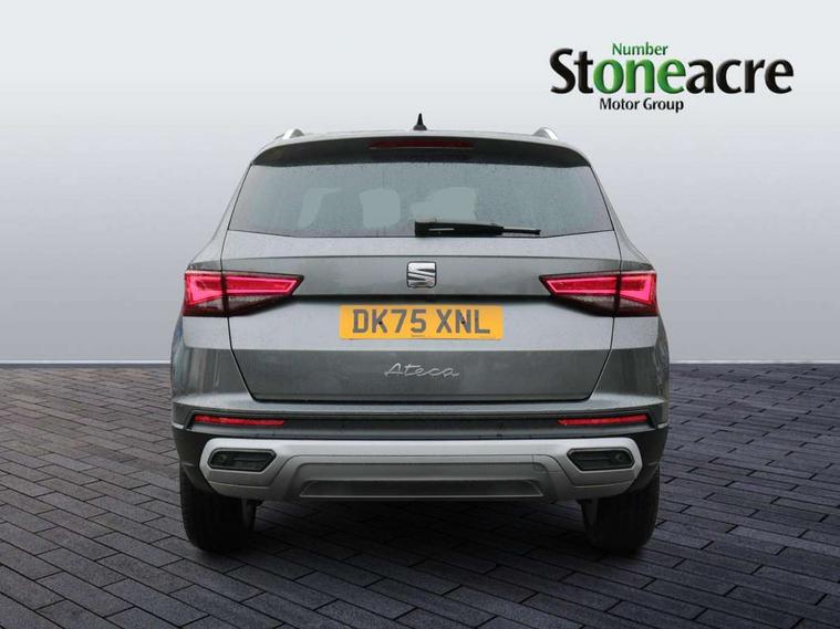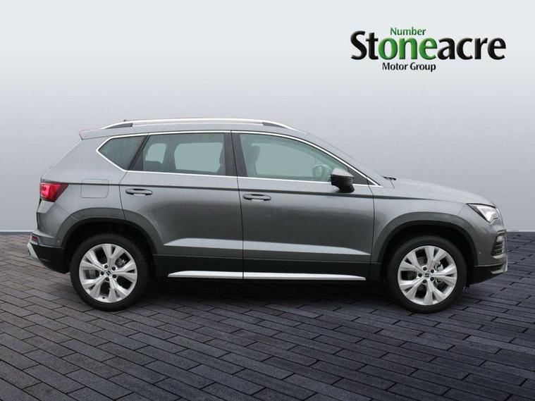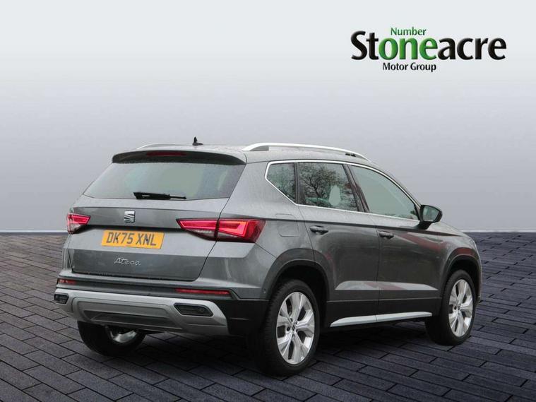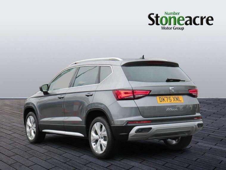 8" Digital cockpit, Colour multi-function on board computer display, E-call, Electric tailgate, Outside temperature gauge, Progressive power assisted steering, Rear view camera, SEAT drive profile with driving experience button - Normal, Sport, Eco and Individual mode, gearshift, steering and throttle response, Self parking functionality (includes front and rear parking sensors), Start/stop system, Trip computer, wired and wireless full link smartphone integration, Wireless phone charger, Steering wheel mounted audio/phone controls, Black wheel arch surrounds, Body colour bumpers, Chrome front grille frame, Chrome roof rails, Chrome side window trim, Dark tinted rear windows, Daytime running lights, Door mirrors with welcome light silhouette, Dynamic headlight range control with self adjusting whilst driving, Electric adjustable/heated/folding door mirrors, Front and rear electric windows, Front grille hot stamping, Full LED headlamps with lens and LED front fog lamps with cornering function, Heat reflecting windscreen, Illuminated aluminium front door sill, LED 3rd brake light, LED rear tail lights with dynamic indicators, Rear exhaust tailpipe, Rear fog lights, Rear side wing doors, Rear wash/wipe, Reflex silver side mouldings, Variable front intermittent wipers, 12V socket in front, 3 seat bench in 2nd row, 60/40 split folding rear seat, Dinamica upholstery with front comfort seats, Drawer under right front seat, Dual zone climate control, Front and rear head restraints, Front centre armrest, Front seat back storage pockets, Height adjustable driver and passenger seat with lumbar adjustment, ISOFIX points in outer rear seats with top tether anchorage points, Leather sports steering wheel and gear knob, Rear armrest and easy back seat release mechanism from boot, Single front passenger seat, Steering wheel mounted gearshift paddles, Convenience pack - Ateca, Interior lighting pack - Ateca, Navigation system pack with DAB - Ateca, Safety and driving pack (M) - Ateca, Safety and driving pack with attention and drowsiness assist - Ateca, 3x3 point rear seatbelts, ABS, Traction control system (TCS), Electronic stability control (ESC) and Electronic differential lock system (XDS), Airbags - Driver and front passenger airbag with deactivation, front side, two curtain and driver's knee airbags, Electric parking brake with auto hold function, Front and rear seatbelt reminder, Hill hold control, Manual rear child locks, Single tone horn, Tiredness recognition system, Tyre pressure monitoring system, Alarm, Keyless entry, Locking wheel bolts, Remote central locking, Chrome interior detailing, 18" Brillaint silver alloy wheels,