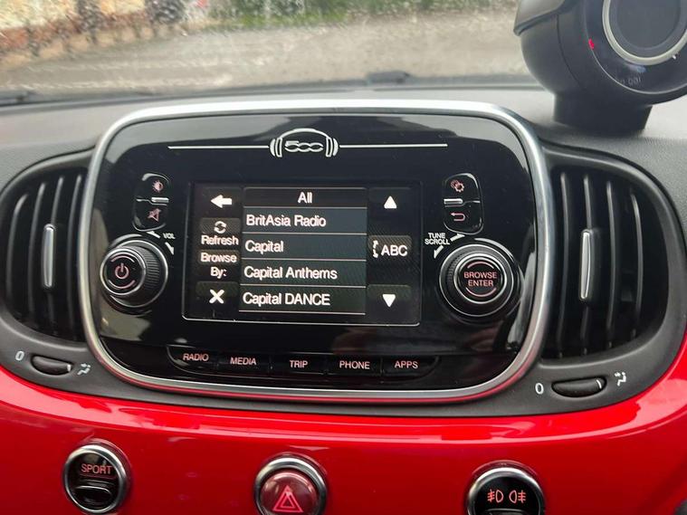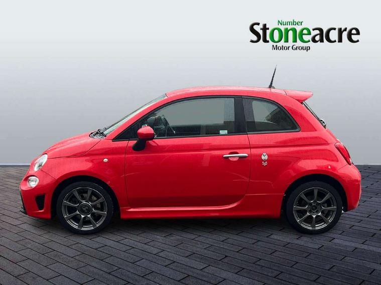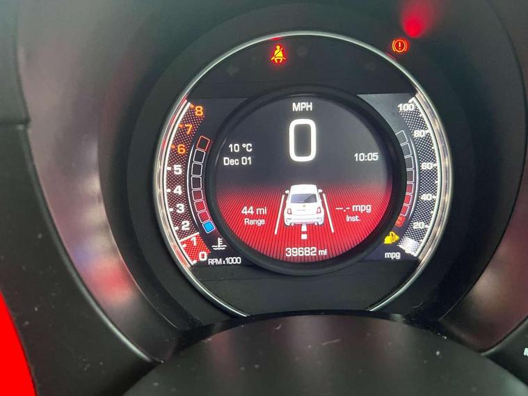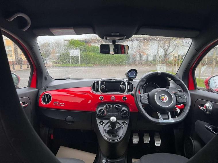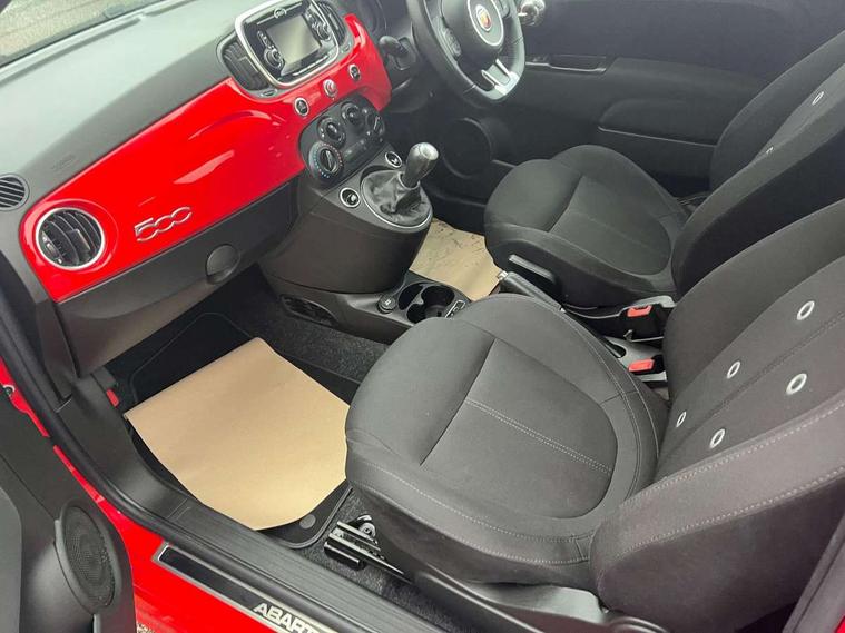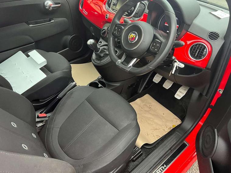 Dualdrive PAS, Sports button, TFT display screen, Trip computer, U-connect access via mobile, Front suspension with FSD technology (Frequency selective Damping), Torque transfer control (TTC), Bluetooth audio streaming, Body coloured bumpers, Electric front windows, Front bumper with honeycomb grille and embossed Abarth logo, Front fog lights, LED daytime running lights, Matt black front and rear bumper insert, Rear wiper, Satin chrome exterior door handles, Twin exhausts with satin steel tailpipes, 12V socket, Chrome gear knob, Driver/front passenger seat height adjustment, Front head restraints, Front passenger seat memory, Glovebox, Height adjustable steering wheel, Interior stowage net, Rear headrests, Sports leather multifunction steering wheel with controls and satin chrome detailing, Sports seats, Stainless steel sports pedals, 3x3 point rear seatbelts, ABS, Driver and passenger airbags, Drivers knee airbag, ESP + ASR/MSR + HBA + Hill holder, Front side airbags, High performance brakes, Rear brake discs, Tyre pressure monitoring system, Ventilated front disc brakes, Window airbags, Alarm, Central locking, Immobiliser, Remote central locking, Fix and go kit,
