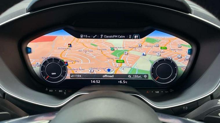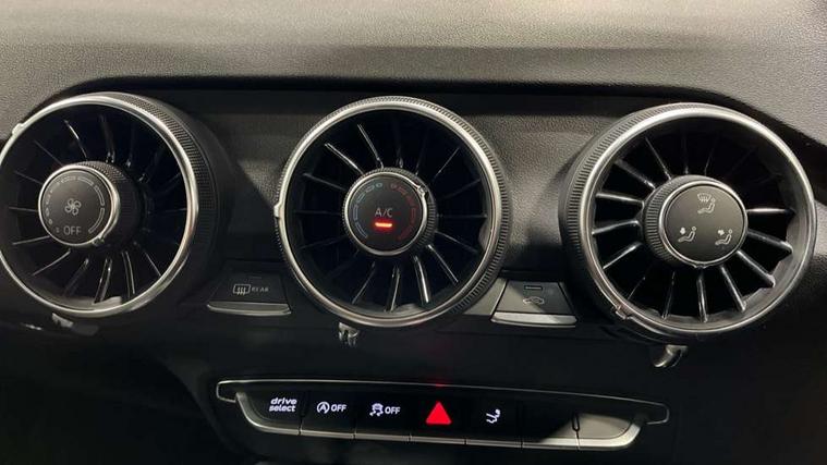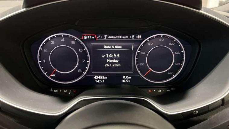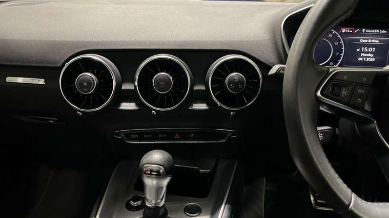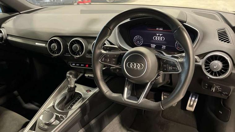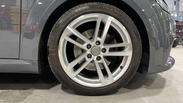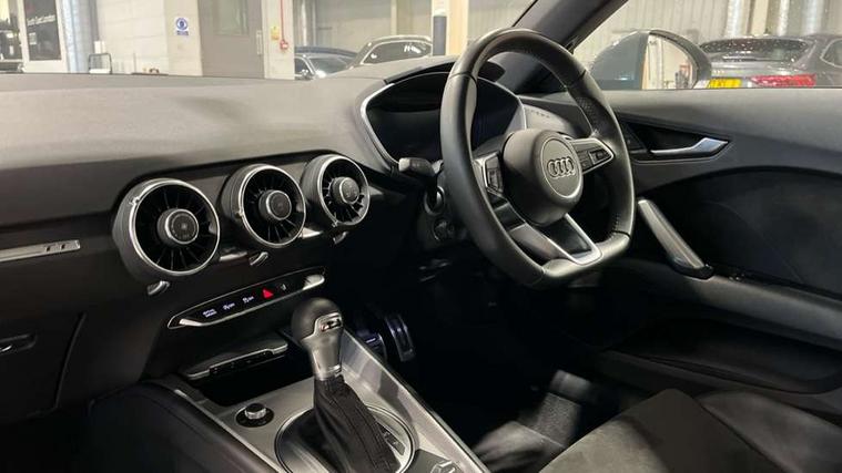 Audi drive select with 4 Pre configured modes, Audi virtual cockpit - 12.3" high-resolution LCD display with fully customisable instrument cluster, Cruise control + speed limiter, MMI touch panel, Mobile phone preparation with bluetooth interface, Progressive power assisted steering, Service interval indicator, Start/Stop system with energy recuperation, TP memo, Sports suspension, AM/FM radio, Audi music interface, Bluetooth audio streaming, DAB Digital radio, MMI Radio with CD player and SD/XC card slot, Auto dimming rear view mirror, Body colour bumpers, Body colour electrically adjustable and heated door mirrors with built in LED side indicators, Electric folding door mirrors, Electric front windows, Front fog lights, Green tinted heat insulating glass, Light and rain sensors, Retractable rear spoiler, Sunband for windscreen, Xenon headlights with LED daytime running lights with automatic headline range control + LED rear lights, brake lights and rear indicators, 12V socket, 3 spoke flat bottomed high multi-function leather sport steering wheel with gearshift paddles, Air conditioning, Alcantara/Leather upholstery includes seat centre panels, door trim inserts in black Alcantara with side bolsters, head restraints in black leather, Aluminium door sill trims, Front centre armrest, Front sports seats, Heated front seats, Height adjustable driver's seat, Height adjustable front head restraints, Height/reach adjust steering wheel, ISOFIX child seat mounting for front passenger seat with airbag deactivation, Reading lights, Rear head restraints, Rear top tether child seat ISOFIX attachment, Split folding rear seat, Tool kit, Top tether anchor plate for isofix child seat, Non smoking pack - TT/TT RS, 3 point front seat belts, ABS, ASR traction control, Brake energy regeneration, Curtain airbags, Driver and front passenger airbag with front passenger airbag deactivation, EDL traction control, Electromechanical parking brake, ESP, First aid kit, Front side airbags, Head airbags, Hill hold assist, Seatbelt warning, Tyre pressure warning, Warning triangle, Anti theft alarm, Anti theft wheel bolts, Immobiliser, Keyless Go, Remote central locking, Aluminium design inlays, Tyre repair kit,