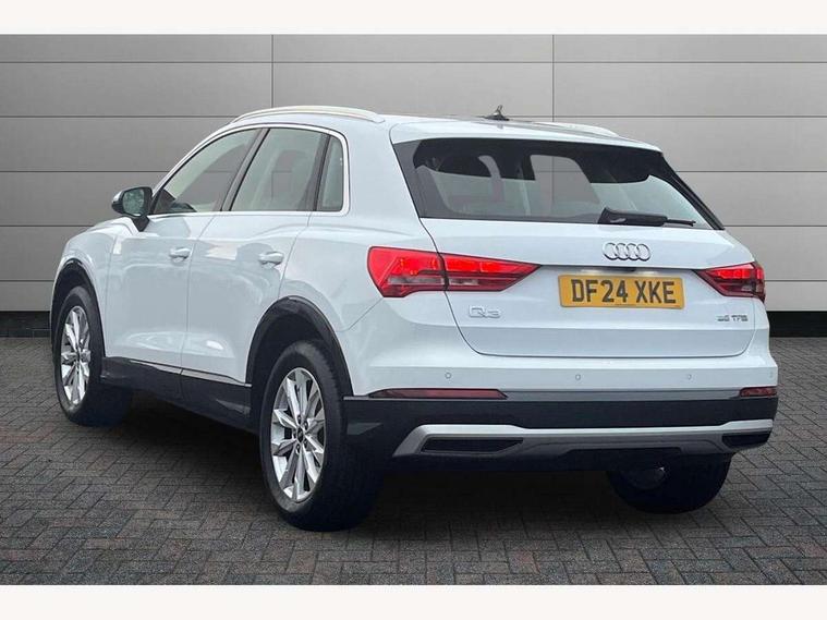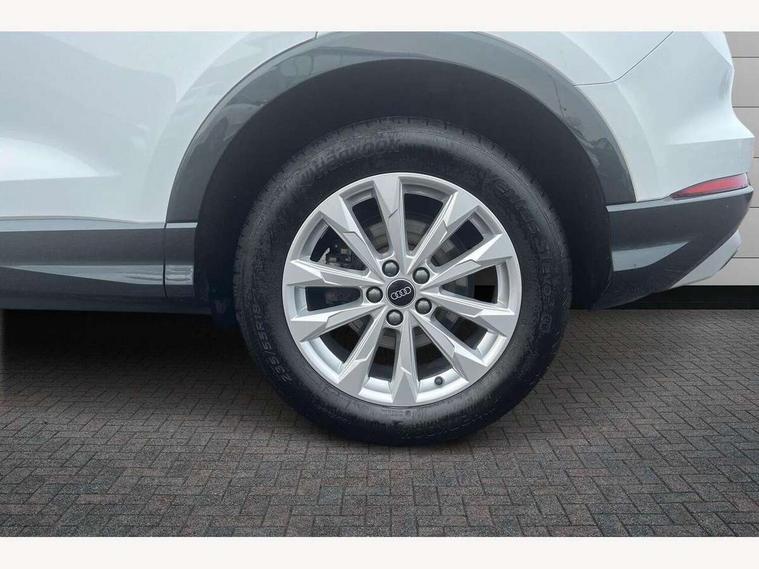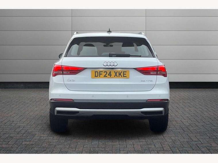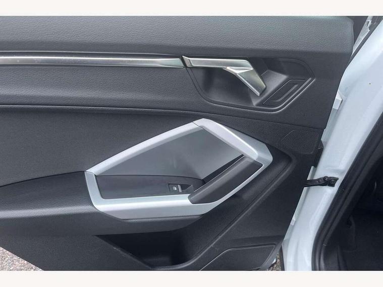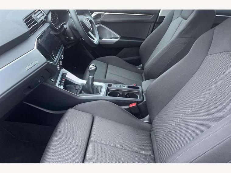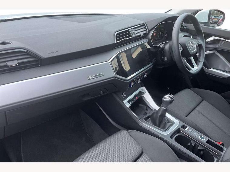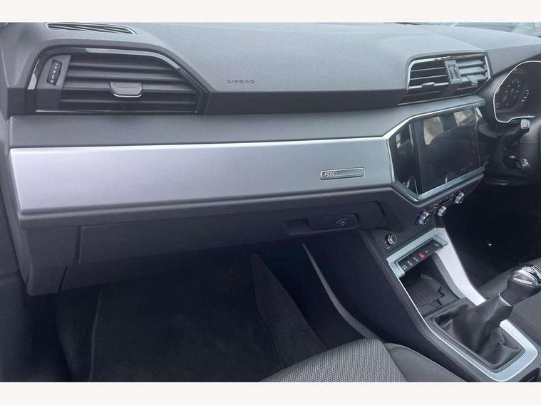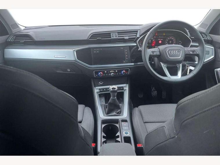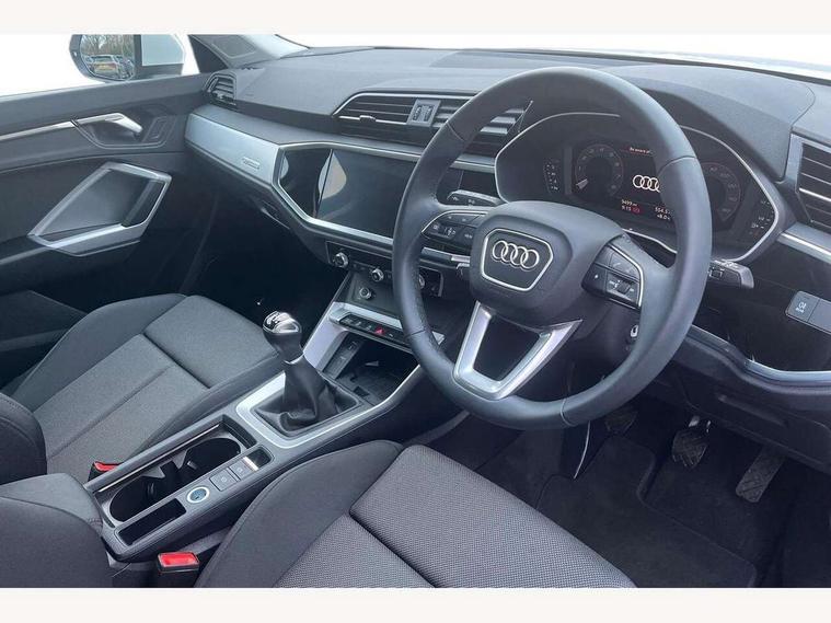 Amazon alexa Integration, Audi connect safety and service, Audi drive select, Audi lane departure warning, Audi smartphone interface includes wireless Apple carplay/Android Auto, Audi Virtual Cockpit - 10.25" display, Bluetooth interface, Camera based traffic sign recognition, Cruise control + speed limiter, Distraction and Fatigue warning, Legal emergency call, MMI Navigation Plus with high resolution 10.1 inch touchscreen colour display, Power operated tailgate, Progressive steering, Rear parking sensors, Service interval indicator, Start stop system with recuperation, Voice control system with natural language interaction, Standard suspension, 2 USB-C ports with charge and data functions, 6 passive loudspeakers, DAB digital radio module, Acoustic windscreen, Aluminium roof rails, Aluminium window trim, Anthracite black radiator grille, Auto dimming door mirrors, Auto dimming frameless rear view mirror, Electrically folding, adjustable and heated door mirrors with integrated LED side indicators and kerb view function for passenger side, Front and rear bumpers, wheel arch trims and side sill trims in contrasting Manhattan grey paint finish, Front and rear electric windows, Front fog lights, Front side air inlets in matt selenite silver, Front spoiler in matt selenite silver, Grille vertical bars in aluminium silver/Matt, High gloss black finish B and C pillars, LED headlights with LED daytime running lights, LED third brake light, Rain and light sensors, Rear diffuser strip in matt selenite silver, Rear side wing doors, Rear wiper, Variable front intermittent wipers, 12V socket in rear centre console, 3 seat bench in 2nd row, 3 spoke multi-function leather steering wheel, 40:20:40 folding with manual adjustment for 60:40 forwards/backwards position and backrest angle, Door sill trims with aluminium inlay, Dual zone electronic climate control, Electric lumbar support, Front and rear floor mats, Front and rear headrests, Front centre armrest, Height and reach adjustable steering wheel, ISOFIX child seat mounting for front passenger with airbag deactivation and outer rear seat including top tether attachment point for outer rear seats, Lunar silver cloth headlining, Manual front seats with height adjustment, Single front passenger seat, Stainless steel luggage compartment sill finisher, Non smoking pack - Q3, 3x3 point rear seatbelts, 6 airbags - Driver, front passenger, curtain and side windows, Audi pre-sense front with pedestrain and cyclist recognition, Electrically operated child locks on rear doors, Electromechanical parking brake, Electronic stabilisation control including ABS, ASR and EDL, Front seatbelt reminder, Hill descent control, Hill hold assist, Pre sense basic, Seatbelt monitoring, Tyre pressure warning, Warning triangle and first aid kit, Anti theft alarm, Anti theft wheel bolts, Immobiliser, Remote central locking, Aluminium look interior elements, Detail dashboard around MMI touch colour display in glass look, black with surround in aluminium look, Micrometallic silver inlay,