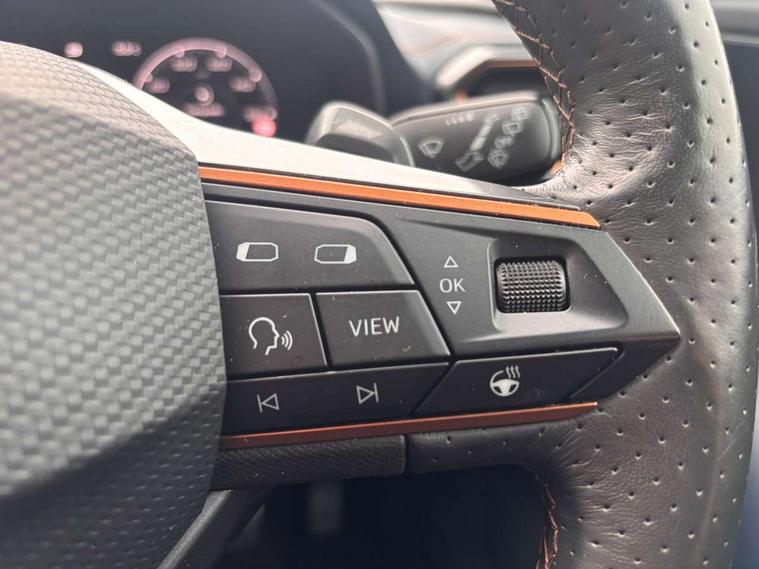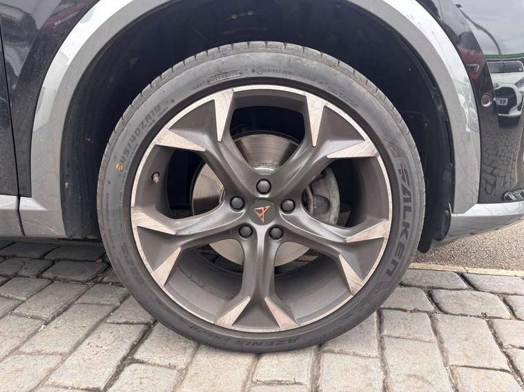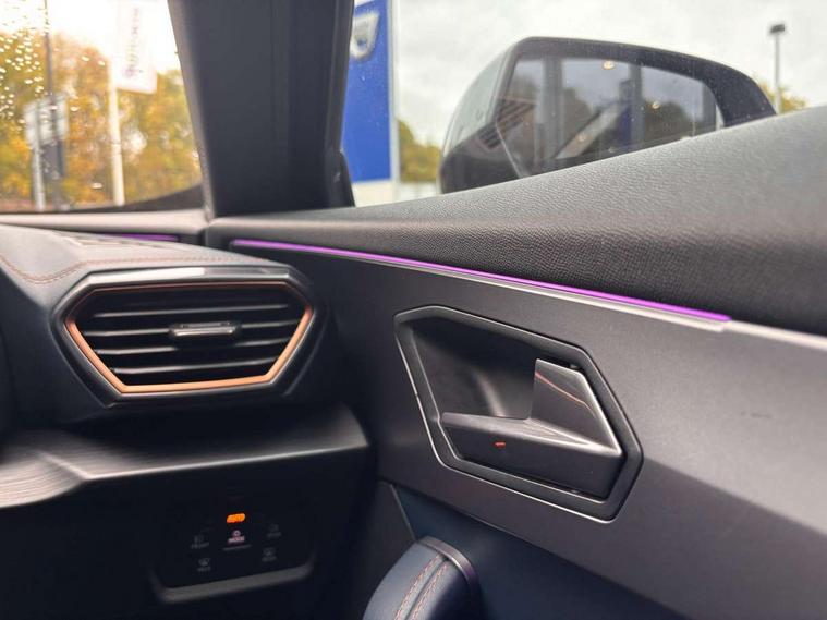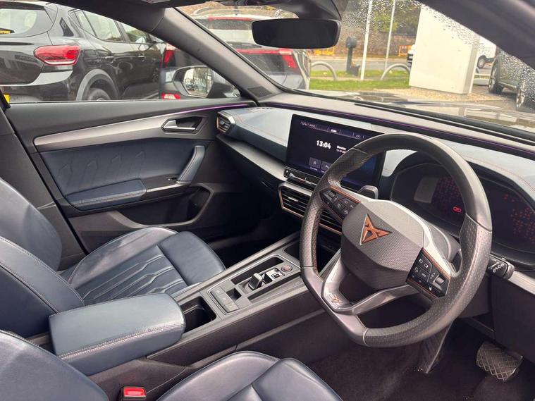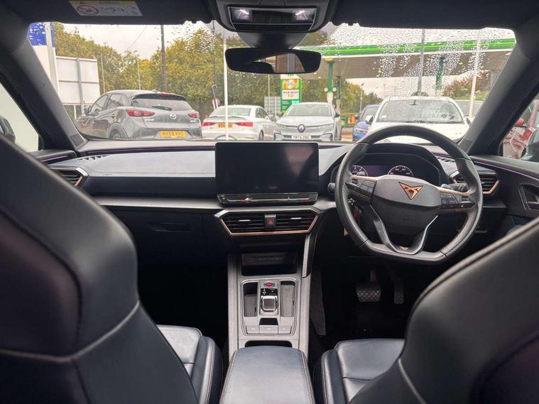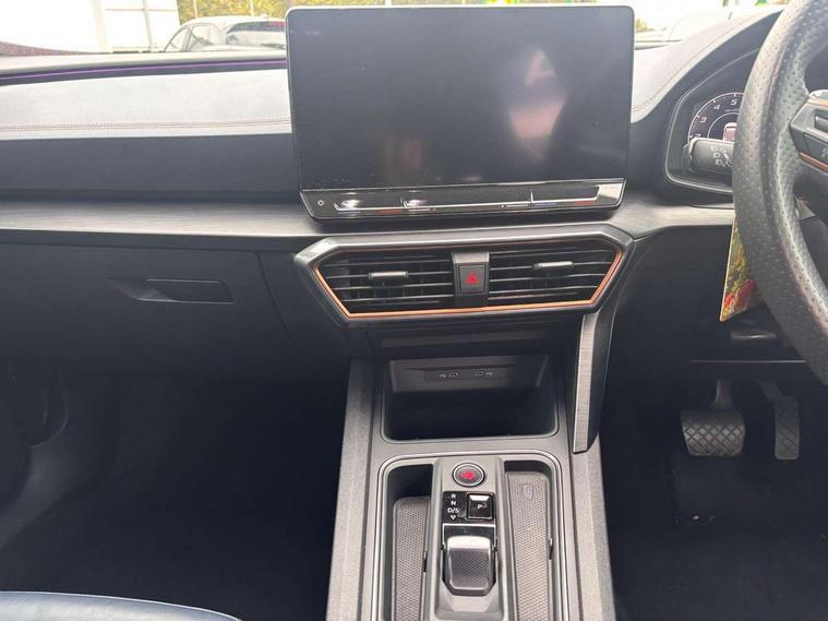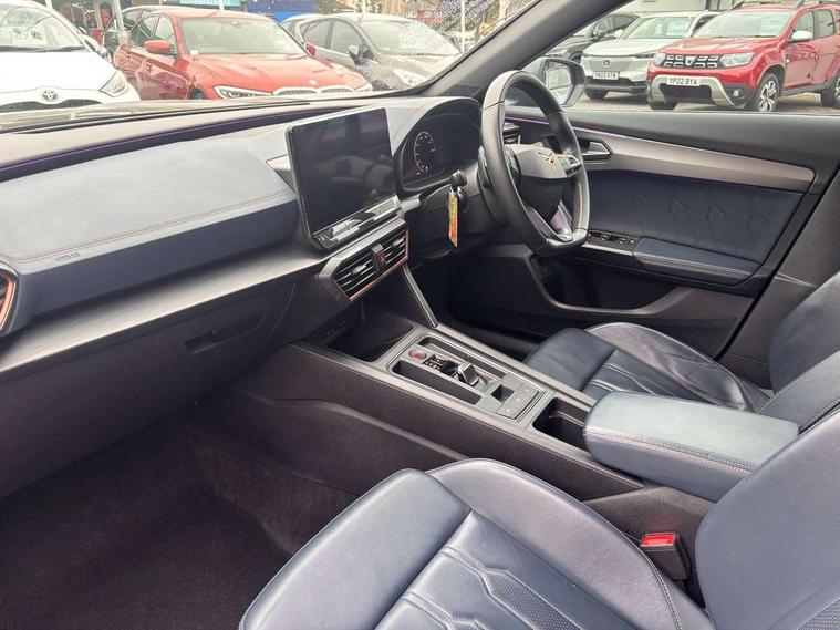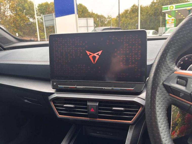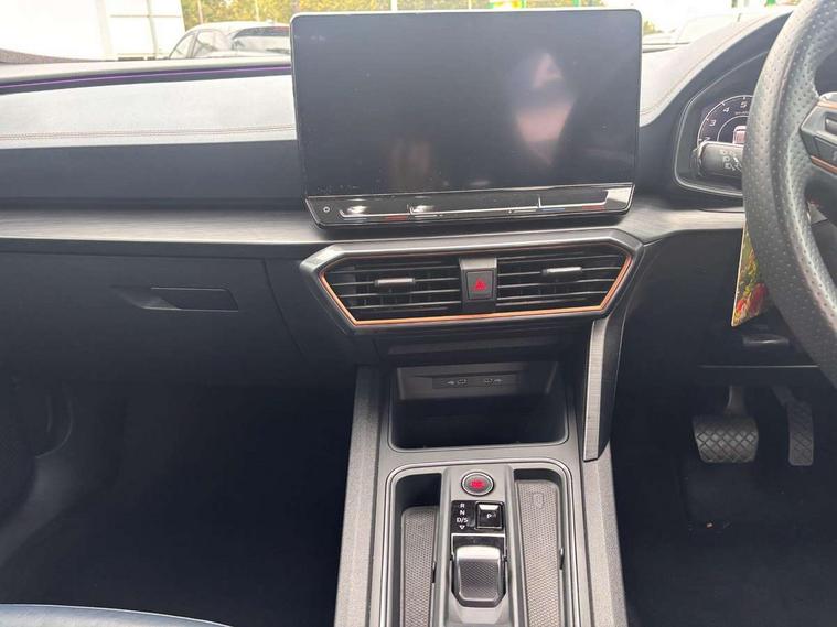 Digital cockpit and configurable dashboard, Driver alert system, Driving profile selection, Forward collision warning with automatic braking, Park assist (inc front/rear parking sensors), PAS, Predictive adaptive cruise control with speed limiter, Rear view camera, RPM, trip computer, outside temp gauge, instrument light brightness, low fuel warning light, lights on reminder, gearshift indicator, Service interval indicator, Start/stop system with regenerative braking, Wireless apple carplay, Wireless phone charger, Electronic locking differential and dynamic traction support, Standard suspension, 2 front and 2 rear USB type C sockets, Auxiliary input socket, DAB radio, Auto dimming rear view mirror, Body colour door handles, Body coloured bumpers, Dark grey wing mirror, Daytime running light with automatic headlight control and coming home feature, Dynamic headlight range control, Electric front/rear windows, Electrically adjustable, heated and folding door mirrors, Front fog lamps with cornering function, Gloss black roof rails and window surrounds, LED Headlights, LED Taillights with dynamic indicator, Rain sensing wipers, Rear diffuser with black simulated exhaust pipes, Rear wash/wipe, Tinted rear windows, Welcome lights, 12v power supply in centre console, 12v socket in loadspace, 2 front and 2 rear reading lights, 230V socket, 60/40 split rear bench seat with armrest and mechanical seat release, Black headlining, Dust/pollen filter, Front and rear head restraints, Front centre armrest, Heated steering wheel, Height/reach adjust steering wheel, Illuminated interior front door sills, Illuminated sunvisor with mirror, Interior ambient lighting, Isofix, Leather multi function steering wheel with gear shift paddles, Luggage tie-down hooks, Three zone climate control, Three zone climate control with control panel in rear, Variable luggage/load compartment floor, Wraparound lighting, Genuine Nappa leather Pack - Cupra, Navigation system pack - Formentor, 3 point seatbelts on all rear seats, ABS, Brake control system - ESC and brake booster, Child proof door locks, Driver and front passenger airbags with front passenger airbag de-activation, Electronic parking brake, Front and rear disc brakes, Front side curtain airbags, Hill hold control, Seat belt reminder for front and rear seats, Tyre pressure monitoring system, Anti theft alarm system, Keyless entry and start system (KESSY), Locking wheel bolts, Copper and aluminium interior detailing, 19" Exclusive machined sport matt black and silver alloy wheels with 94W tyres,