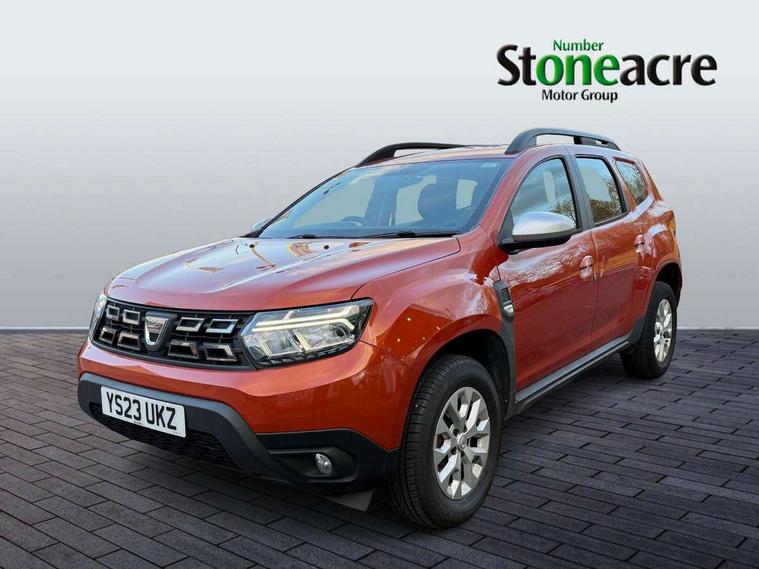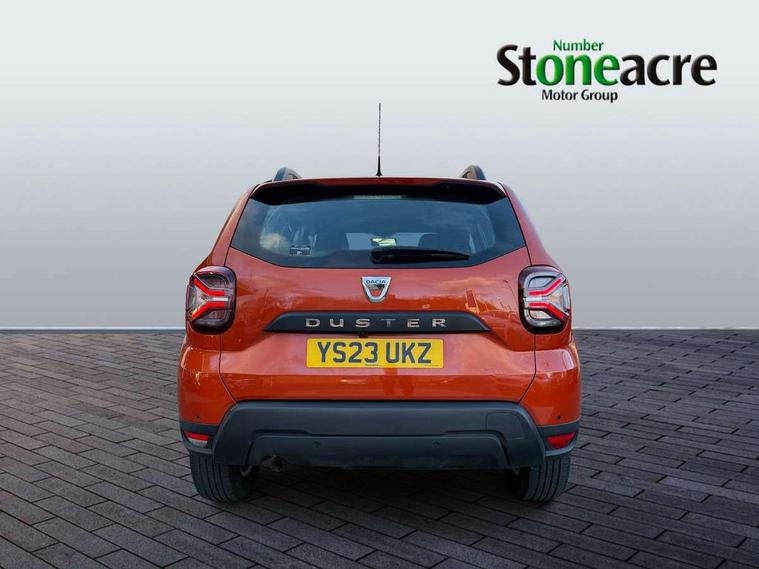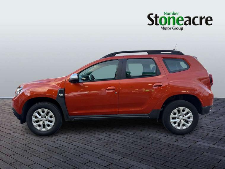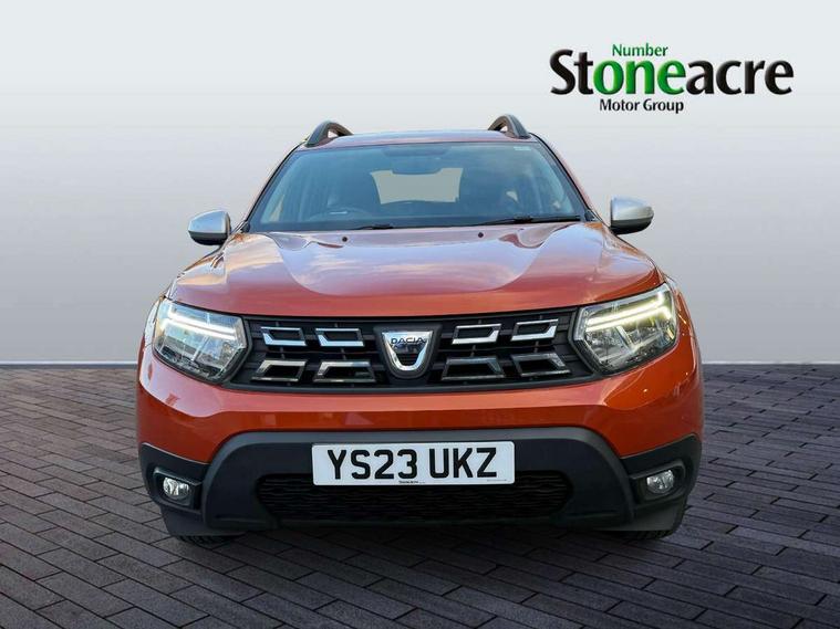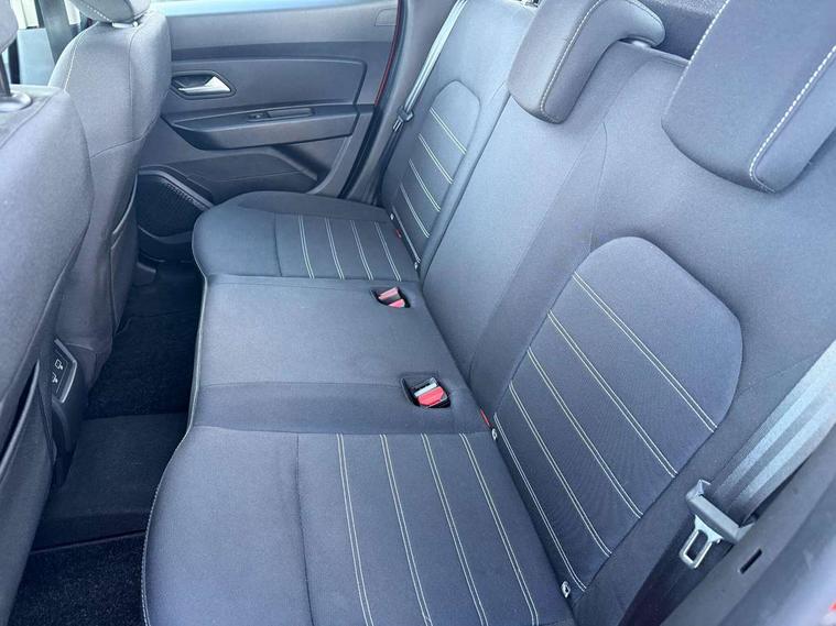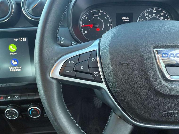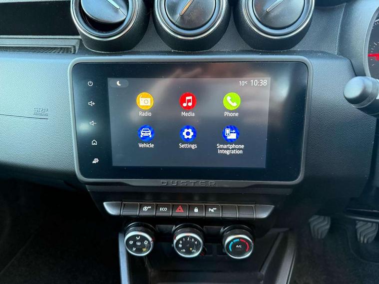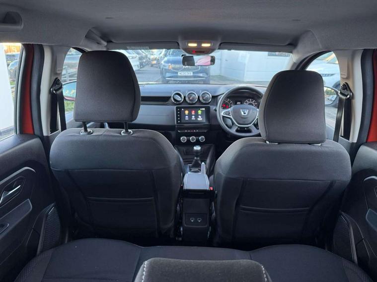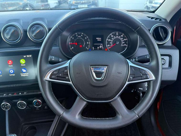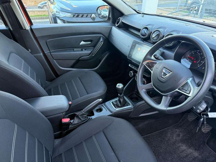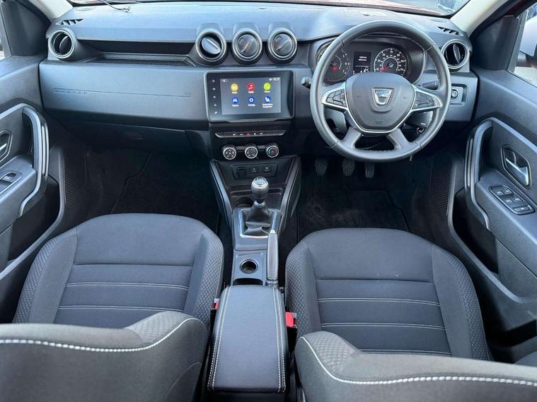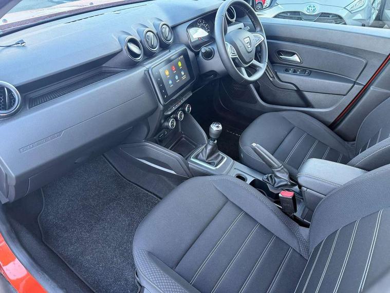 4x4 monitor with altimeter, Compass functional at 0km/h, Cruise control and speed limiter, Dacia instrument cluster, eCall emergency system, Eco mode, Electric power assisted steering, On board computer, odometer, trip computer, average fuel consumption, average speed, service indicator, outside temperature gauge, Rear parking sensors and reverse camera, Rev counter, Stop/start system, 8" Media display with smartphone replication, 2 usb sockets and 6 speakers, Dacia plug and radio/MP3/USB/bluetooth/DAB/steering wheel control, 3 speed windscreen wipers, Black door mirrors, Black longitudinal roof bars with Duster inscription, Black side sills, Black/satin chrome tailgate trim with Duster inscription in black background and lettering, Body coloured door handles, Chrome front grille with hot stamping, Chrome logo surround on steering wheel, Dusk sensor, Electric adjustable/heated door mirrors, Electric front windows, Electric rear windows, Front and rear body coloured bumpers, Front door sill protection strip, Front fog lights, Heated rear window, High level third rear brake light, LED automatically switched on - In main headlights, LED daytime running lights, Rain sensor, Rear side wing doors, Rear spoiler, Rear wash/wipe, Tinted windows, Underbody protection skid plates, Y shaped LED headlights with rear LED lights, 3 rear height adjustable headrests, 3 seat bench in 2nd row, 60/40 split folding rear seat, Backlighted steering wheel buttons, Boot light, Driver seat lumbar adjustment, Fabric decorative insert on door panels, Fabric upholstery, Front head restraints, Front passenger reading light, Gear shift indicator, Glovebox light, Height adjustable driver seat, Height adjustable front and rear headrests, Height and depth adjustable steering wheel, High centre console with driver armrest, Isofix points for child seats in both outer rear seats, Manual air conditioning, Map pocket on front seat backs, Passenger sunvisor with vanity mirror, Rear passenger reading light, Satin chrome interior door handles, Satin chrome lower steering wheel insert, Single front passenger seat, Soft feel leather steering wheel, 3x3 point rear seatbelts, ABS and Emergency brake assist, ASR traction control with Electronic stability control, Child locks on rear doors, Door open visual and audible warning, Driver airbag, Driver and passenger seatbelt not fastened - visual and audible warning, Front passenger airbag, Front passenger airbag deactivation, Front seatbelt pretensioners, Front side airbags, Height adjustable front seatbelts, Hill start assist, Tyre pressure monitor, Remote central locking, Thatcham approved engine immobiliser, Dark carbon central console surround, Matt black central console fascia, Piano black decorative insert on door panels, Satin chrome air vent surround, 16" alloy wheels, Space saver spare wheel,