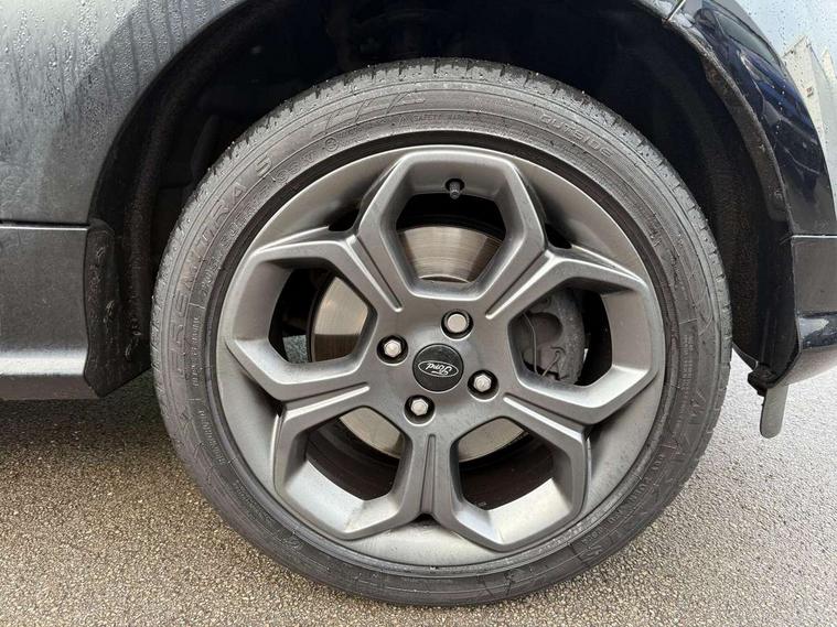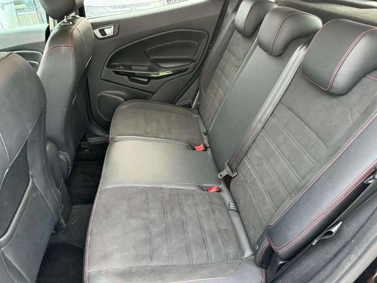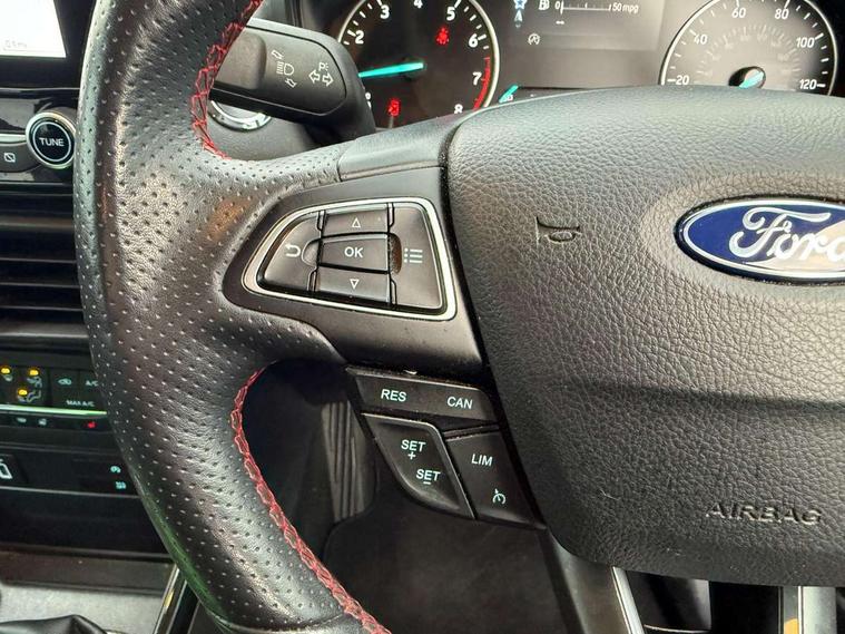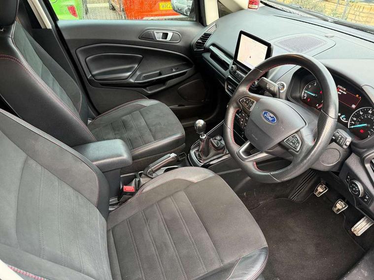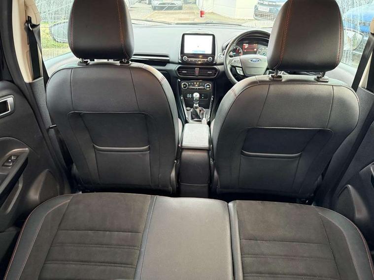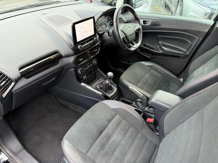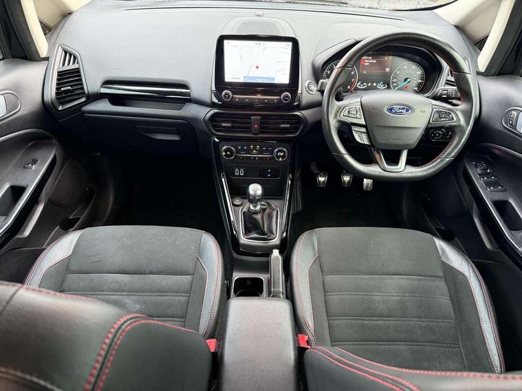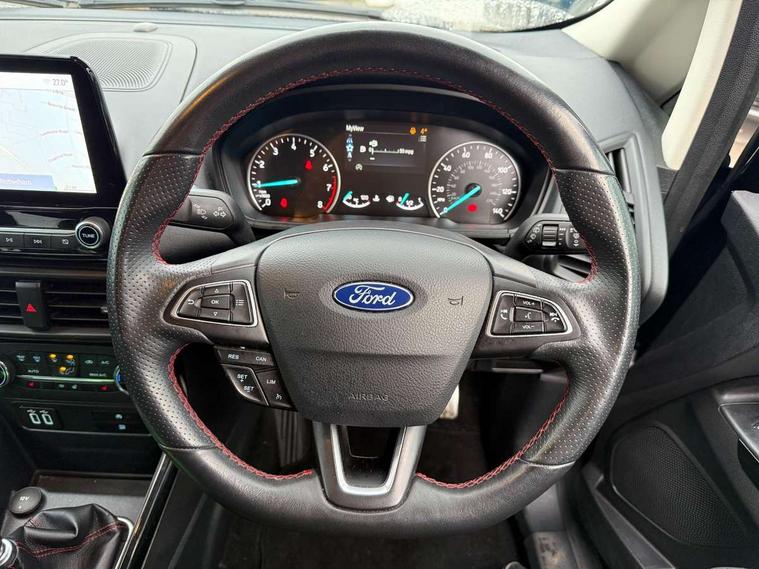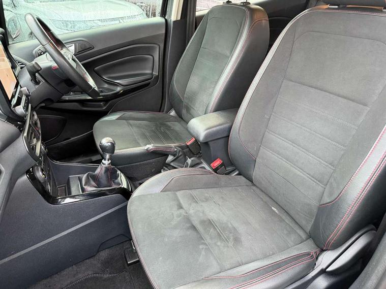 Cruise control, Easy fuel capless refuelling system, PAS, SYNC 3 nav system with DAB radio, 8" screen, voice control, emergency assistance, Apple car play/Android auto, 2x USB, Ford pass connect, Trip computer, Sports suspension, Steering wheel mounted audio controls, 'Quickclear' heated windscreen/heated washer jets, Auto dimming rear view mirror, Automatic headlights, Black roof rails, Body colour door handles, Body coloured bumpers, Electrically adjustable and heated door mirrors, Front door threshold plates with ST-Line logo, Front fog lights, Headlight levelling control, Large rear spoiler, Power foldable door mirrors with puddle lights, Power front and rear windows with global opening/closing, Rain sensing front wipers, Rear wiper, ST-Line body styling kit, ST-Line front grille, 12V socket in front and rear, 60/40 split rear seats, 7 shade adjustable ambient lighting, Centre console with sliding front armrest, Cooled glovebox, Courtesy lights with map reading light, Driver seat height/lumbar adjust, Driver's side glovebox, Driver/passenger sunvisors and lidded vanity mirrors, EATC - Electronic Auto Temperature control, Folding grab handles, Front head restraints, Front seat back map pockets, Front/rear floor mats, Illuminated glovebox, Illuminated luggage compartment, Isofix system on outer rear seats, Leather steering wheel/gearshift/handbrake lever with red stitching, Luggage compartment carpet, Overhead console with sunglasses holder, Partial leather upholstery, Rake adjustable rear seats, Reach + rake adjustable steering column, Rear headrests, Stainless steel sports pedals, Steering wheel with chrome inserts, Storage drawers under front seats, Tie down hooks, Variable boot floor, Rear view camera pack - Ecosport, 3x3 point rear seatbelts, ABS, Child locks on rear doors, Curtain airbags, Driver airbag, Drivers knee airbag, Electronic Stability Programme with hill launch assist, Emergency brake assist, Front passenger airbag deactivation, Front side airbags, Passenger airbag, Seatbelt reminder for driver and front passenger, Traction control, Tyre pressure monitoring system, Immobiliser, MyKey system, Remote central locking, Thatcham 1 volume sensing alarm, Tyre inflation kit,