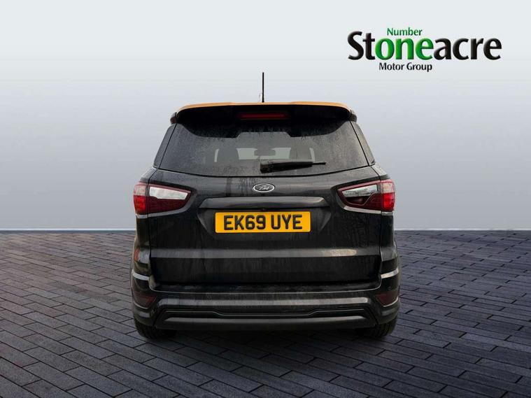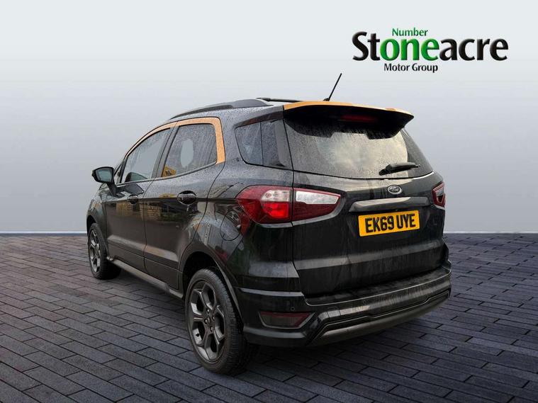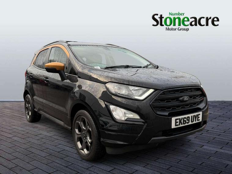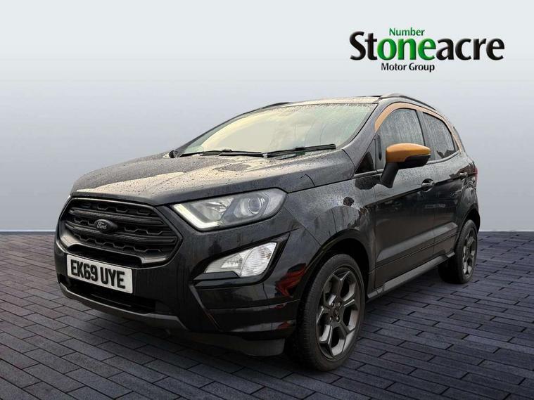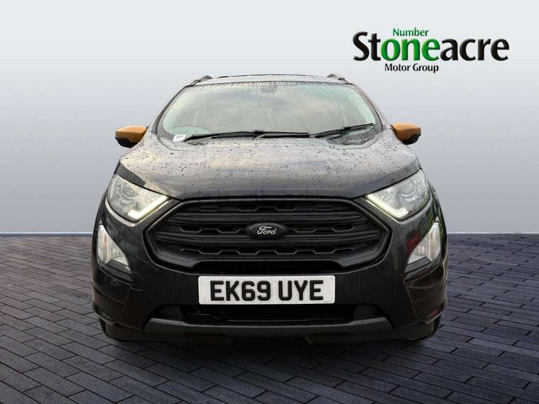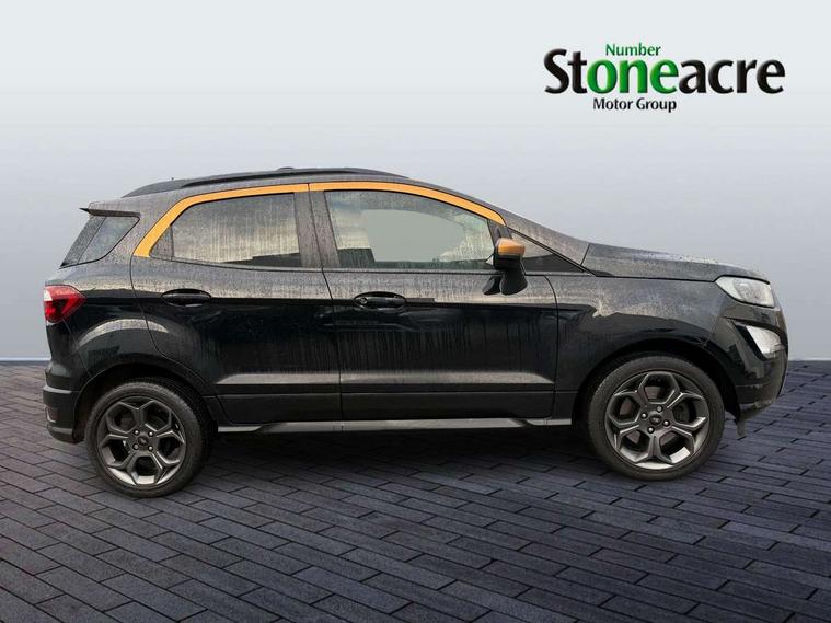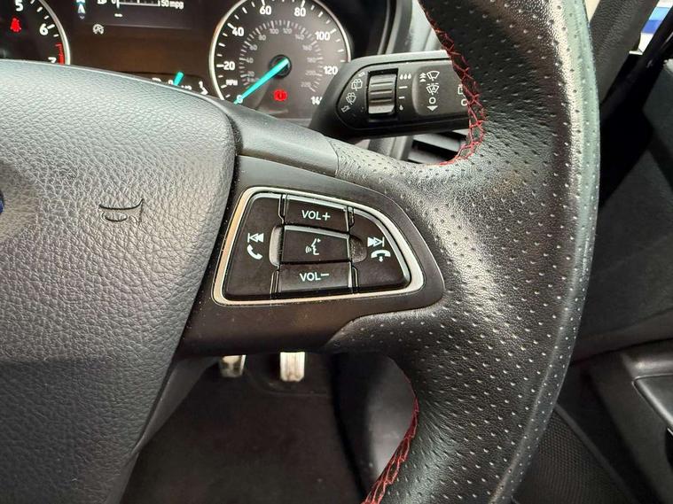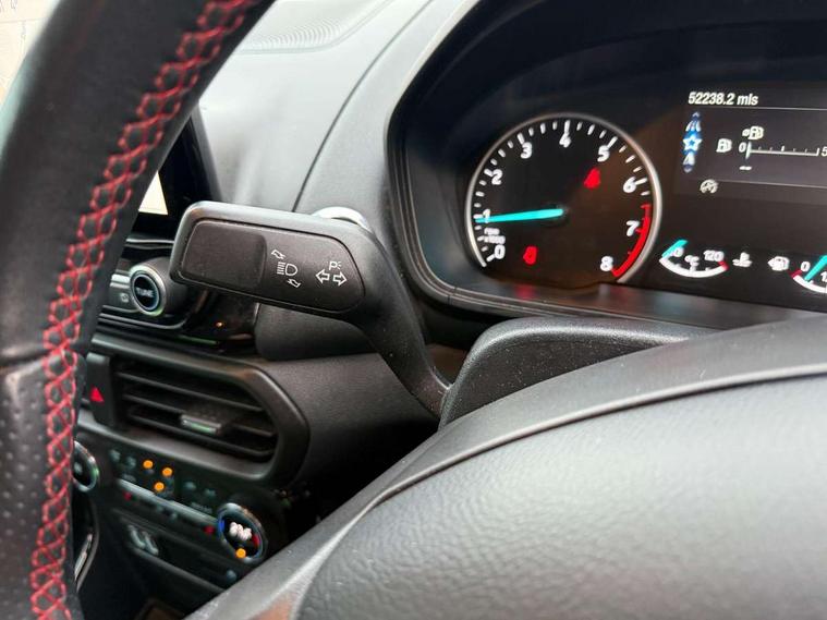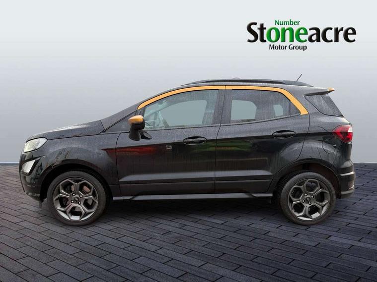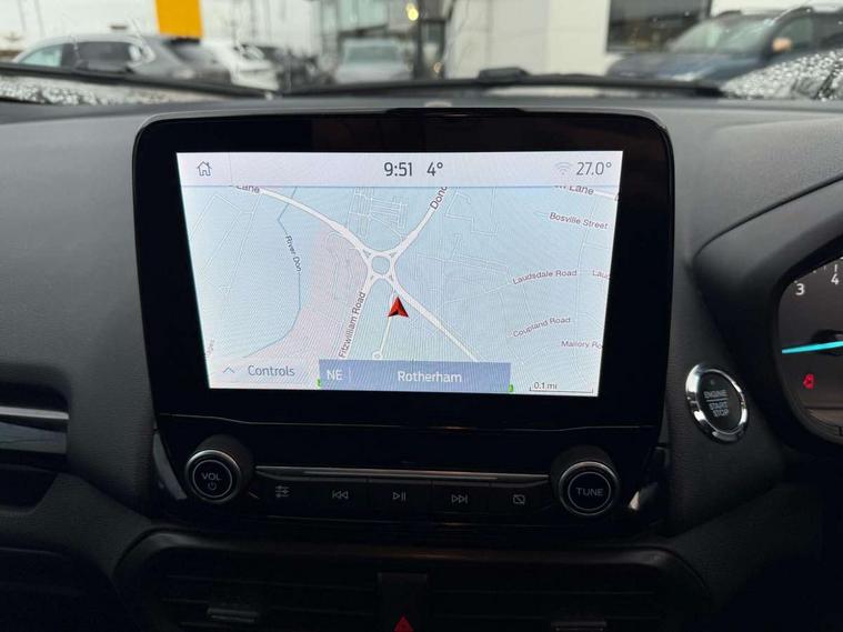 Cruise control, Easy fuel capless refuelling system, PAS, SYNC 3 nav system with DAB radio, 8" screen, voice control, emergency assistance, Apple car play/Android auto, 2x USB, Ford pass connect, Trip computer, Sports suspension, Steering wheel mounted audio controls, 'Quickclear' heated windscreen/heated washer jets, Auto dimming rear view mirror, Automatic headlights, Black roof rails, Body colour door handles, Body coloured bumpers, Electrically adjustable and heated door mirrors, Front door threshold plates with ST-Line logo, Front fog lights, Headlight levelling control, Large rear spoiler, Power foldable door mirrors with puddle lights, Power front and rear windows with global opening/closing, Rain sensing front wipers, Rear wiper, ST-Line body styling kit, ST-Line front grille, 12V socket in front and rear, 60/40 split rear seats, 7 shade adjustable ambient lighting, Centre console with sliding front armrest, Cooled glovebox, Courtesy lights with map reading light, Driver seat height/lumbar adjust, Driver's side glovebox, Driver/passenger sunvisors and lidded vanity mirrors, EATC - Electronic Auto Temperature control, Folding grab handles, Front head restraints, Front seat back map pockets, Front/rear floor mats, Illuminated glovebox, Illuminated luggage compartment, Isofix system on outer rear seats, Leather steering wheel/gearshift/handbrake lever with red stitching, Luggage compartment carpet, Overhead console with sunglasses holder, Partial leather upholstery, Rake adjustable rear seats, Reach + rake adjustable steering column, Rear headrests, Stainless steel sports pedals, Steering wheel with chrome inserts, Storage drawers under front seats, Tie down hooks, Variable boot floor, Rear view camera pack - Ecosport, 3x3 point rear seatbelts, ABS, Child locks on rear doors, Curtain airbags, Driver airbag, Drivers knee airbag, Electronic Stability Programme with hill launch assist, Emergency brake assist, Front passenger airbag deactivation, Front side airbags, Passenger airbag, Seatbelt reminder for driver and front passenger, Traction control, Tyre pressure monitoring system, Immobiliser, MyKey system, Remote central locking, Thatcham 1 volume sensing alarm, Tyre inflation kit,