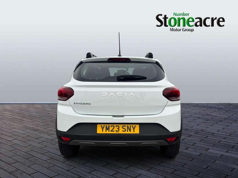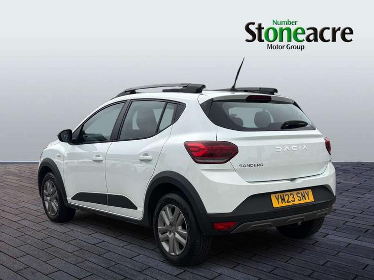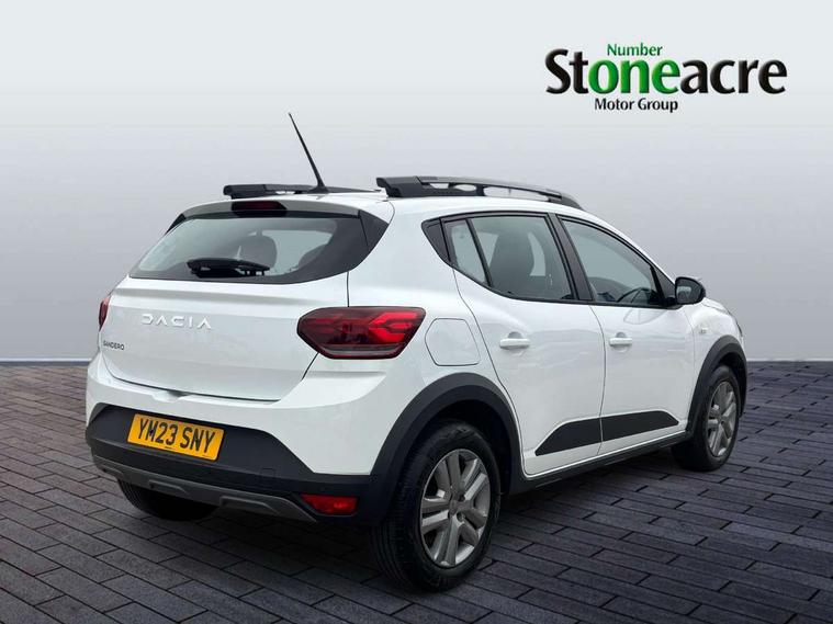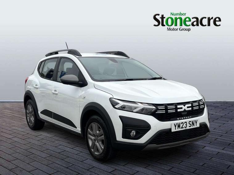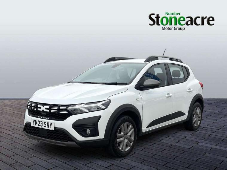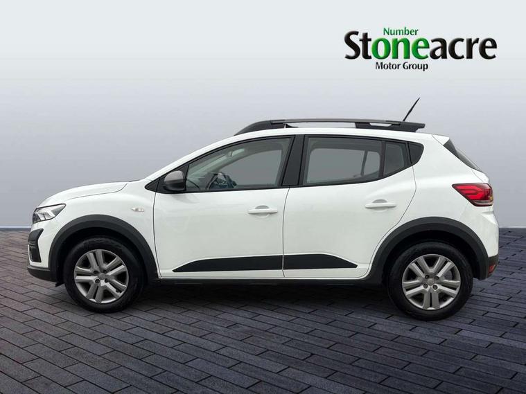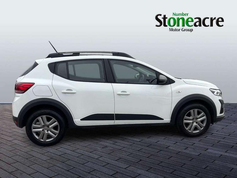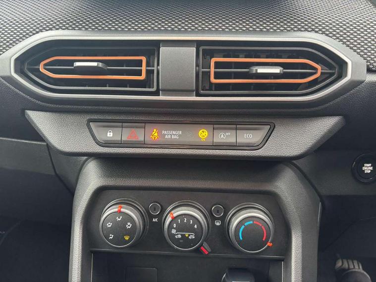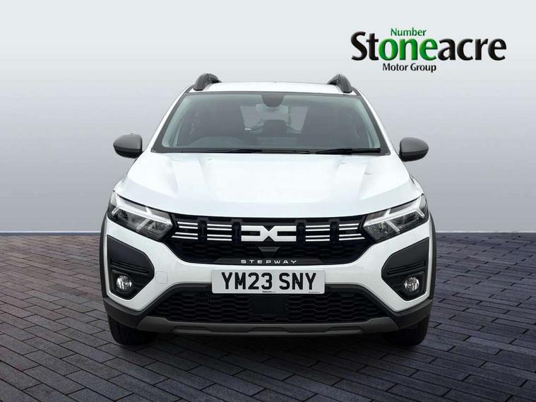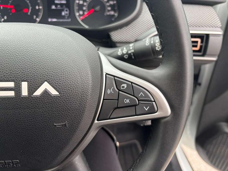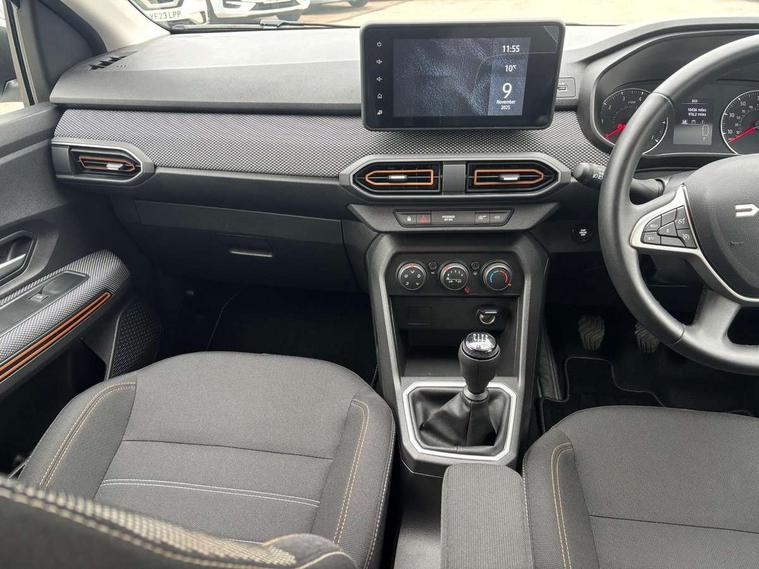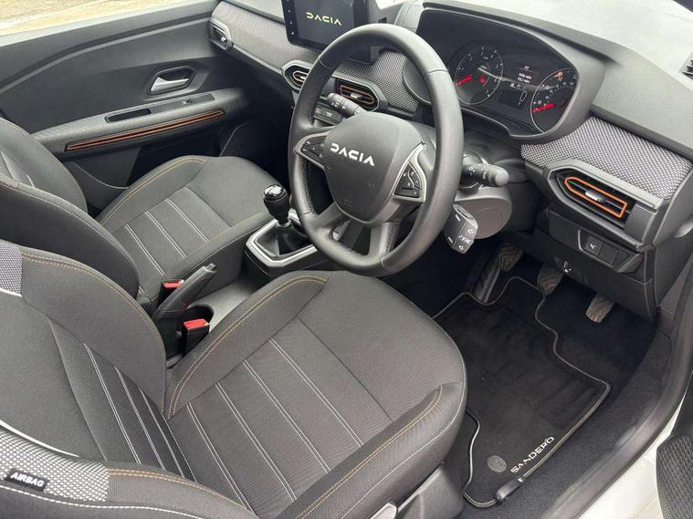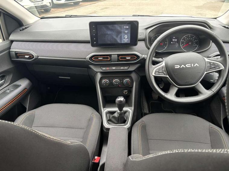 3.5" TFT instrument panel with on-board computer, Cruise control with speed limiter, eCall emergency call system, Eco mode, Electric power assisted steering, Rear parking sensors, Rev counter, Reversing camera, Stop/start system, 8" Media display - DAB radio, smartphone replication, bluetooth, 4 speakers, Apple CarPlay and Android Auto, USB connection for data transfer and charging, USB socket, 3 speed windscreen wipers, Auto lighting, Automatic wipers, Body colour door handles, Body colour door mirrors, Body coloured bumpers, Chrome Dacia inscription on tail gate, Chrome modular roof bars, Chrome radiator grille, Chrome stepway inscription on radiator grille and roof bars, Drivers one touch electric windows, Electrically adjustable and heated door mirrors, Front electric windows, Front fog lights, Heated rear window, High level third brake light, LED automatic daytime running lights, LED Y-shape Dacia signature lighting, Rear electric windows, Rear side wing doors, Rear wash/wipe, Tinted windows, 1/3 to 2/3 split folding rear seats, 12 volt front socket, 12 volt rear socket, 3 height adjustable rear headrests, 3 seat rear bench, Driver and passenger vanity mirror with cover, Fabric upholstery, Fixed smartphone holder on dashboard, Floor mats, Gear shift indicator, Height adjustable drivers seat with armrest, Height adjustable front headrests, Height/depth adjustable steering wheel, Isofix points for child seats in both outer rear seats, Manual air conditioning, Satin chrome interior door handles, Satin Chrome/Copper orange air vents, Single front passenger seat, Soft feel steering wheel, Steering wheel controls, 3x3 point rear seatbelts, ABS and Emergency brake assist, Automatic emergency braking system, Child locks on rear doors, Door open visual and audible warning, Driver airbag, ESC (Electronic Stability Control), ESP + Hill Start Assist, Front curtain airbags, Front seatbelt pretensioners, Front side airbags, Height adjustable front seatbelts, Passenger airbag, Seatbelt reminder for driver and front passenger, Tyre pressure monitor, Automatic central locking, Immobiliser, Keyless entry, Remote central locking, Decopart on instrument panel and door with textile, 16" Flex wheels with full wheel cap,