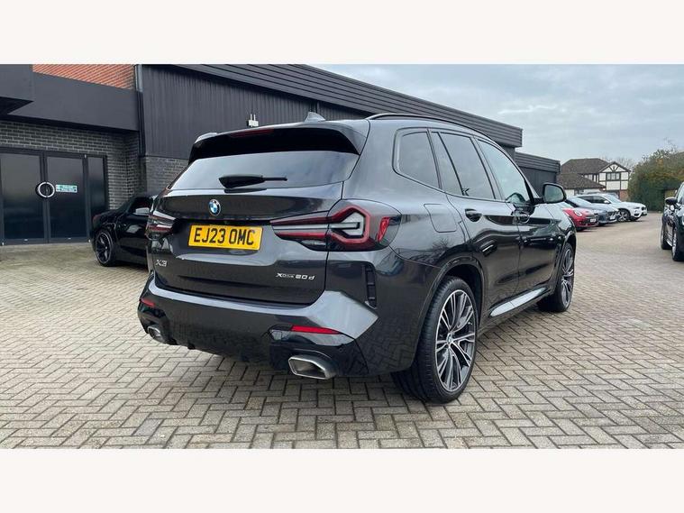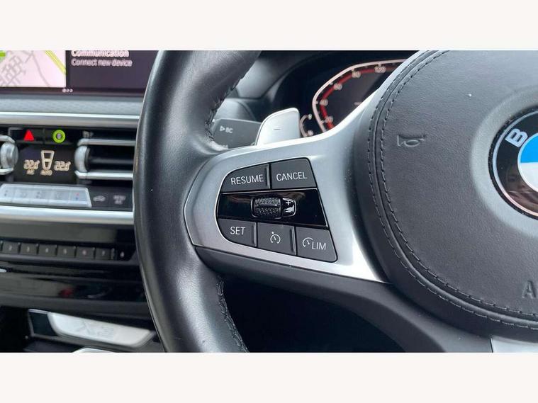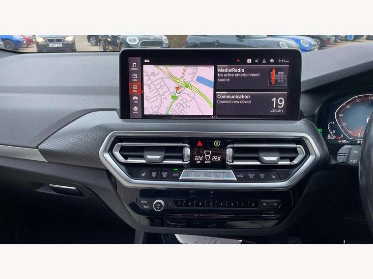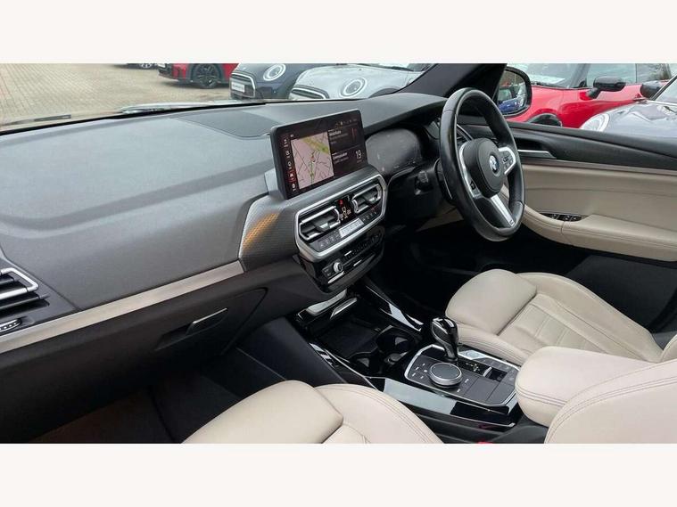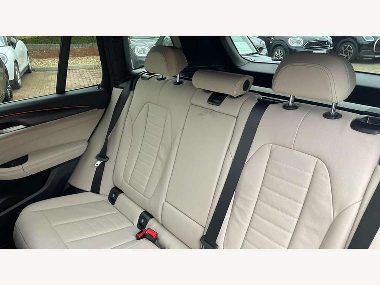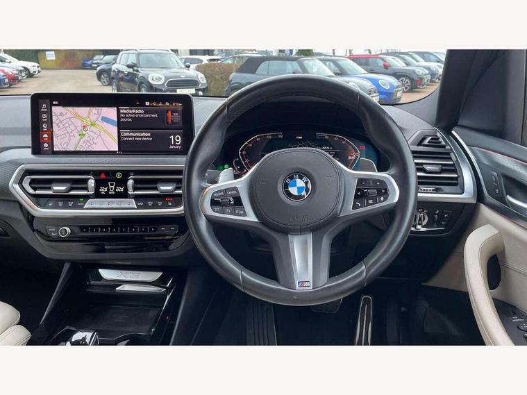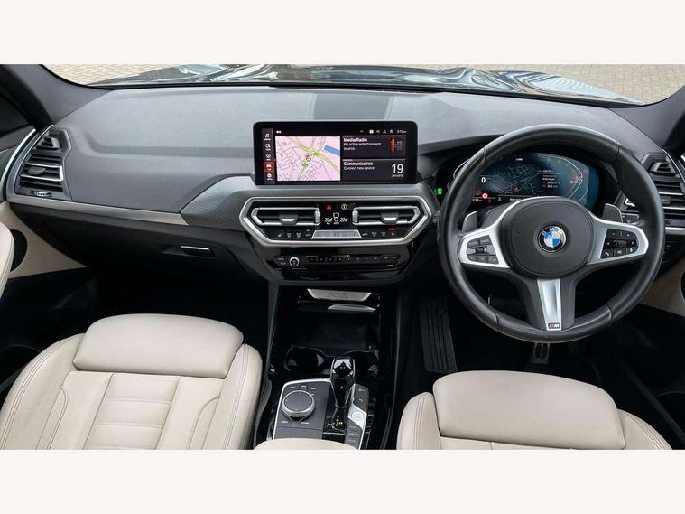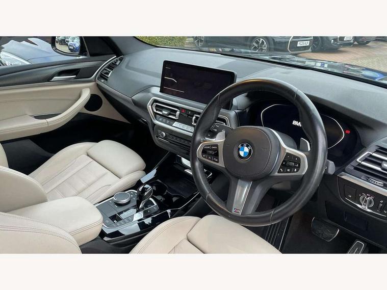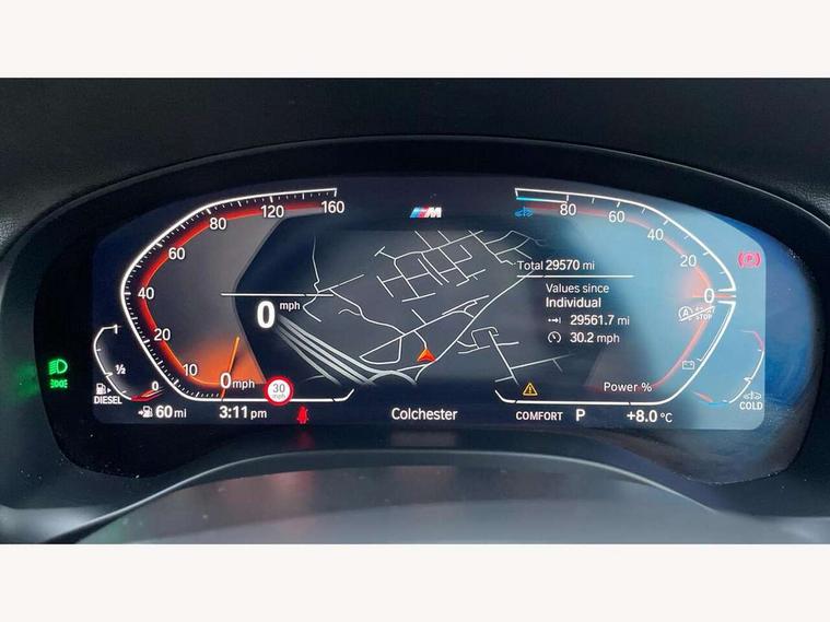 Active Guard, Attentiveness assist, BMW Live Cockpit Professional nav system including 12.3" instrument display + 12.3 high resolution control display, BMW Online services, BMW Teleservices, Brake pad wear indicator in front and rear, Check Control warning system for monitoring of lights and door/luggage compartment open warning, Condition based service - BMW service history, electronic service booklet, integrated owner's handbook, Connected drive services, Electric boot lid, Front/rear Parking distance control, iDrive touch controller with 8 favourite buttons, Instrument cluster with speedometer with mph readout, tachometer, fuel gauge and oil temperature gauge, Lights on warning by audio warning signal when ignition is switched off, Oil sensor for level and grade, warning by check control system, On board computer - average speed+fuel consumption, service interval, clock/date, odometer/trip meter, outside temperature display and ice warning, Optimum shift indicator, Personal Profile - automatic lock when driving away selectable, Run flat indicator, Stop/start system, Variable sports power steering with drive performance control Sport+ mode, Automatic transmission with gearshift paddles, Diesel particulate filter, Incorrect fuelling protection, Larger capacity fuel tank, M sport suspension, Multi-link rear suspension, BMW professional radio/CD/MP3, DAB tuner, Acoustic glazing, Automatic windscreen wipers and automatic headlight, Black finish on B pillars, Body colour door handles, Body colour electric adjust heated aspherical door mirrors, Body colour roof mouldings, Body coloured bumpers, Direction indicator, side repeaters, integrated in exterior mirrors, Dynamic brake lights, Exhaust tailpipes - dual, round, split left and right with chrome finisher, Fingertip control / anti-trap function on electric window, Folding wing mirrors with auto dimming, Follow me home headlights, Front and rear bumper system with replaceable deformation elements, Front and rear electric windows, Gloss chrome tailpipes finishers, Green tinted heat insulating glass, Heated windscreen washer jets, High beam assistant, High gloss black shadow line roof rails, High gloss shadowline exterior trim in decorative moulding side frame/recess cover/guide rail/B, C pillars/mirror frame and triangle with mirror base, High level 3rd brake light incorporating LED Technology, Interior rear view electrochromatic mirror with automatic anti dazzle function, LED tail lights, Lightweight engineering, M aerodynamic bodystyling, M Sport entry door sill strips, Model designation, Rain sensor, Rear side wing doors, Rear wing door, Rear wiper, Shark fin antenna, Side exterior M designation badges, Visible VIN plate, Welcome lighting, Windscreen wipers with adjustable interval, 12V power point in luggage area, 12V power socket in front centre console, 2 x USB Type C ports for charging and data transmission (front centre console) and 2 x USB Type C ports for charging (rear centre console), 3 rear headrests, 3 seat bench in 2nd row, 3 zone automatic air conditioning, 4 lashing points to secure luggage, 40:20:40 split folding rear seat with loading system, Ambient lighting, Anthracite headlining, Automatic interior light when door is opened/ignition switched off or via remote key, Floor mats in velour, Foldable storage floor with compartment, Four grab handles integrated in roof lining, Front and rear bottle holders integrated into door trim storage compartments, Front and rear side armrests integrated into door trim, Front centre armrest with storage compartment, Front footwell lights, Front head restraints, Front passenger seat, Front sports seats, Front/rear courtesy lights with soft on/off dimming, Front/rear reading lights, Heated front seats, Isofix rear child seat preparation, Leather gear knob, Lockable glove compartment, Luggage area underfloor compartment, Luggage compartment lighting, M sport leather steering wheel, Multifunction steering wheel, Parcel shelf removeable and storable under boot floor, Reach and rake adjustable steering column, Rear centre armrest with 2 cupholders, Removable / retractable luggage cover, Slope adjustable rear seats, Storage compartment in rear centre console and front/rear door trims, Sun visors with vanity mirrors and ticket pocket, Toolkit located in luggage compartment, Two front cupholders with removable oddments tray/lid, Connected pro pack - X3, ADB - Automatic Differential Brake, Anti-lock braking system (ABS) with brake assist, Automatic Stability Control (ASC), Battery safety cut-off, BMW emergency call, Brake drying, Brake energy regeneration, Braking pre-tensioning, Child locks on rear doors, Cornering brake control (CBC), Crash Sensor - activation of central locking release, hazard warning light and interior lighting, Deactivation of fuel pump in the event of a crash, Driver and front passenger front and side airbags with passenger deactivation and ITS front and rear head airbags, Driver and front passenger knee airbag, DSC+, Dynamic brake control, Dynamic Traction Control - DTC, Electromechanical parking brake, Hill descent control, Hill start assist, Seatbelt security check for front seats, Side impact protection, Three point seatbelts to all seats with front and outer rear pyrotechnic belt tensioners and seat belt force limiters, Two tone horn, Tyre pressure sensor, Ventilated front and rear disc brakes, Warning triangle and first aid kit, Central locking switch for all doors, fuel filler cap and luggage compartment, Electronic engine immobiliser, Locking wheel nuts, Remote control including two integrated key - one button for open/close all lockable content, windows and separate button for open luggage compartment, Remote control Thatcham category 1 alarm, Start/stop button with Comfort Go keyless engine start and auto Start/stop deactivation button, Low rolling resistance tyres,