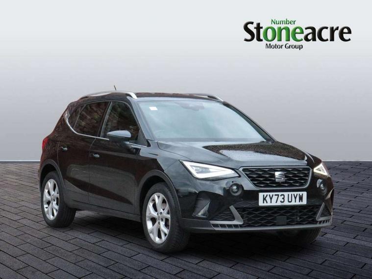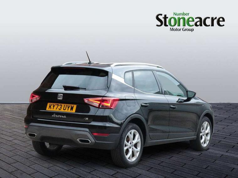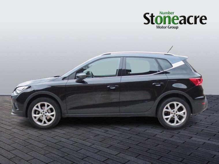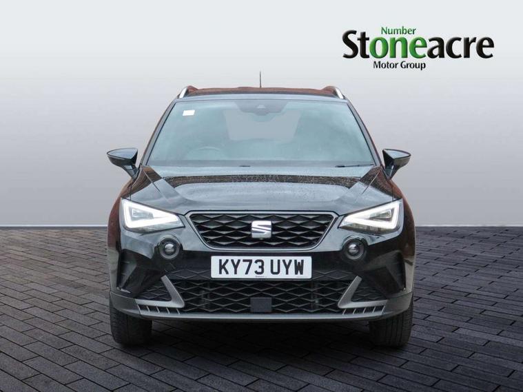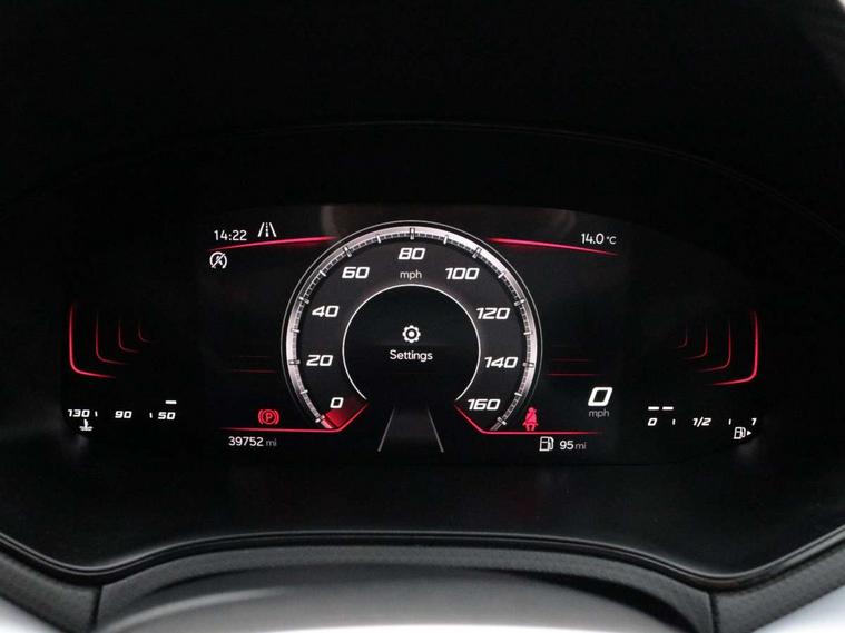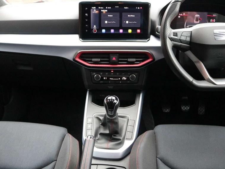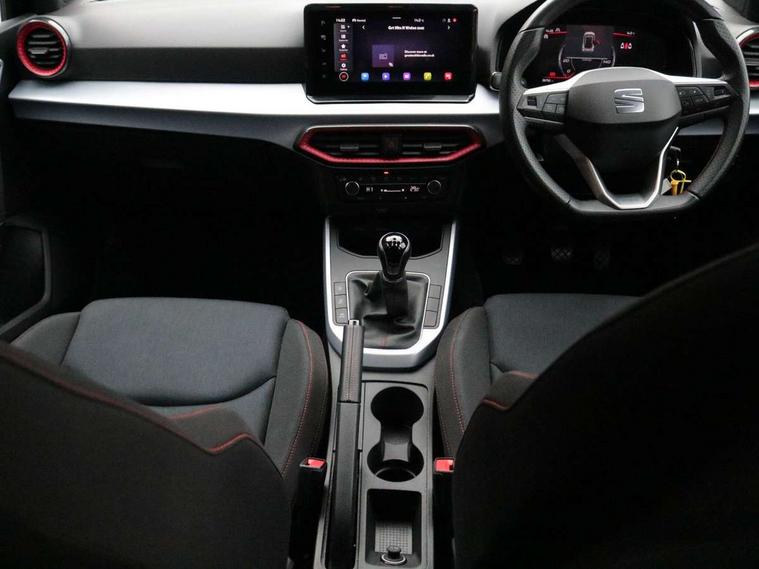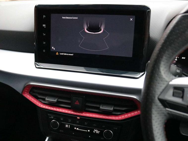 'Lights On' Reminder warning buzzer, 8" Digital cockpit, Digital clock, E-call, Electric speed sensitive power steering, Full Link Smartphone Integration with Mirror Link, Apple Car Play, Google Android Auto with USB Type C cable for Apple and Android compatibility, Lane keeping system, Low fuel warning light, Outside temperature display, Rear parking sensor, RPM counter, Seat connect with safety, service, remote and online, SEAT Drive profile - Four different models normal-sport-eco-individual, steering response, throttle response, Trip computer, Wireless phone charger, 9.2" colour touchscreen with navigation system, voice control and USB port (type c), Bluetooth interface for hands free and audio streaming, DAB digital radio and AM/FM radio, Steering wheel mounted audio controls, Anti theft roof antenna, Auto dimming interior rear view mirror, Automatic activation of hazard warning lights, Body coloured bumpers, Body coloured door handle inserts, Chrome roof rails and window surrounds, Dark tinted rear windows, Electric front/rear windows, Electrically adjustable, heated and folding door mirrors, Front fog lights with cornering function and rear fog light, FULL LED automatic headlights with dynamic headlight range control, coming and leaving home, LED daytime running lights, LED rear tail lights and licence plate lights, Protective side mouldings, Rain sensing wipers, Rear side wing doors, Rear spoiler, Rear window wash/wipe, Roof colour door mirrors, Third brake light, Twin exhaust pipe styling hidden exhaust pipe, Visible VIN plate, Windshield wiper with intermittent control and potentiometer, 2 cupholders, 3 seat bench in 2nd row, 60/40 split folding rear seat, Aircare filter, Black interior roof, Cloth upholstery, Double boot floor, Driver sunvisor with covered mirror + card holder, Dual zone climate control, Front courtesy light with front reading lights, Front sport seats, Gear shift indicator, Height adjustable front seats, Height/reach adjustable steering column, Illuminated boot, Instrument lighting with brightness control, Interior ambient lighting, Interior light in footwell, central console and door panel, ISOFIX points in outer rear seats with top tether anchorage points, Passenger sunvisor with vanity mirror, Perforated flat bottomed leather steering wheel/gear knob/handbrake with red stitching and FR logo, Single front passenger seat, Two front and three rear height adjustable headrests, Interior chrome pack - Arona, 3 point seatbelts on all rear seats, ABS, Active front headrests, Child locks on rear doors, Driver and front passenger airbags with front passenger airbag de activation, front side and curtain airbags, Electronic stability control, Emergency Brake Assist (EBA) and front assist, Front and rear seatbelt reminder, Hill hold control, Multi-Collision braking, Tiredness recognition system, Traction control, Tyre pressure monitoring system, Alarm with back-up horn, Electronic engine immobiliser, Locking wheel bolts, Remote central locking + deadlocks, Tow away protection, Titan black dashboard, 17" Dynamic alloy wheels,