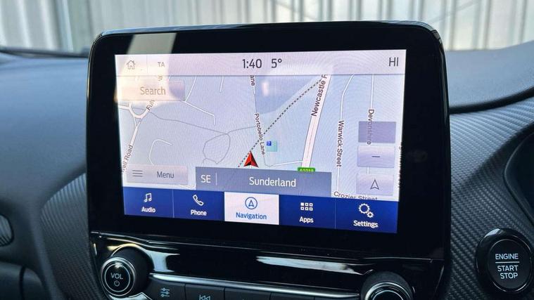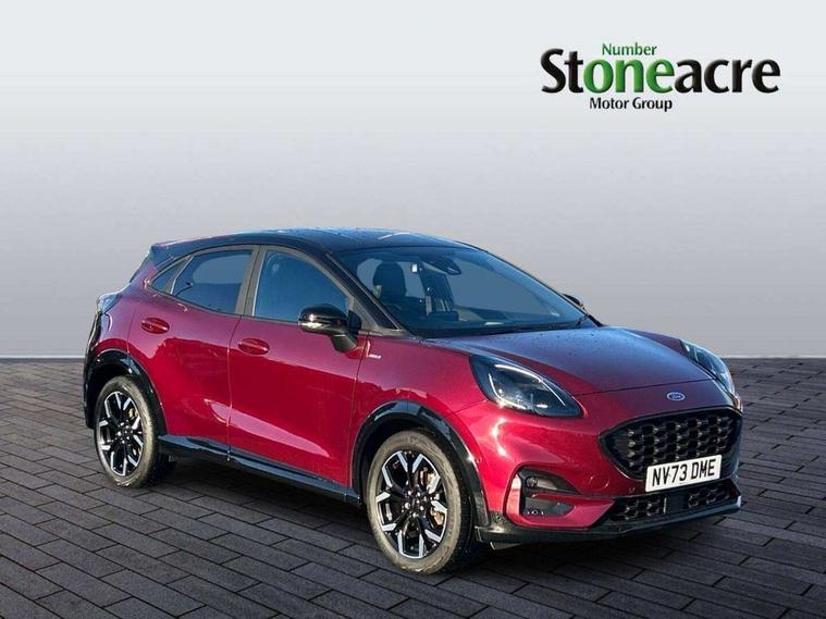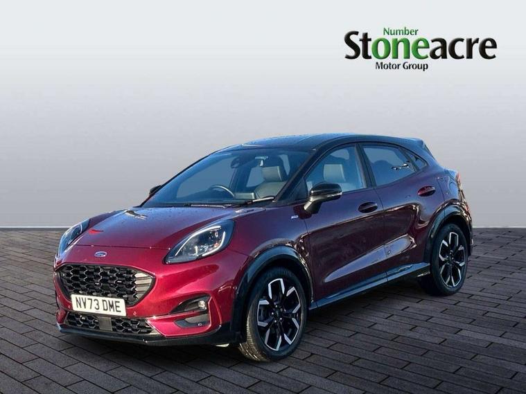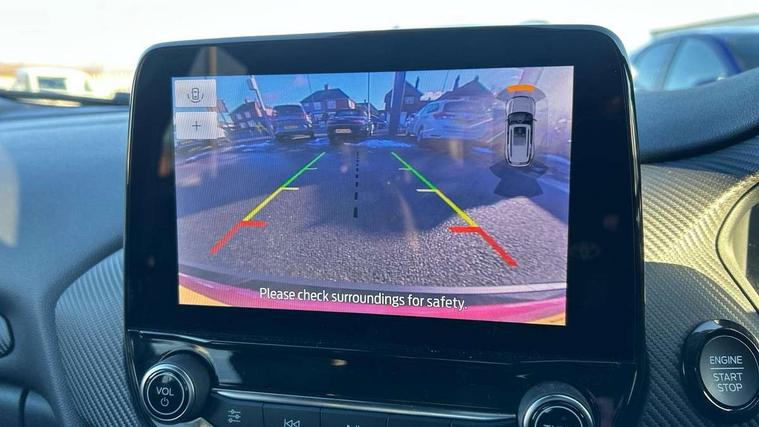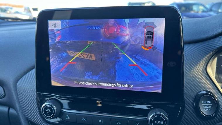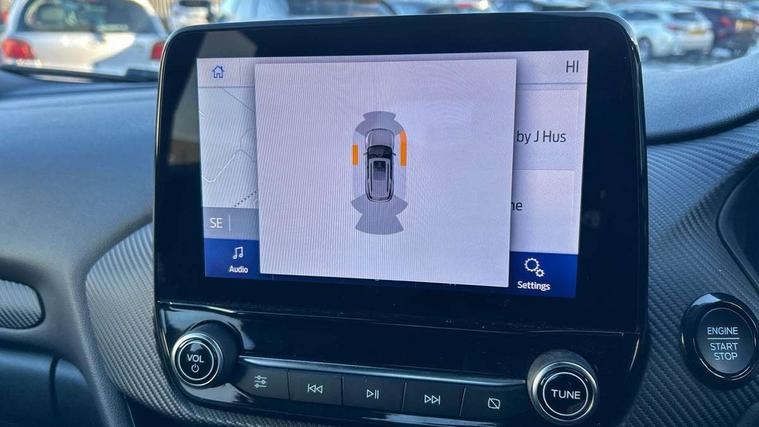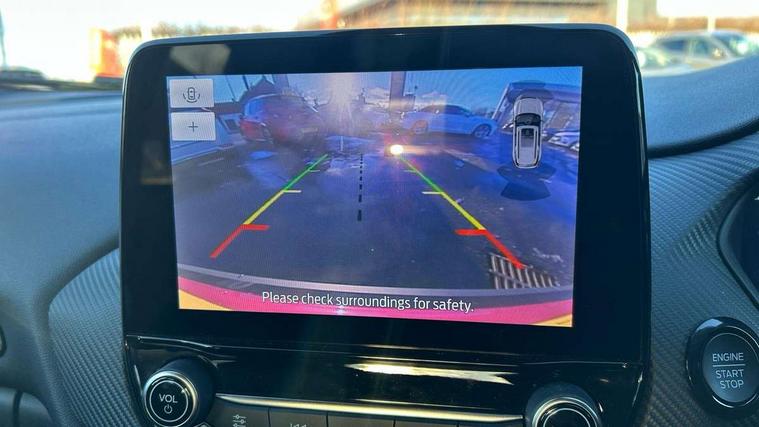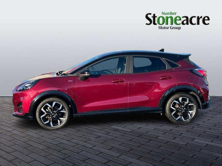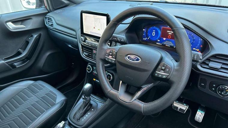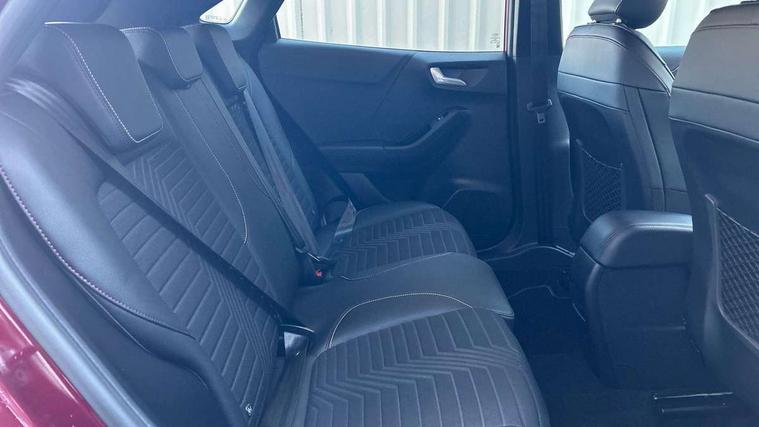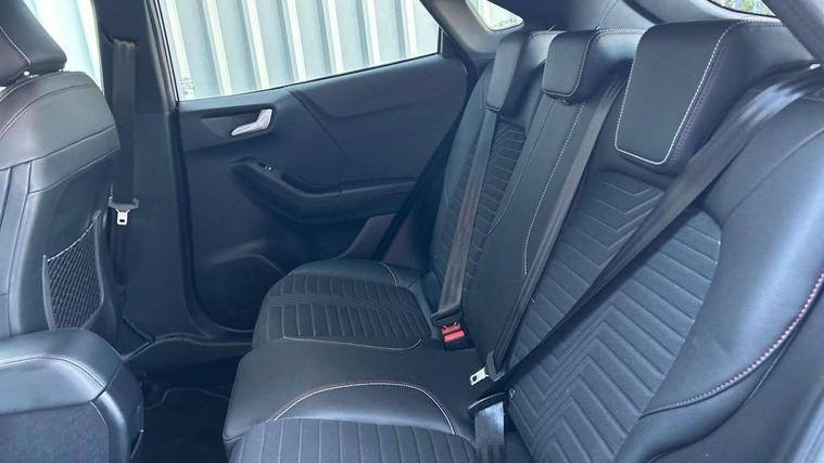 Driver impairment monitor, Emergency call service, Ford easy fuel, Full digital 12.3" instrument cluster, Hands free power tailgate with keyless entry system, Lane keeping aid with lane departure warning, Power assist steering, Power start button, Rear parking sensor, Selectable drive modes(Normal, Eco, Sport, Slippery and Trail), Speed sign recognition, Sport suspension, Automatic headlights with auto high beam, Automatic rain sensing wipers, Black contrast roof including A pillars, rear roof spoiler and door mirrors, Exclusive paint, Front fog lamps, LED daytime running lights, LED rear lamps, Power foldable heated door mirrors with puddle lamps, Privacy glass to side rear windows and tailgate glass, Quickclear heated windscreen, Rear side wing doors, Rear wiper, ST-Line body styling kit with unique grille and large rear spoiler, Third brake light, 3 seat bench in 2nd row, Centre console with armrest and stowage, Ford megabox extended bootspace, Front and rear head restraints, Front floor mats, Manual 4 way driver seat adjust with lumbar adjustment, Manual 4 way passenger seat with lumbar seat adjustment, Sensico partial premium upholstery, Single front passenger seat, ST-Line flat bottomed sensico leather steering wheel with leather handbrake and aluminium gear knob, Wireless charging pad with electronic air temperature control (EATC), B&O Premium Audio system + Ford SYNC 3 navigation pack - Puma, Driver assistance pack - Puma for automatic transmission, Winter pack - Puma, 3 rear seatbelts, Child safety lock, Electronic stability control (ESC) and hill start assist, Pedestrian/cyclist detection & post-collision braking, Pre collision assist system, Tyre pressure monitoring system (TPMS), Thatcham alarm, Carbon look interior deco spears, 18" 5 spoke matt black finish alloy wheels,