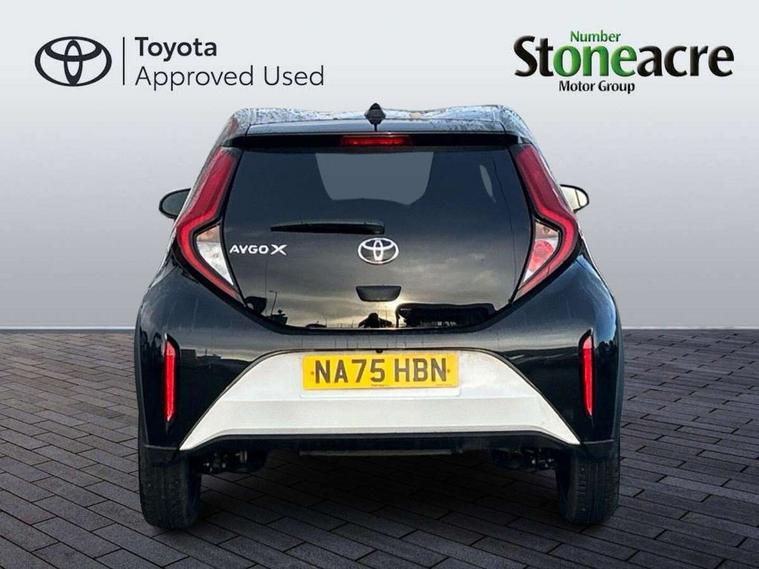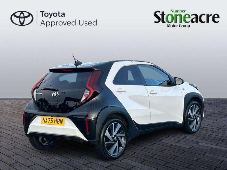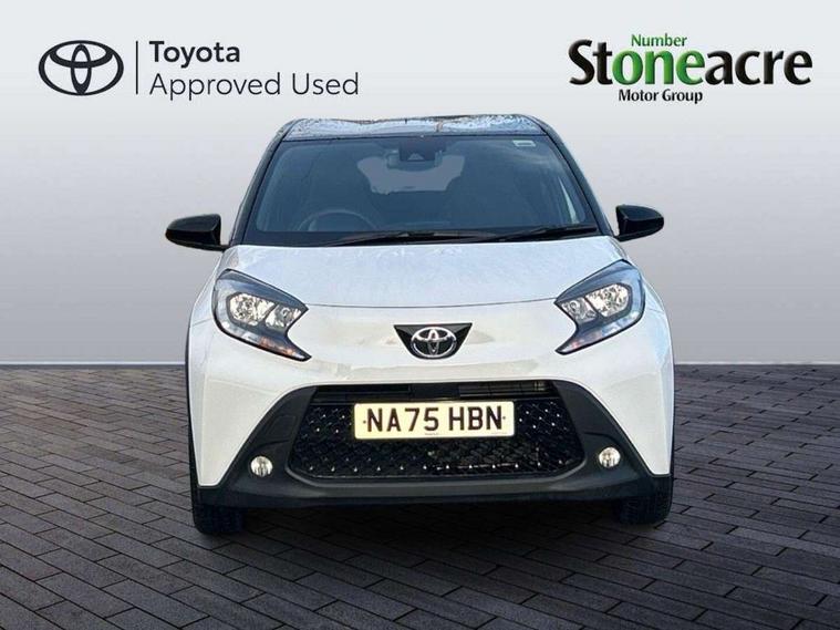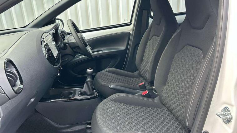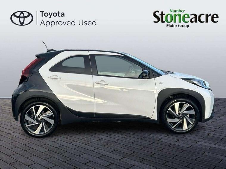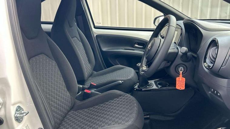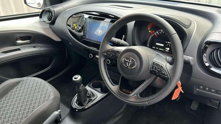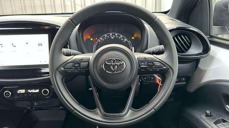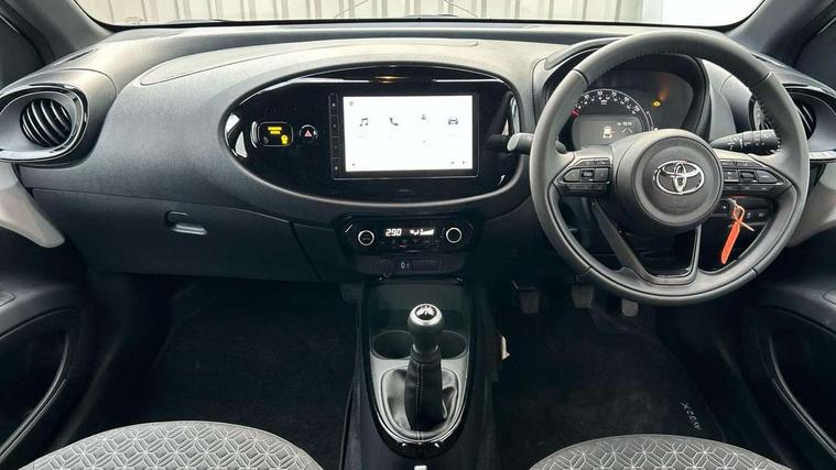 4.2" TFT colour screen, Adjustable speed limiter, Analogue speedometer, Bluetooth connectivity, Digital tachograph, Driver attention alert system, eCall emergency call system, Electric power steering, Intersection turn assist, Key reminder warning, Noise reduction kit, Pre collision system with emergency steering assist, Reversing camera with static guide lines, Smart phone integration with Apple car play/Android Auto, Speed limit display, Start and stop, Vehicle Stability Control (VSC), 4 speakers, 9" HD multimedia display touch screen with Toyota smart connect, DAB digital audio broadcast, USB connector, Auto headlights, Auto wipers, Automatic headlights cut-off, Bicycle towing hook, Black contrast roof, Black side protection mouldings, Black wheel arch mouldings, Body colour door handles, Body coloured front bumper, Boot door scuff plate, Eclipse black rear bumper, Electric heated door mirrors, Follow me home headlights, Front fog lights, Front power windows, Gloss black door mirrors, Gloss black upper front grille, Headlight cut-off reminder, LED daytime running lights, LED front light guide, LED High mounted stop lamp, Manual day/night rear view mirror, Manual headlight levelling, Pagoda roof, Power adjustable door mirrors, Power back door, Privacy glass, Projector halogen headlights, Rain sensor, Rear combination lights LED bulb type, Rear side wing doors, Rear windscreen defogger, Rear windscreen wiper, Short antenna, Variable intermittent windscreen wipers, 12v power outlet - front, 2 seat bench in 2nd row, 3 spoke leather steering wheel, 50/50 split folding rear seat, Adhesive roof headlining, Adjustable speed limiter switch on steering wheel, Audio and telephone switches on steering wheel, Auto air conditioning, Black insert on steering wheel, Black roof lining, Boot light, Centre room light, Chrome interior door handles, Chrome surround on air conditioning buttons, Clean air filter, Console box storage in body color, Fabric upholstery, Floor mats, Front and rear cup holders, Front head rest deco art, Front head restraints, Height adjustable driver seat, Intelligent adaptive cruise control switch on steering wheel, ISOFIX child restraint system on rear seats, Lane departure alert switch on steering wheel, Leather gearshift knob, Manual tilt steering wheel, Manually reclining and sliding driver seat, Manually reclining and sliding front passenger seat, Multimedia switches on steering wheel, Pollen filter, Rear door pockets, Rear head restraints, Satin silver insert on gear shift knob, Single compartment glovebox with lights, Single front passenger seat, Soft tonneau cover, Sun visors with mirror on driver and passenger side, Voice recognition switch on steering wheel, Toyota safety sense pack - Aygo X, Anti lock braking system + Electronic brake force distribution, Child safety door lock, Emergency brake light signal (EBS), Hill start assist control (HAC), Passenger airbag on/off switch, Seat belt reminder for front and rear seats, Supplement restraints system (SRS) - 6 airbags, Traction control, Tyre pressure warning system, Immobiliser, Remote power door locks, Black wheel centre caps, Tyre repair kit,