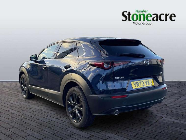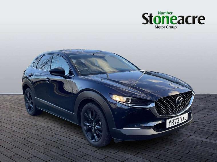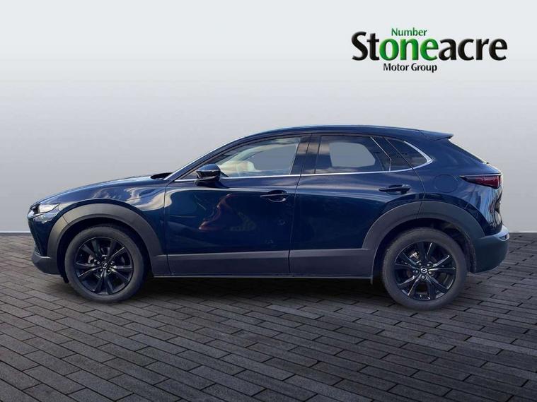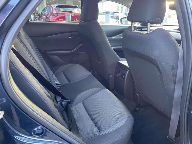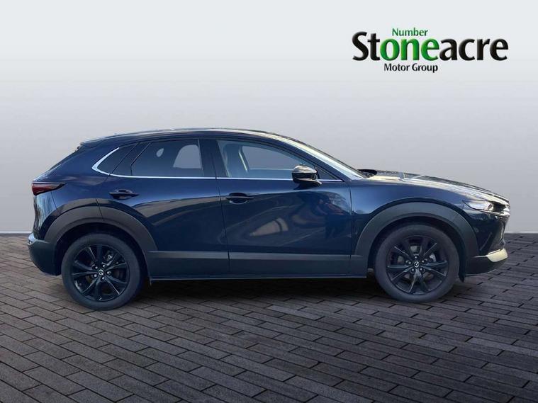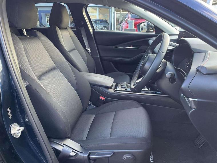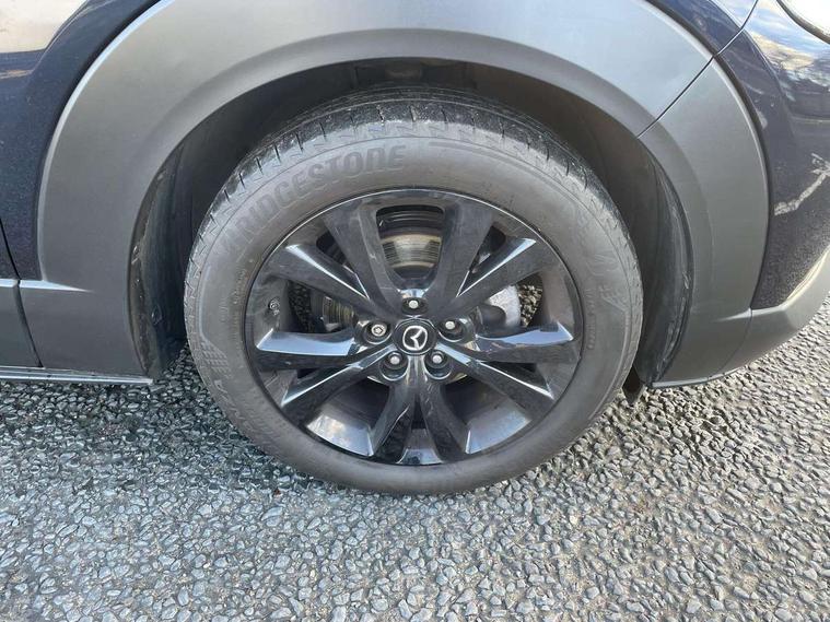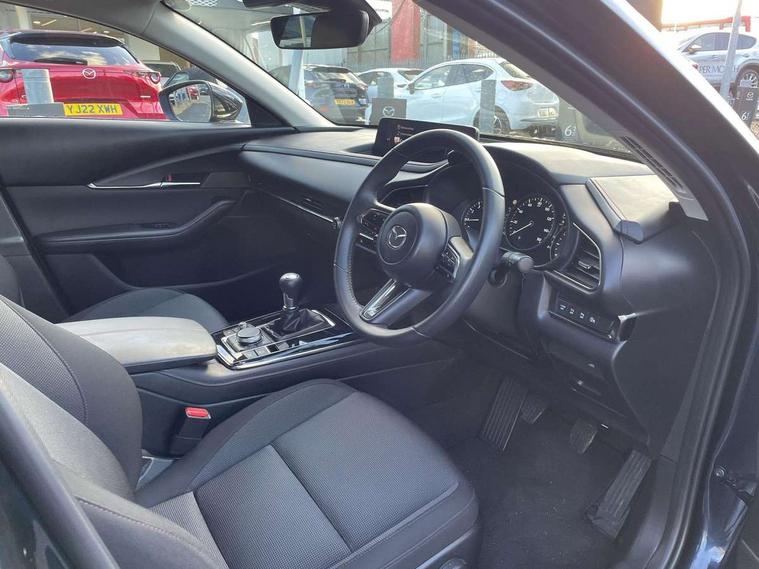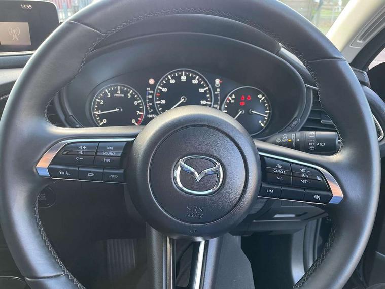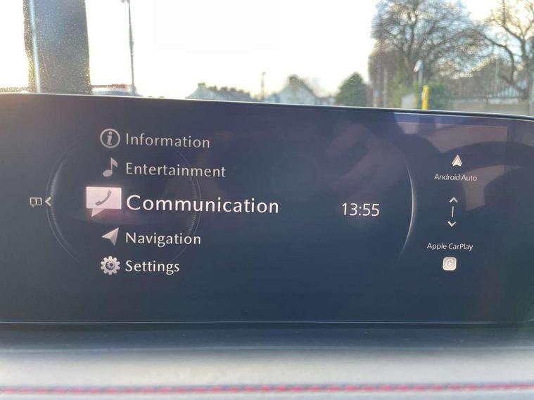 10.25" display with Mazda Connect infotainment, 7" TFT Colour driver instrument panel display, Adaptive cruise control (Mazda radar cruise control), Blind spot monitoring with rear cross traffic alert, Driver attention alert system, E-call with GPS, Emergency stop signalling system, Engine start/stop button, Front and rear parking sensors, Integrated bluetooth, Integrated Mazda navigation system, Intelligent speed assist, Lane keep assist system (LAS) with Lane departure warning system (LDWS), Mazda connected services, PAS, Power lift gate, Qi wireless charging, Reversing camera, Service indicator, Tailgate, Traffic sign recognition, Trip computer, Windscreen projected colour active driving display (HUD), Wireless Apple CarPlay/Android Auto, Cylinder Deactivation, i-stop, 2 USB charging ports in front inner central armrest, AM / FM / DAB radio with 8 speakers, Multimedia Commander including separate volume dial, Steering wheel mounted audio/bluetooth controls, Auto dimming rear view mirror, Auto headlight levelling, B-pillar and C-pillar garnishes in piano black finish, Black electrically adjustable, heated auto power folding door mirrors with integrated indicators, Chrome finish signature wing in front grille, Coming/leaving home lighting function, Dual chrome exhaust, Dusk sensing headlights, Electric front/rear windows with one touch auto up/down, Front kodo turn signal, Gloss black front grille, Gloss black rear roof spoiler, LED headlights with halogen daytime running lights and high beam control, LED rear combination lights, Privacy glass (rear side windows and rear screen), Rain sensing front wipers with adjustable speed and intermittent wipe, Rear fog lights, Rear side wing doors, Rear wiper, Third brake light, 12V power outlet in centre console, 3 seat bench in 2nd row, 60/40 split fold down rear seats, Chrome interior trim accents with steering wheel centre bezel, surround of engine start / stop button and glove box handle, Cloth upholstery with red stitching and interior accents, Dark cloth door panel inserts, Dashboard, door cards and front centre armrest in black cloth with red stitching, Driver and front passenger visors with covered vanity mirror and driver ticket holder, Driver seat manual slide, recline, height and seat tilt adjust, Driver, front passenger and two rear door storage, Driver, Front passenger and two rear grab handles with coathooks, Dual zone climate control air conditioning with rear air vents, Folding rear centre armrest with two cup holders, Front and rear (x3) head restraints, Front and rear LED lighting, Front armrest, Front centre storage with two cupholders, Front passenger seatback pockets, Front passengers seat manual slide, recline and height adjustment, Gear shift indicator, Glovebox illumination, Heated front seats with 3 stage setting, ISOFIX child seat anchorage points attached on outer rear seats, Leather wrapped gear shift knob, Leather wrapped steering wheel with telescopic and tilt adjustment, LED luggage compartment lighting, Light roof headlining and pillars, Roof mounted sunglasses holder, Single front passenger seat, 3 point ELR front seat belts x2 with pretensioners, 3 point ELR rear seat belts, Anti-lock braking system (ABS), Drivers knee airbag, DSC - Dynamic Stability Control, Electronic parking brake with auto disengage function and auto hold function, Front and rear curtain airbags, Front dual stage driver and single stage front passenger airbags, Front passenger airbag cut-off switch, Front side airbags, Front smart city brake support, G-Vectoring control plus, Hill launch assist, Manual child lock in rear doors, Mild Hybrid system with regenerative braking, Seatbelt reminder for driver/front passenger and rear seats, Traction control system (TCS), Tyre pressure monitoring system (TPMS), Remote central locking with deadlocking and automatic door lock when driving, Smart keyless entry, Thatcham accredited alarm and immobiliser, 18" Black metallic alloy wheels, Emergency tyre repair kit,