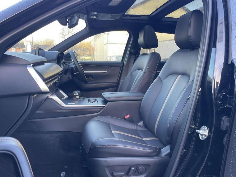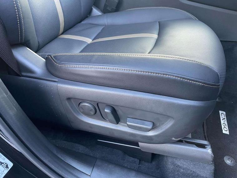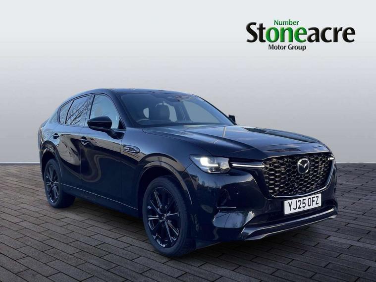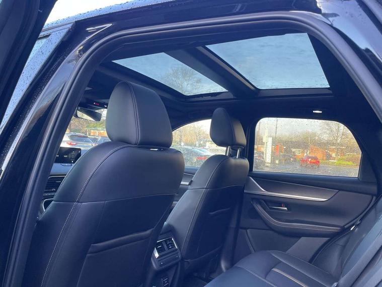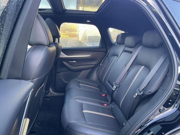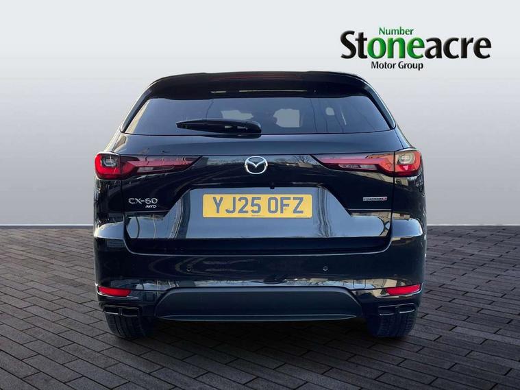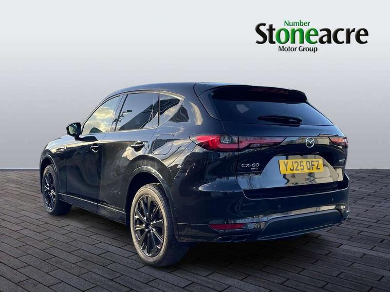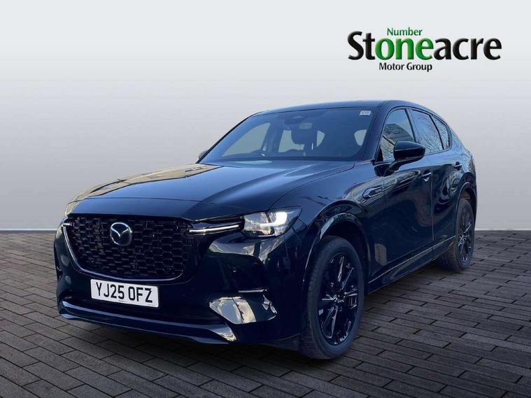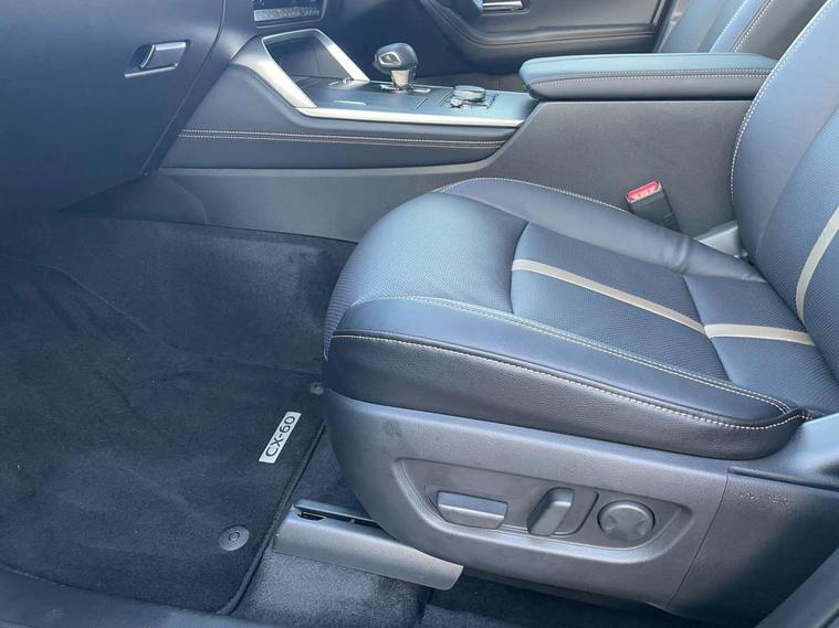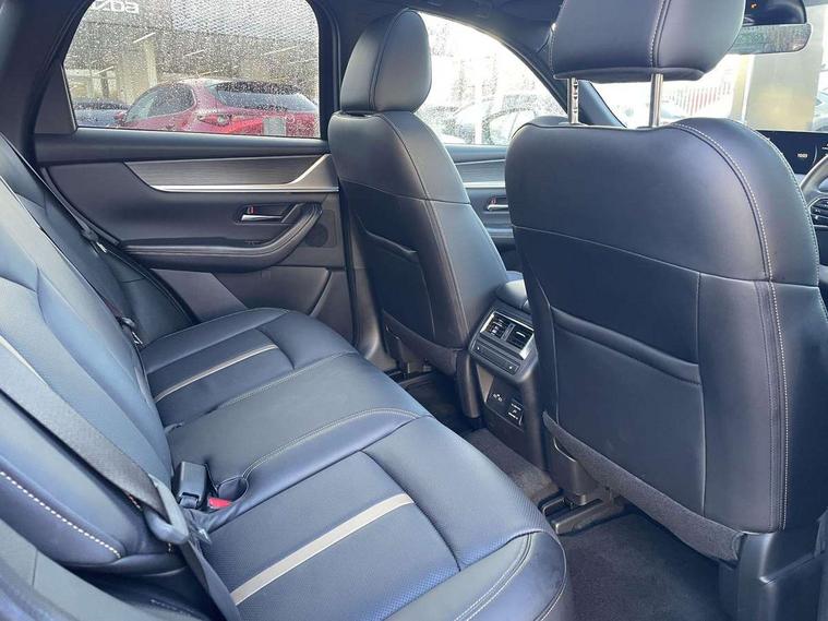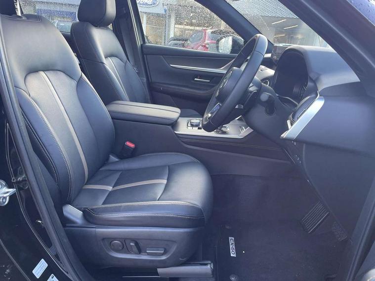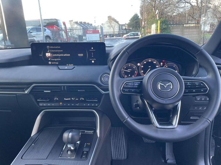 Emergency lane keeping with blind spot assist, Low washer fluid warning light, 12.3" Colour entertainment centre display with mazda connect infotainment, 12.3" TFT Colour display, Adjustable speed limiter, Blind spot assist, Blind spot monitoring with rear cross traffic alert, Distance alert system, Driver attention alert system, Driver Monitoring with personal identification, E-call with GPS, Emergency stop signalling system, Exit warning function, Front and rear parking sensors, Ingress / Egress support and automatic driver position guide, Integrated bluetooth, Intelligent speed assist, Kinematic posture control, Lane keep assist system (LAS) with Lane departure warning system (LDWS), Mazda Driver Personalisation System, Mazda hybrid navigation system with european mapping, Multimedia Commander, PAS, Power lift gate with handsfree function, Power start/stop button, Speed alert, Traffic sign recognition enhanced with mandated excessive speed warning, Trip computer, Windscreen projected colour active driving display, Wireless apple car play/android Auto, Internal Combustion Engine Sound Emulator, Mi-Drive (Normal, Sport, Off-road, Towing and EV mode), Paddle shift, AM/FM and DAB radio, Bose surround sound system with 12 Speaker, Bose center point, Bass match and audio pilot technology, Steering wheel mounted audio/bluetooth controls, USB-C inputs (x2 front and x2 rear), Auto dimming driver's door mirror, Automatic headlight levelling, B-pillar and C-pillar garnishes in gloss black finish, Body colour roof spoiler, Body coloured bumpers, Body coloured lower bumper, wheel arch and side mouldings, Coming/leaving home lighting function, Dark plated headlight lense, Dark plating finish signature wing in front grille, Dark plating front side garnish, Differentiated front bumper design to accentuate the intake, Dusk sensing headlights, Electric front/rear windows with one touch auto up/down, Electric panoramic sunroof, Electrically adjustable, heated auto power folding door mirrors with memory, Frameless auto dimming interior rear view mirror, Front kodo turn signal, Front wiper de-icer, Gloss black door mirrors, Headlight washers, High beam control, Honeycomb radiator grille in piano black, LED 3rd brake light, LED rear signature combination lamps, Rain sensing front wipers with adjustable sensitivity and speed, Rear side wing doors, Rear wiper, Roof pillars and roof lining finished in lighter colour to soften the overall look, Signature LED daytime running lights, Silver decoration panel, 12v power outlet - front, 12V socket in boot, 3 height adjustable rear headrests, 3 seat bench in 2nd row, 40/20/40 split folding rear seats with quick levers in the boot, Ambient lighting, Cargo net, Chrome interior trim accents with steering wheel centre bezel, surround of engine start / stop button and glove box handle, Door panel trim vinyl leather with armrest, Driver and front passenger two rear grab handles with rear coat hooks, Driver and front passenger visors with covered vanity mirror and driver ticket holder, Driver seat electric tilt, slide, recline, height and lumbar adjustment, Driver, front passenger and two rear door pockets, Driver/passenger front seatback pockets, Dual zone climate control air conditioning with rear air vents, Electric telescopic and tilt adjustment steering wheel, Featuring black vinyl leather dashboard trim with titanium coloured accents, Folding rear centre armrest with two cup holders, Front centre storage with two cupholders, Front down lamp with front and rear foot lamps, Front headrests, Front passengers seat electric slide, recline, height and lumbar adjustment, Front seat ventilation with 3-stage setting, Glovebox illumination, Heated front seats with 3 stage setting, Heated leather wrapped steering wheel, Heated outer rear seats with 3-stage setting, ISOFIX child seat anchorage points attached on outer rear seats, Karakuri tonneau cover, Leather wrapped gear shift knob, LED illumination luggage compartment, Nappa leather upholstery, Practical and spacious front centre armrest storage, Rear seat recline function for rear passenger comfort, Remote fold down rear seats, Remote pre-heating/cooling, Roof lining (ceiling and pillars) - Black, Roof mounted sunglasses holder, Single front passenger seat, Convenience Pack - CX-60, Driver Assistance Package - CX-60, 3 point ELR front seat belts x2 with pretensioners, 3 point ELR rear seat belts, Active bonnet, Anti-lock braking system (ABS), Drivers knee airbag, DSC - Dynamic Stability Control, Electronic parking brake with auto disengage function and auto hold function, Front and rear curtain airbags, Front dual stage driver and single stage front passenger airbags, Front passenger airbag cut-off switch, Front side airbags, Front smart city brake support, Hill decent control, Hill launch assist, Manual rear child locks, Seatbelt reminder for driver/front passenger and rear seats, Traction control, Tyre pressure monitoring system (TPMS), Remote central locking with deadlocking and automatic door lock when driving, Smart keyless entry, Thatcham accredited alarm and immobiliser, Mesh metal film centre console panel, 20" Black metallic alloy wheels, Emergency tyre repair kit,