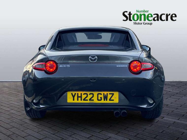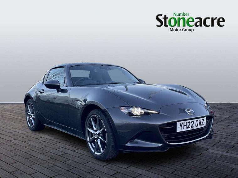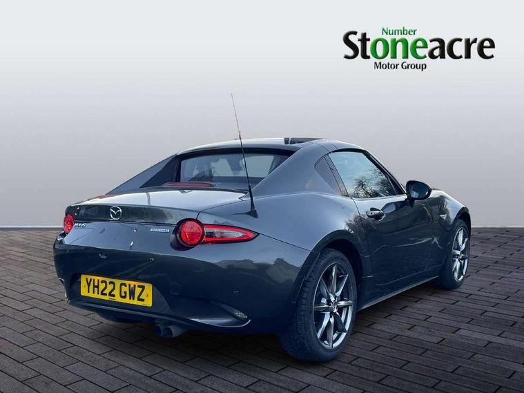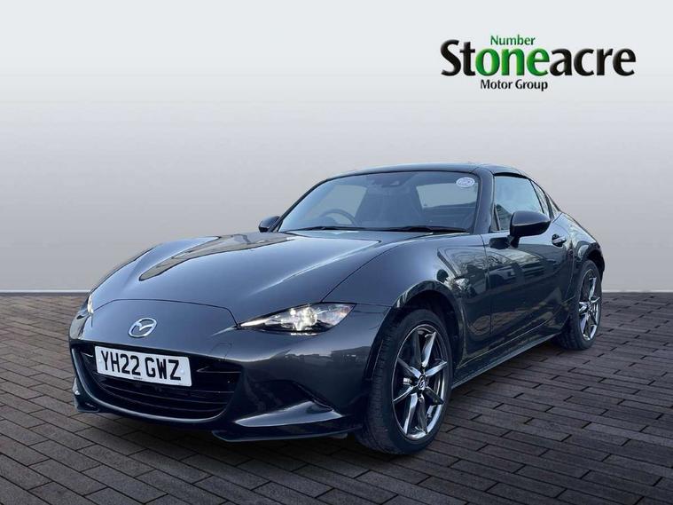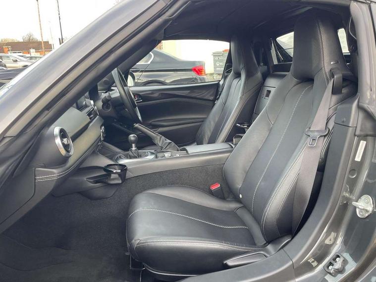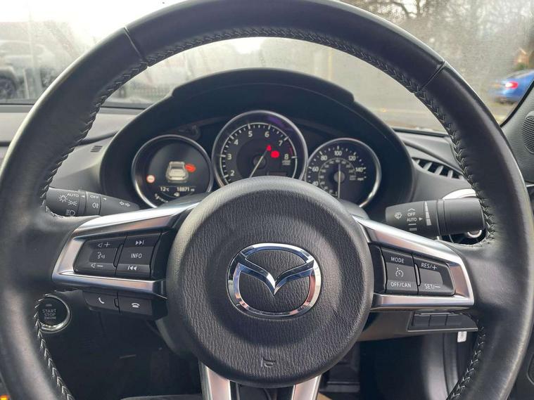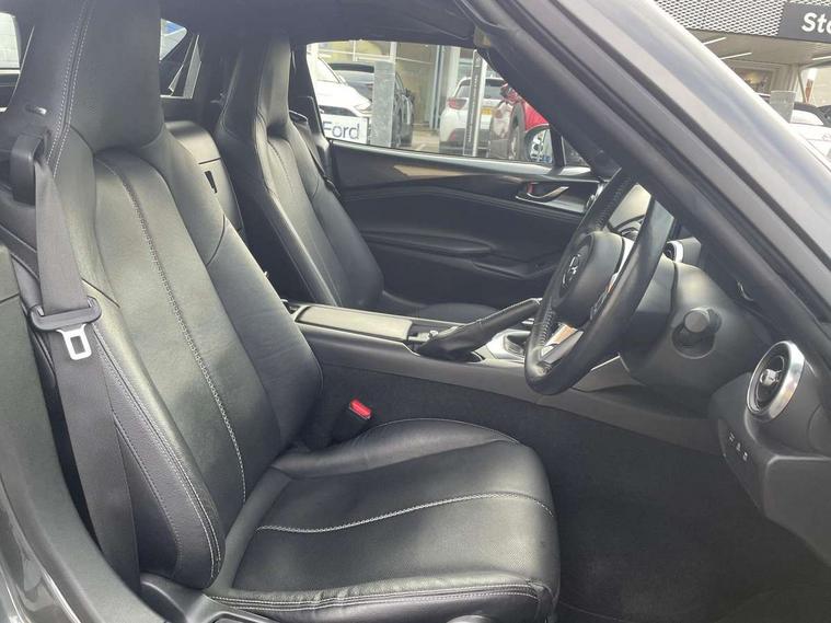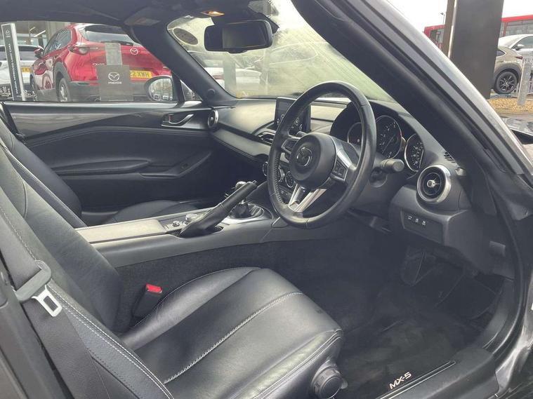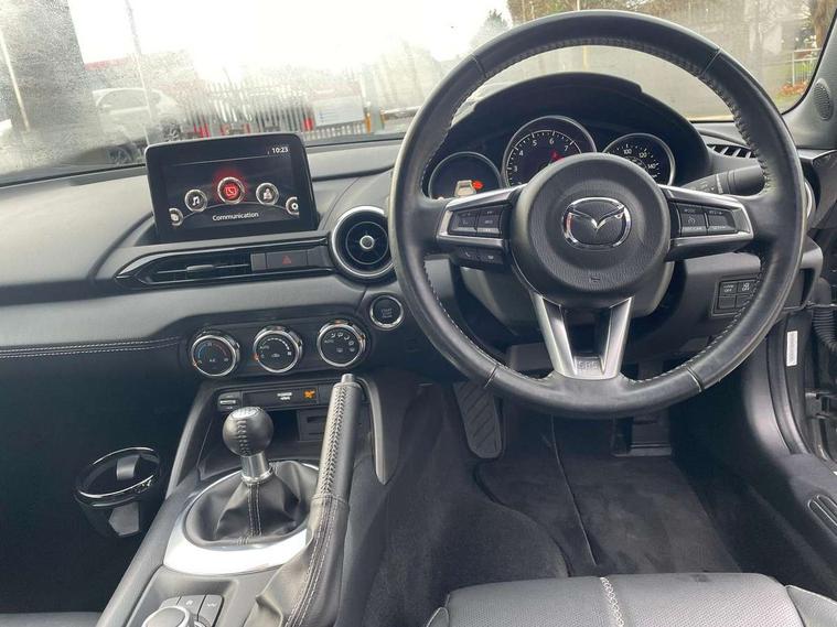 7" colour touch screen with Mazda connect infotainment, Aha and stitcher app, Analogue speedometer, Apple car play/Android Auto, Blind spot monitoring with rear cross traffic alert, Cruise control + speed limiter, Driver alert system, eCall emergency call system, Emergency stop signalling system, Engine start/stop button, Hands free phone preparation, Integrated bluetooth with hands-free calling, bluetooth audio and easy access to phone contacts, Integrated navigation system, Lane departure warning system, Multi dot display tachometer and electric odometer, PAS, Rear parking sensor, Reversing camera, Service indicator, Traffic sign recognition, Trip computer, Water temperature gauge, I-ELOOP, i-stop, Limited slip differential, Sports suspension featuring Bilstein dampers, 2 USB/aux input socket, Multimedia Commander including separate volume dial, Premium Bose sound system with 9 speakers with 2 in each front headrest, AM/FM/DAB radio and MP3, Steering wheel mounted audio/bluetooth controls, Adaptive LED Headlights, Auto dimming rear view mirror, Automatic headlamp levelling, Black scuff plates with stainless steel insert, Body colour bumpers, Body colour co ordinated interior upper door trim, Body coloured electric/heated door mirrors, Coming/leaving home lighting function, Dual exhaust pipes, Dusk sensitive headlamps, Electric front windows/one touch facility, Electrically operated body colour retractable hard top with heated rear glass window, High mounted rear brake light with Black coloured cover, LED 3rd brake light, LED daytime running lights, LED indicator lights, LED rear lights, Piano Black fashion bars, Rain sensing front wipers, 12V socket, Centre console storage box, Chrome Air conditioning dials, Climate control air conditioning, Coin Box, Driver and front passenger sunvisors with covered vanity mirror and driver ticket holder, Driver seat manual slide, recline and tilt adjustment, Front centre armrest, Front head restraints, Gear shift indicator, Heated front seats, in 3 heat levels, Interior courtesy light, ISOFIX front passenger seat child seat compliance, Leather gear knob, Leather handbrake lever, Leather steering wheel, Lockable rear centre box with lid, Passenger seat + manual slide/recline adjust, Perforated leather upholstery, Side door trim in black vinyl with silver stitching, Single front passenger seat, Sports seats, Strut brace, Tilt/telescopic steering column, Transparent windblocker, Two cupholders, 3 point ELR front seatbelts with pretensioners, ABS+Electronic Brake force Distribution, Deployable Hood System (DHS), Driver and front passenger airbags, Driver and passenger seatbelt reminder audible warning, Front dynamic yaw stability control, Hill hold assist, Passenger airbag deactivate switch, SCBS - Smart City Brake Support, rear plus front with autonomous emergency braking, Side airbags, Traction control, Tyre pressure monitor, Remote central locking with deadlocking and remote boot release, Smart keyless entry, Superlocking, Thatcham category 1 alarm + immobiliser, Chrome air vent surrounds, Chrome meter rings, Dashboard panel - vinyl leather Black, 17" Bright Silver alloy wheels, Tyre puncture repair kit,