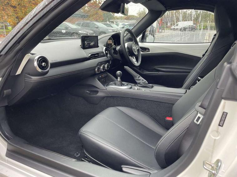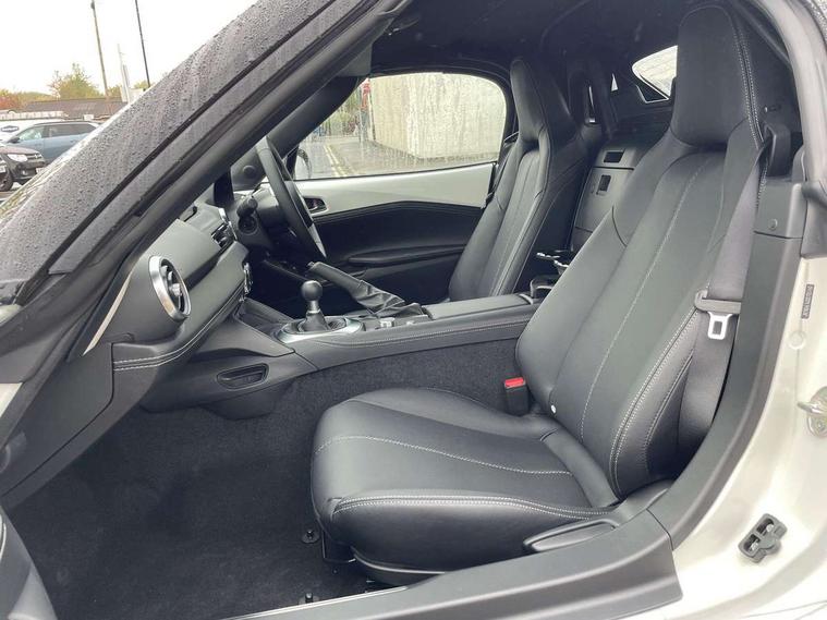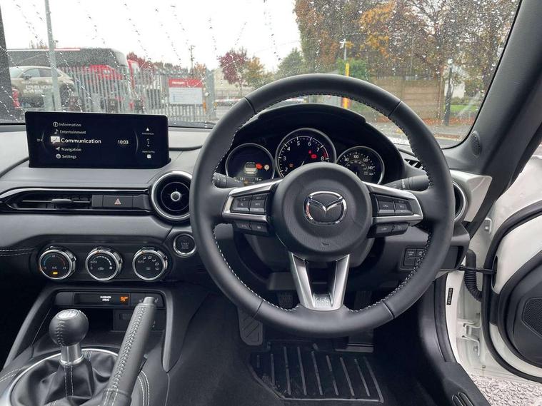 8.8" Colour centre touch screen display with Mazda Connect infotainment, Aha and stitcher app, Analogue speedometer, Apple car play/Android Auto, Cruise control with Intelligent speed assist, Driver alert system, eCall emergency call system, Emergency stop signalling system, Engine start/stop button, Hands free phone preparation, Integrated bluetooth with hands-free calling, bluetooth audio and easy access to phone contacts, Integrated navigation system, Kinematic posture control, Lane departure warning system, Lane keep assist, Multi dot display tachometer and electric odometer, PAS, Rear parking sensor, Service indicator, Traffic sign recognition, Trip computer, Water temperature gauge, I-ELOOP, i-stop, 2 x USB Type-C inputs, Multimedia Commander including separate volume dial, Premium Bose sound system with 9 speakers with 2 in each front headrest, AM/FM/DAB radio and MP3, Steering wheel mounted audio/bluetooth controls, Adaptive front lighting system, Automatic headlamp levelling, Black scuff plates with stainless steel insert, Body colour bumpers, Body colour co ordinated interior upper door trim, Body coloured electric/heated door mirrors, Coming/leaving home lighting function, Dual exhaust pipes, Dusk sensitive headlamps, Electric front windows/one touch facility, Exterior body colour co ordinated upper door panel trim with black vinyl and silver stitching, Frameless auto dimming rear view mirror, Front intermittent wipers, LED 3rd brake light, LED daytime running lights, LED headlights with automatic headlight levelling, LED indicator lights, LED rear lights, Manually operated black premium cloth soft top with heated rear glass window, Piano Black fashion bars, Rain sensing front wipers, Rear boot, 12V socket, Centre console storage box, Chrome Air conditioning dials, Climate control air conditioning, Coin Box, Driver and front passenger sunvisors with covered vanity mirror and driver ticket holder, Driver seat manual slide, recline and tilt adjustment, Front centre armrest, Front head restraints, Gear shift indicator, Heated front seats, in 3 heat levels, Interior courtesy light, ISOFIX front passenger seat child seat compliance, Leather gear knob, Leather handbrake lever, Leather steering wheel, Lockable rear centre box with lid, Passenger seat + manual slide/recline adjust, Perforated leather upholstery, Single front passenger seat, Tilt/telescopic steering column, Two cupholders, Windblocker, 3 point ELR front seatbelts with pretensioners, ABS+Electronic Brake force Distribution, Deployable Hood System (DHS), Driver and passenger seatbelt reminder audible warning, Dynamic stability control with track mode, Front dual stage driver and single stage front passenger airbags, Front smart city brake support with autonomous emergency braking (SCBS), Hill hold assist, Passenger airbag deactivate switch, Side airbags, Smart city brake support - Rear (SCBS-R), Traction control, Tyre pressure monitor, Remote central locking with deadlocking and remote boot release, Smart keyless entry, Superlocking, Thatcham category 1 alarm + immobiliser, Centre Console - Vinyl leather, Chrome air vent surrounds, Dashboard panel - Black Vinyl, 16" Bright Silver alloy wheels, Tyre puncture repair kit,