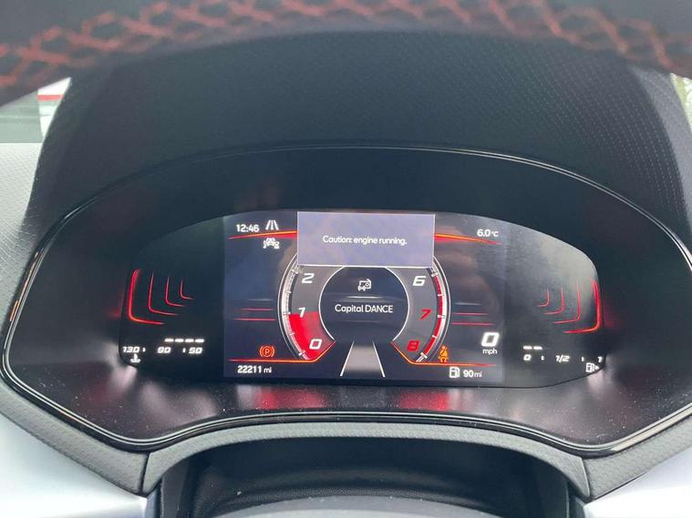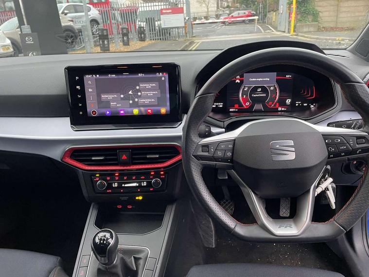 'Lights On' Reminder warning buzzer, 8" Digital cockpit, 9.2" touchscreen navigation system with type C USB socket, Voice control and DAB/AM/FM radio, Auto start and stop system, Bluetooth audio streaming with handsfree system, Digital clock, E-call, Full link smartphone integration with mirror link, wireless apple carplay, Google android auto + USB Type C cable for apple and android devices, Lane assist, Low fuel warning light, Outside temperature gauge, Power Steering, Seat connect with safety, service, remote and online, SEAT drive profiles and ECO function, SEAT logo boot release, Speed limiter, Trip computer, Sports suspension, Auxiliary input socket, Radio/MP3 player, SD card slot, Steering wheel mounted controls, Anti theft roof antenna, Auto dimming rear view mirror, Automatic rain sensing wipers, Black door mirrors, Body colour bumpers, Body colour door handles, Brilliant black window surrounds, Dark tinted rear windows, Electric adjustable/heated/folding door mirrors, Electric front windows, Electric headlight adjustment, Electric rear windows, Front/rear fog lights, FULL LED automatic headlights with dynamic headlight range control, coming and leaving home, LED daytime running lights, LED tail lights, Rear roof spoiler with FR twin exhausts, Rear side wing doors, Rear wiper, Third brake light, 3 seat bench in 2nd row, 60/40 split folding rear seat, Ambient interior lighting, Chrome detailing and black headlining, Cloth upholstery, Dual zone climate control with combination filter, Front courtesy lights, Front cupholders x 2, Front reading lights, Gear shift indicator, Glovebox, Height adjustable front and rear headrests (five), Height adjustable front seats, Height/reach adjust steering wheel, Illuminated air vent surrounds, Illuminated boot, Instrument lighting with brightness control, Isofix, Leather multifunction flat bottomed sports steering wheel, Passenger sunvisor, Single front passenger seat, Sports seats, Sunvisors with mirror and driver side card holder, 3 point seatbelts on all 3 rear seats, ABS, Active front headrests, Child locks on rear doors, Electronic stability control, Energy recovery system, Front assist forward collision warning and autonomous emergency braking, Front driver and passenger side airbags with curtain airbag and front passenger airbag deactivation, Hill hold control, Multi-Collision braking, Seat belt reminder for front and rear seats, Tiredness recognition system, Tyre pressure monitoring system, Electronic engine immobiliser, Locking wheel bolts, Perimeter alarm and interior monitoring with backup horn and tow away protection, Remote central locking + deadlocks, 17" Alloy wheels in Brilliant silver,