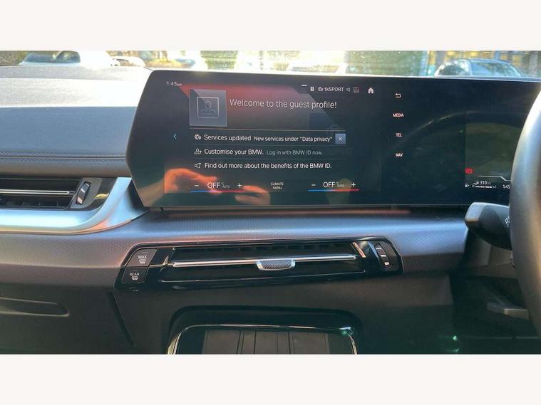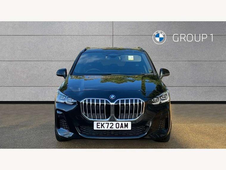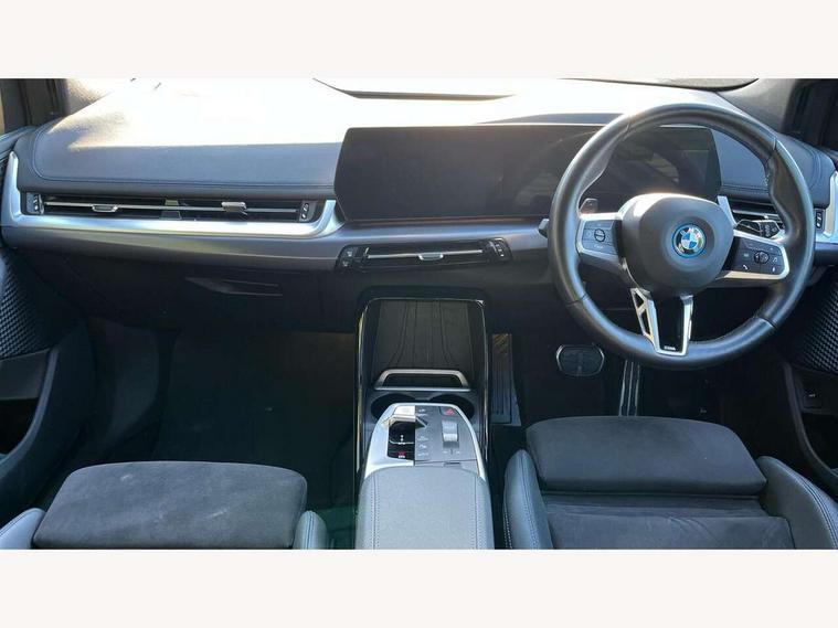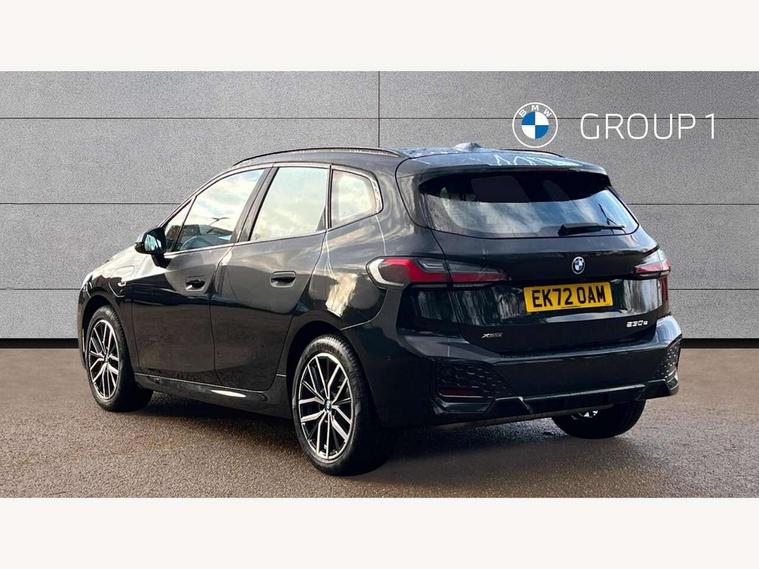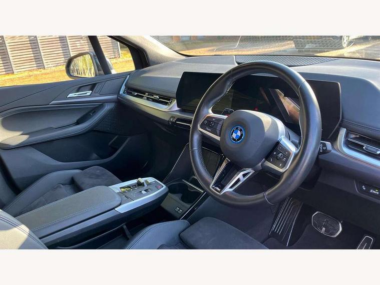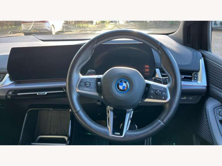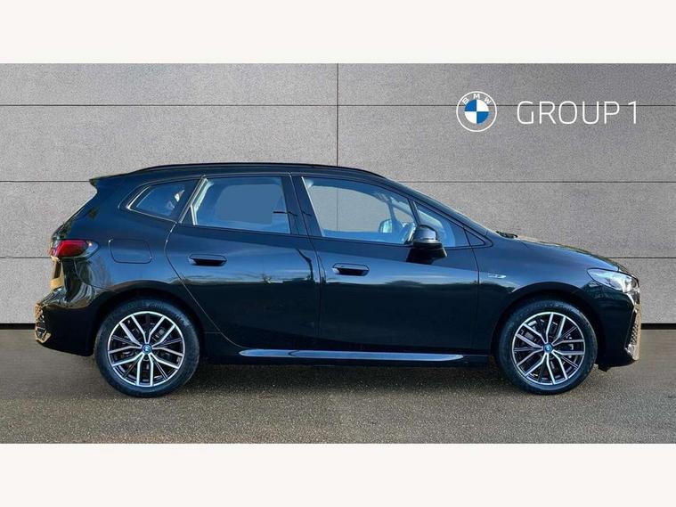 Active Guard incl speed limiting and lane departure functions with auto steering, and front collision warning with brake intervention, Automatic powered tailgate, Automatic start/stop function, BMW Iconic sounds electric, BMW Online services, BMW Teleservices, Brake pad wear indicator in front and rear, Condition based service, Drive off assistant, Flat air vents on instrument panel in high gloss black, adjustable slats with elements in pearl chrome, iDrive controller, Language version English, On board computer - average speed+fuel consumption, service interval, clock/date, odometer/trip meter, outside temperature display and ice warning, Parking assistant with active park distance control, reversing assistant, lateral parking aid and rear view camera, Servotronic variable electric power steering (EPS), Smartphone integration, Widescreen display, 45 Litre fuel tank, Drive performance control with ECO PRO comfort + sport mode, eDrive exterior sound, Gear selector switch with toggle operation, M Adaptive suspension, Mode 3 charging cable, Petrol Particulate Filter, Steptronic transmission with double clutch and gear shift paddles, 2x USB Type C ports in front centre console for charging and data transfer, 2x USB Type C ports in rear centre console for charging, DAB Digital radio, Welcome sound upon opening of the front driver or passenger door, Air inlet middle part on front apron in lines specific design with trim strip in satinised aluminium, Automatic headlights, BMW emblem, engine compartment lid and tailgate, Body colour roof mouldings, Body coloured door mirror caps, Contoured rear roof spoiler in vehicle colour with side aeroblades in black high-gloss, Driver side exterior mirror lighting with BMW logo projection, Dynamic brake lights, Electric adjustable heated door mirrors, Electric windows - front and rear, with open/close fingertip control, anti-trap facility and comfort closing, Folding door handles integrated flush with surface, Front and rear windscreen wipers with heated front washer nozzles, Front bumper cover with independent design in body colour with inserts in black high gloss, Front bumper design elements in satinised aluminium, Front door exit lights, Front door sill finishers aluminium inserts with M inscription, Front entry sills with aluminium inserts + BMW inscription, Front oramental grille with radiator grille bars in satinised aluminium, Heated rear window, Hidden exhaust pipe, High gloss shadow line, High gloss shadowline roof rails, Key with M identification, LED Daytime running lights and parking lights with turn indicators, LED number plate light, LED third brake light in rear spoiler, M identification on sides, Manual headlight range control, Model inscription on right tailgate, Rain sensor, Rear bumper cover with independent design in body colour with inserts in black high gloss, Rear bumper trim strip in satinised aluminium, Rear side wing doors, Shark fin antenna, Side sill covers with independent design in Body colour, Trailer stabilisation logic, Trims on front and rear bumper covers colour-coordinated with side window graphic, Visible VIN plate, Welcome lighting, Windscreen washer nozzle for rear view camera, 12V power socket in luggage compartment and front centre console, 12V socket in right side trim panel, 2 bag hooks in luggage compartment, 2 front reading lights, 2 open cup holders in front centre console, 3 seat bench in 2nd row, 40:20:40 split folding rear seat backrests, Ambient lighting front and rear, Automatic two zone climate control air conditioning, Bottle trays in all doors, Child seat ISOFIX attachment for two outer rear seats and front passenger seat with anchorage points, Driver and front passenger sports seats, Four grab handles integrated in roof lining, Front and rear door pockets, Front and rear footwell lighting, Front and rear side armrest integrated into door trim, Front centre console storage compartment, Front head restraints, Glovebox with light, Heated front seats, Height adjustable 3 rear head restraints, Interior door handle recess light on all doors, Luggage compartment lighting, M Anthracite headlining, M specific floor mats, M sport leather steering wheel, Map pockets, Mechanical rear seats with fore/aft adjustment, Multi-function controls for steering wheel, One piece parcel shelf opens together with tailgate and removable, Rear cloth hooks, Single front passenger seat, Stainless steel pedals, Steering wheel column manual adjustment, Storage compartment lighting in centre console and storage tray in centre stack, Storage compartment net in left side trim panel, Storage compartment with folding cover under centre console armrest cushion, Storage tray in right side trim panel, Sunvisors with illuminated vanity mirrors, Three spoke sport leather steering wheel, Connected pack professional - 2 Series Active Tourer, Technology pack - 2 Series Active Tourer - MY22, 3 point seatbelts on all seats, front pyrotechnic belt tensioners, stopper and belt force limiters, rear coded belt buckles, Airbag - Front driver and passenger, front and rear head, front side, curtain head protection, manual deactivation of front passenger airbag possible, Anti lock braking system (ABS) with brake assist, Automatic hold function, BMW emergency call, Brake drying, Braking readiness, Child proof locking system in rear door, Cornering brake control, Crash Sensor - activates hazard/interior lighting + unlocks doors, DSC - Dynamic Stability Control, Dynamic brake control, Dynamic Traction Control - DTC, Electromechanical parking brake, Energy recovery system, Front disc brakes, Integrated braking system, PC iBrake PostCrash approach control warning with light braking function, Rear disc brakes, Tyre pressure monitoring system, Warning triangle and first aid kit, Anti theft alarm system, Closing system with central locking, Engine immobiliser, Locking wheel bolts, Front centre console trim in high gloss black with my mode expressive, BMW mobility