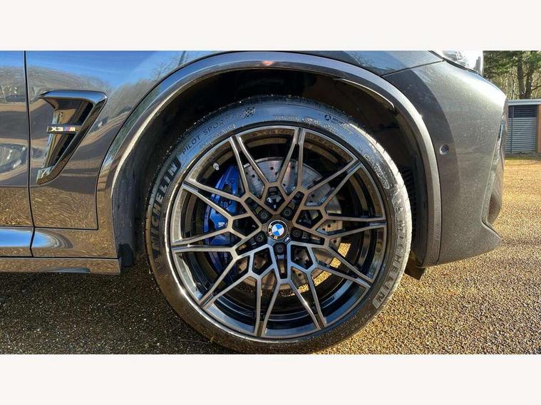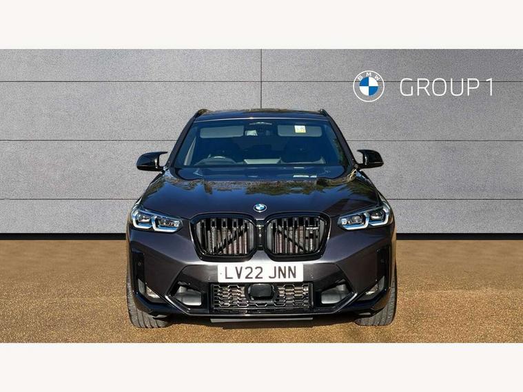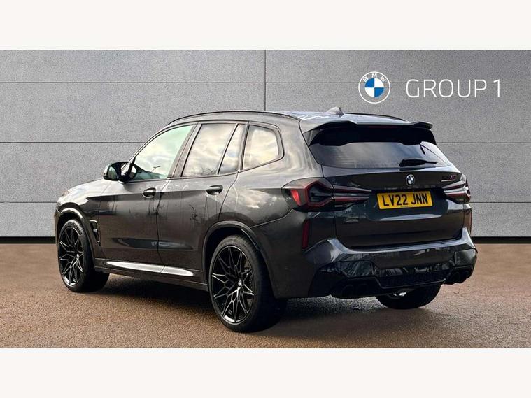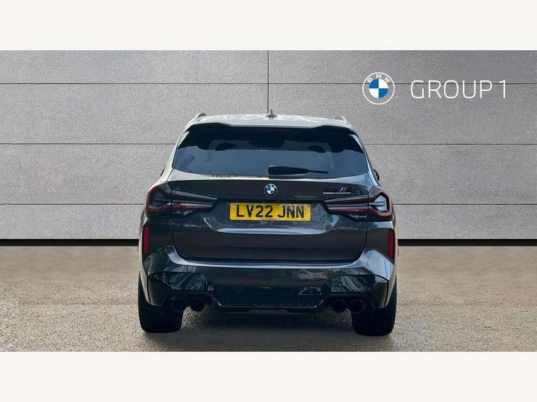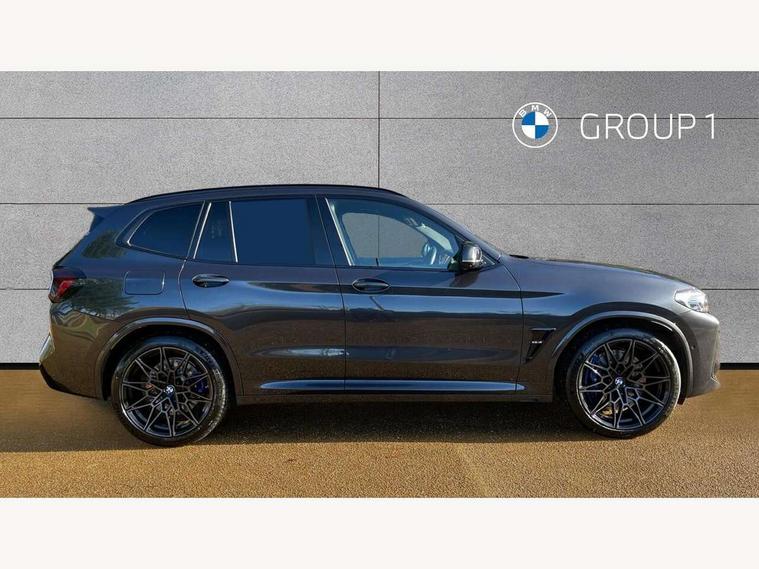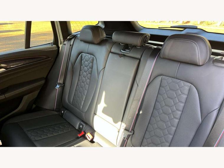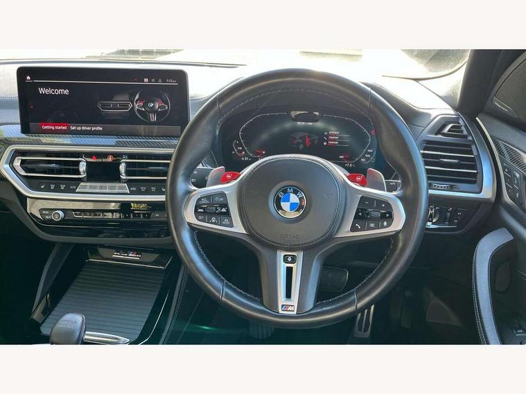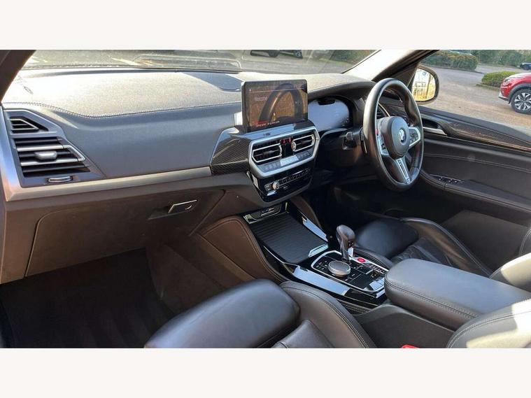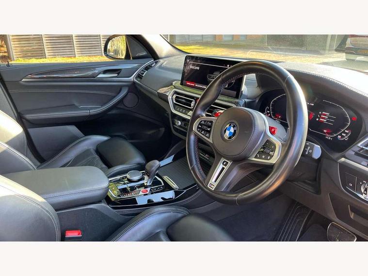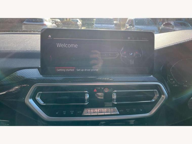Active Guard, Attentiveness assist, Auto start-stop, Automatic tailgate operation, BMW ConnectedDrive online services, BMW gesture control, BMW Live Cockpit Professional Nav with 12.3" instrument display + 12.3" control display, Intelligent Voice Assist, BMW OS 7, HDD, 2USB, 4G LTE connect, BMW service history, BMW Teleservices, Brake pad wear indicator in front and rear, Check Control warning system for monitoring of lights and door/luggage compartment open warning, Condition based service, Cruise control with brake function + speed limiter, Electronic Power Steering (EPS), Enhanced bluetooth with wireless charging, Front/rear park distance control (PDC), Head up Display, iDrive Controller with 8 favourite buttons, Integrated owner's handbook, Language version English, Lights on warning by audio warning signal when ignition is switched off, M drive buttons, Oil sensor for level and grade, warning by check control system, On board computer - average speed+fuel consumption, service interval, clock/date, odometer/trip meter, outside temperature display and ice warning, Personal Profile - automatic lock when driving away selectable, Run flat indicator, Shifting point display, Variable sport steering, Wifi hotspot preparation, Activation of safety battery terminal clamp, Adaptive M suspension, Double joint spring strut front axle, Driving experience modes - Comfort, ECO PRO, Sport and Sport+ mode, Eight speed M Steptronic sport transmission with drivelogic and gearshift paddle switches on steering wheel, Electronic differential lock, EU6 emissions management, Incorrect fuelling protection, M Sport differential, Performance Control, 2 USB ports for charging in rear of centre console, 2x USB Type C ports in front centre console for charging and data transfer, DAB tuner, Electronic service booklet, Harman Kardon loudspeaker system, Acoustic glazing, Auto dimming with folding wing mirrors, Automatic headlight beam throw control with load dependent regulating reaction, dynamic compensation of braking dive and acceleration squat, Black finish on B pillars, Body colour door handles, Body colour front and rear bumpers, Body colour spoiler, Direction indicator, side repeaters, integrated in exterior mirrors, Dynamic brake lights, Electric front and rear windows with fingertip open/close + anti-trap facility and comfort closing function, Electrically adjustable and heated door mirrors, Follow me home headlight function, Front and rear bumper system with replaceable deformation elements, Green tinted heat protection glazing, Heated rear window, Heated windscreen washer jets, High beam assistant, High gloss black shadow line roof rails, High gloss shadowline exterior trim in decorative moulding side frame/recess cover/guide rail/B, C pillars/mirror frame and triangle with mirror base, High level 3rd brake light incorporating LED Technology, Interior rear view electrochromatic mirror with automatic anti dazzle function, LED tail lights, Lightweight engineering, M competition bodystyling, M door entry sills, M Double slat kidney grilles in High Gloss Black with black slats, M Exhaust tailpipes - Quad, round, split left and right with high gloss black finisher 100mm, M Sport exhaust system, Model inscription logo on right tailgate, Rain sensor including auto headlights activation, Rear side wing doors, Rear wiper, Reversing lights, Shark fin antenna, Sun protection glass, Visible VIN plate, Welcome lighting, Windscreen wipers with adjustable interval, 12V power socket in luggage compartment and front centre console, 3 zone automatic air conditioning, 40/20/40 split folding rear seats with backrest, Anthracite headlining, Battery in luggage compartment, Electric seat adjustment with memory, Floor mats in velour - Front and rear colour co-ordinated with all standard carpet colours and front with M stripes, Foldable boot floor with storage compartment, Four grab handles integrated in roof lining, Four-way electrically adjustable front lumbar support, Front and rear bottle holders integrated into door trim storage compartments, Front and rear side armrests integrated into door trim, Front centre armrest with storage compartment, Front cupholders x 2, Front head restraints, Front M sport seats with electrically adjustable headrests and illuminated M logo in headrests, Glove compartment with illumination, Heated front and rear seats, High gloss black front door sill finishers with X3 M competition designation, Luggage compartment lighting, M Gear knob, M sport leather steering wheel, Microfilter and active carbon filter, Multifunction steering wheel, Parcel shelf removeable and storable under boot floor, Reach and rake adjustable steering column, Rear seat centre armrest with two cupholders, Seat backrest adjustment for rear seat, Single front passenger seat, Steering wheel heating, Storage compartment in rear centre console, front and rear door trims and under luggage compartment, Sunvisors with illuminated vanity mirrors and ticket pocket, Three rear headrests, Through loading system with 40/20/40 split folding rear seat, Toolkit located in luggage compartment, Ambient light pack - X3/X4 M, Connected package professional - X3 M/X4 M, Extended storage pack with Stainless steel door sills- X3 M, Interior and exterior mirror pack - X3/X4 M, Interior lighting pack -X3/X4 M, Active protection, ADB - Automatic Differential Brake, Airbags - Front driver/passenger, front and rear curtain head protection, front side, manual deactivation of front passenger airbag, Anti lock braking system (ABS) with brake assist, Automatic Stability Control (ASC), BMW emergency call, Brake drying, Brake energy regeneration, Braking pre-tensioning, Child proof locking system in rear door, Child seat ISOFIX attachment rear outer seats, Compound structure brake discs, Cornering brake control (CBC), Crash Sensor - activation of airbags, Crash Sensor - activation of central locking release, hazard warning light and interior lighting, Deactiv