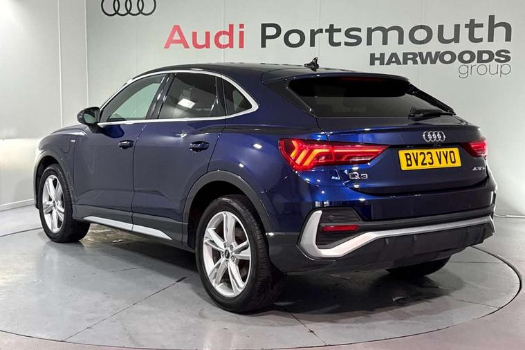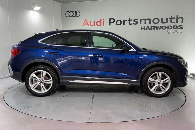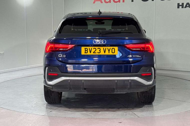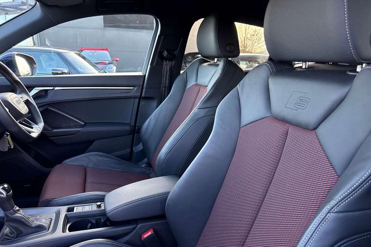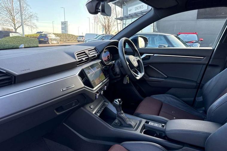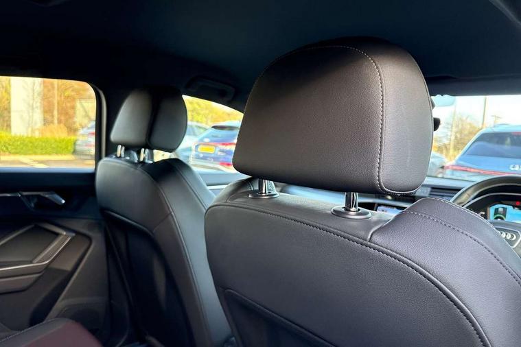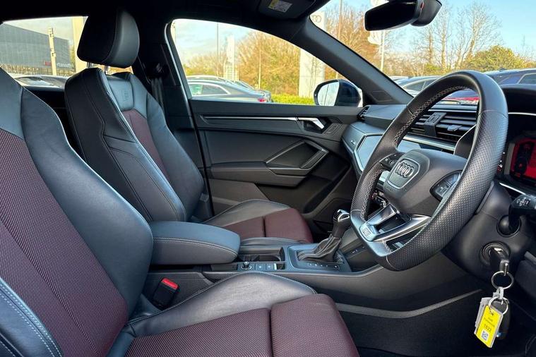 Audi drive select, Audi lane departure warning, Audi Virtual Cockpit - 10.25" display, Bluetooth interface, Camera based traffic sign recognition, Legal emergency call, MMI Navigation Plus with high resolution 10.1 inch touchscreen colour display, Power operated tailgate, Progressive steering, Service interval indicator, Smartphone interface includes wireless Apple carplay/Android Auto, Start stop system with recuperation, Voice control system with natural language interaction, 3 pin 10 amp domestic charging cable, 3.6 kw On-board charger, Standard suspension, Type 2 mode 3 32 amp charging cable, Type 2 socket for AC charging, 2 USB-C ports with charge and data functions, 6 passive loudspeakers, DAB digital radio module, Acoustic windscreen, Aluminium window trim, Auto dimming frameless rear view mirror, Diffuser grille in grained matt black, Diffuser trim in selenite silver, Electrically folding, adjustable and heated door mirrors with integrated LED side indicators and kerb view function for passenger side, Front and rear electric windows, Front fog lights, Front side air inlets in selenite silver, Front underbody protection in manhattan grey paint finish, Grille surround in aluminium silver matt, High gloss black finish B and C pillars, LED Dynamic rear indicators, LED headlights with LED daytime running lights, LED rear lights, LED third brake light, Privacy glass dark tinted rear and rear-side windows (from B-pillar backwards), Radiator grille in anthracite black with inlay in matt aluminium silver, Rain and light sensors, Rear side wing doors, Rear underbody protection in matt black, Rear wiper, S line badges on front wings, S line front and rear bumpers and side skirts in contrasting Manhattan grey paint finish, Side skirt insert in matt Platinium grey, Variable front intermittent wipers, 12V socket in rear centre console, 3 seat bench in 2nd row, 3 spoke leather multifunction steering wheel features S badging and grips in perforated leather with contrast stitching, 40:20:40 folding with manual adjustment for 60:40 forwards/backwards position and backrest angle, Adjustable rear seat bench/backrest with centre armrest and cupholder, Black cloth headlining, Dual zone electronic climate control, Front and rear black floor mats with contrast stitching, Front and rear headrests, Front and rear roof module including reading lights, Front centre armrest, Glove compartment lighting, Height and reach adjustable steering wheel, Illuminated door sill trims with S logo, ISOFIX child seat mounting for front passenger with airbag deactivation and outer rear seat including top tether attachment point for outer rear seats, Luggage compartment light right in white, Luggage compartment sill protection in stainless steel, Manual front seats with height adjustment, Perforated leather gearknob, Single front passenger seat, Stainless steel pedals, Ambient lighting pack - Q3, Non smoking pack - Q3, 3x3 point rear seatbelts, 6 airbags - Driver, front passenger, curtain and side windows, Audi pre-sense front with pedestrain and cyclist recognition, Electrically operated child locks on rear doors, Electromechanical parking brake, Electronic stabilisation control including ABS, ASR and EDL, Front seatbelt reminder, Hill descent control, Hill hold assist, Pre sense basic, Seatbelt monitoring, Tyre pressure warning, Warning triangle and first aid kit, Anti theft alarm, Anti theft wheel bolts, Immobiliser, Remote central locking, Aluminium look interior elements, Black dashboard, Dark matt brushed aluminium inlay, Detail dashboard around MMI touch colour display in glass look, black with surround in aluminium look, Leatherette door armrest, Tool kit, Tyre repair kit,