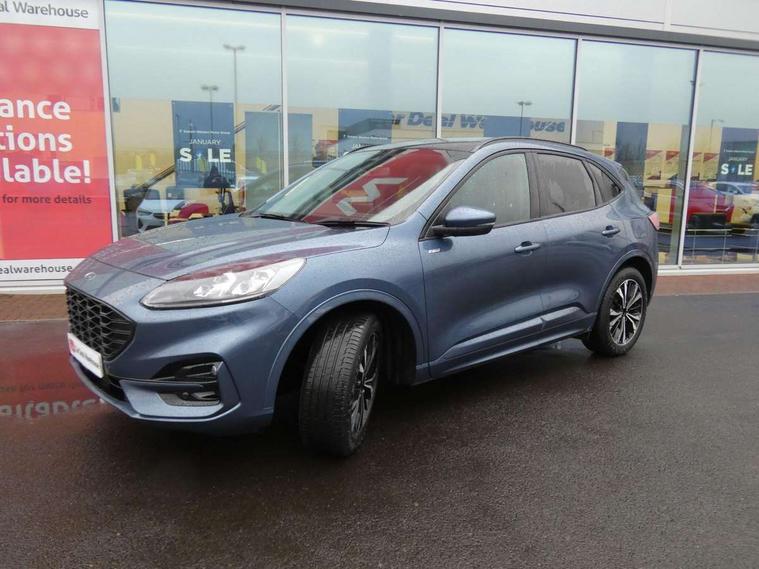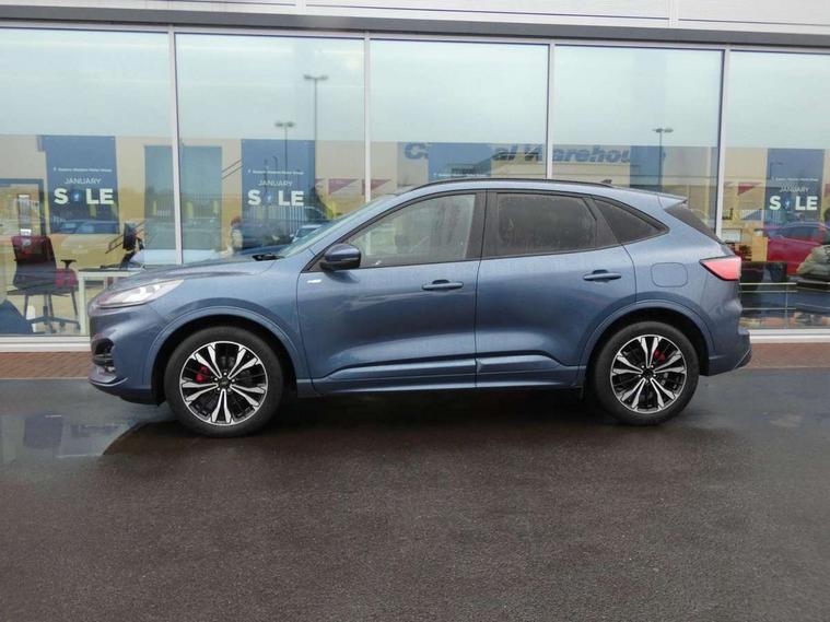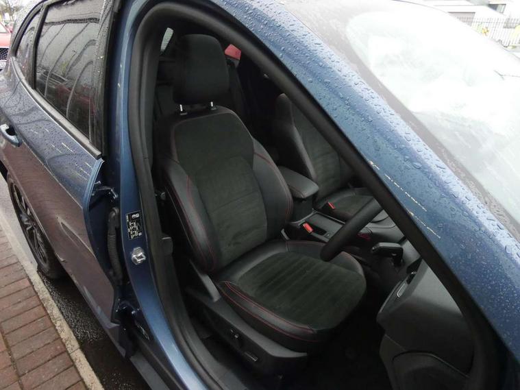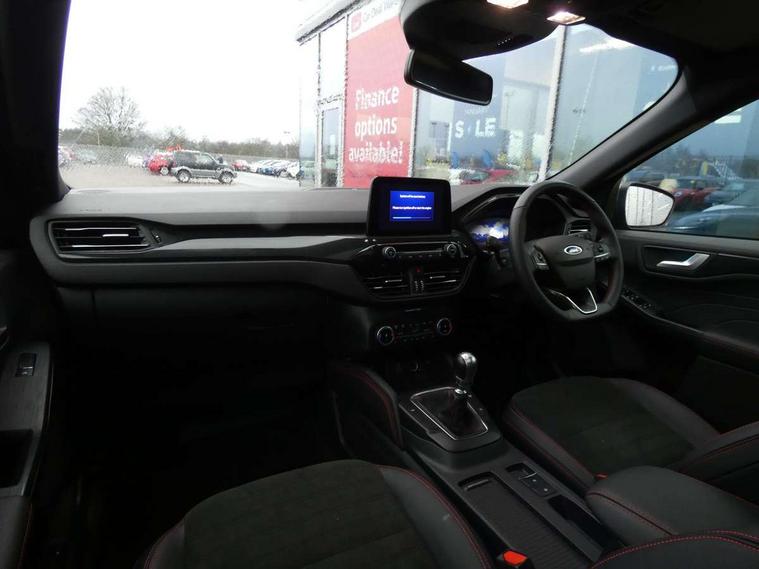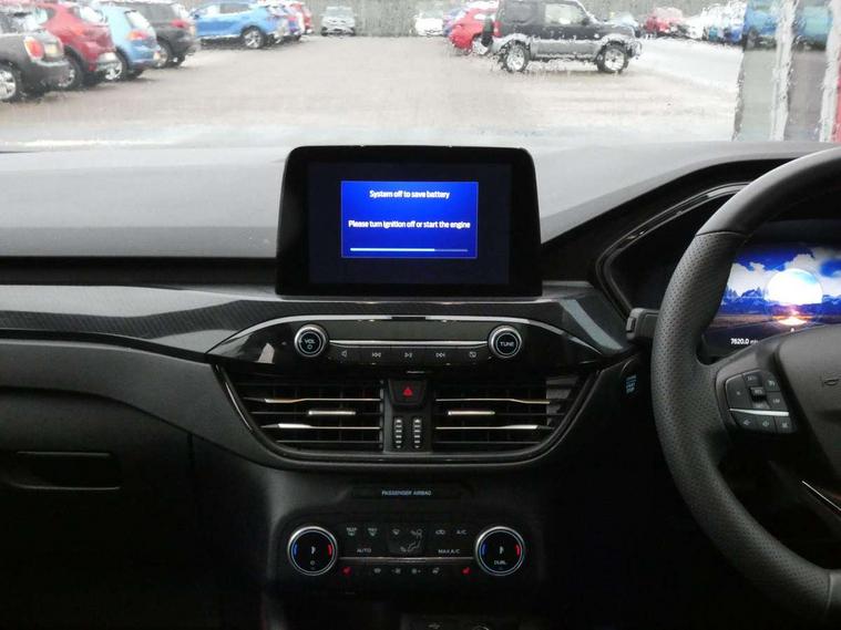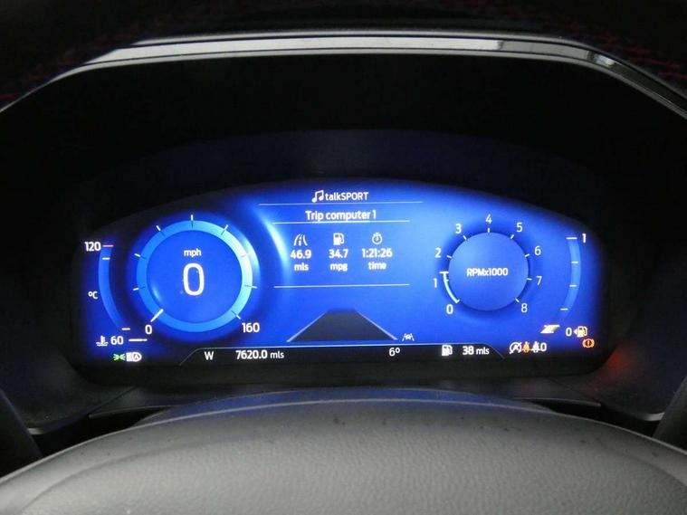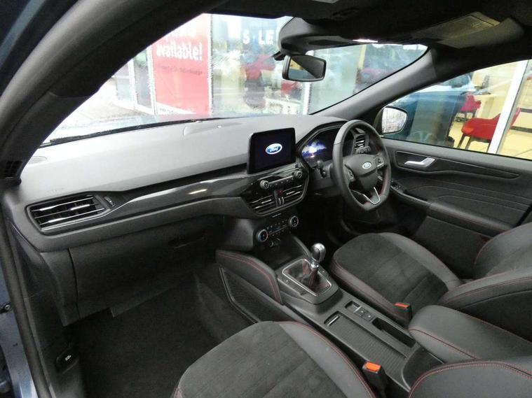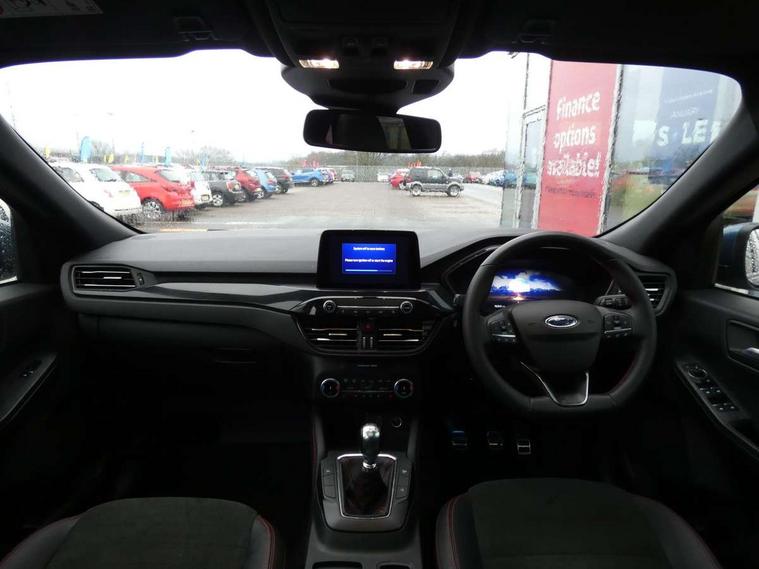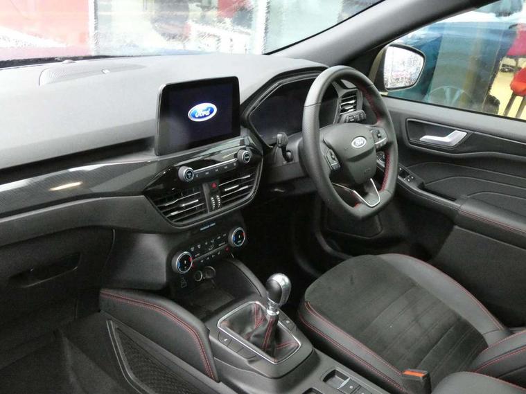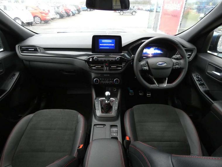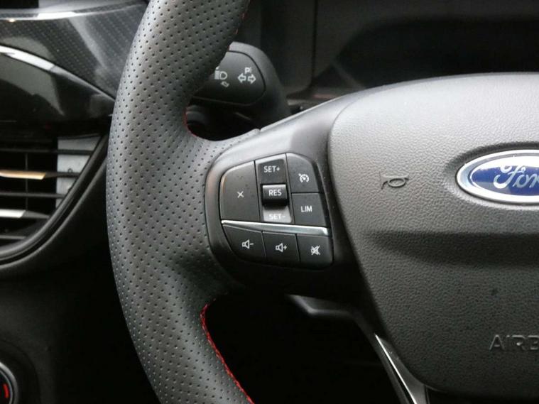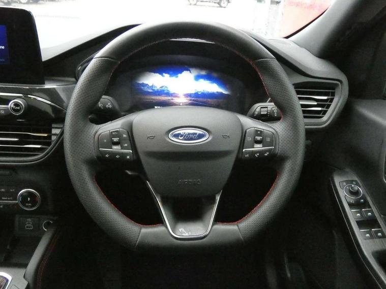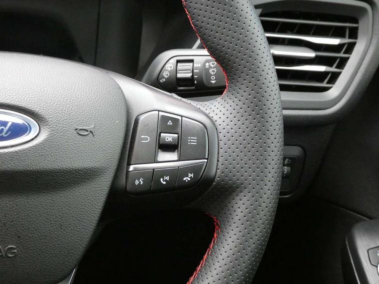 12.3" digital colour instrument cluster, Ford easy fuel, Ford SYNC 3 with 8" TFT LCD touchscreen, App Link, andriod auto/apple carPlay, emergency assistance and navigation with Ford pass connect, Front and rear parking sensors, Hands free power tailgate, Lane keeping aid with lane departure warning, Power assist steering, Rear view camera, Selectable drive modes, Service interval indicator, Sports suspension, Twist beam rear suspension, B&O premium audio system with 10 speakers and subwoofer, 2 USB ports, DAB radio/CD, Auto headlamps with high and low beam, Black roof rails, Body colour bumpers, Day/night rear view mirror, Front LED fog lamps, Large rear roof spoiler, LED daytime running lights, LED rear lights, Power folding, electrically adjustable and heated door mirrors with puddle lights, Power front/rear windows with global close, Power opening panoramic roof, Quickclear heated windscreen, Rain sensing wipers, Rear privacy glass, Rear side wing doors, Rear wiper, ST Line body styling kit with unique front and rear fascia and bumper, rear painted diffuser, front painted skid plates, dark mesh upper grille, ST Line front scuff plates, Third brake light, Twin exhausts, 2nd row sliding seats with 60:40 split, Alloy pedals, Centre console with electronic parking brake, Dark headlining and pillars, Electronic automatic temperature control (EATC), Flat bottomed leather steering wheel in sensico with red stitching, Front and rear head restraints, Heated passenger and driver seats, Heated rear seats, Heated steering wheel, Partial premium touch Sensico with black cloth inserts and red stitching, Rear centre head restraint, Single front passenger seat, Sports seats, ST Line front and rear floor mats, ST Line gear knob, 3x3 point rear seatbelts, Airbags - front driver/passenger, front and rear curtain, Drivers knee airbag, Electronic stability control (ESC) and ABS, Ford MyKey Gen 2 safety system, Manual child proof rear door locks, Post collision braking, Pre collision assist with autonomous emergency braking, Rear seat Occupancy alert, Red brake calipers, Tyre pressure monitoring system, Engine immobiliser, Keyless entry and Ford power start button (Keyless start), Locking wheel nuts, Remote powered central double locking doors, Thatcham category 1 alarm,