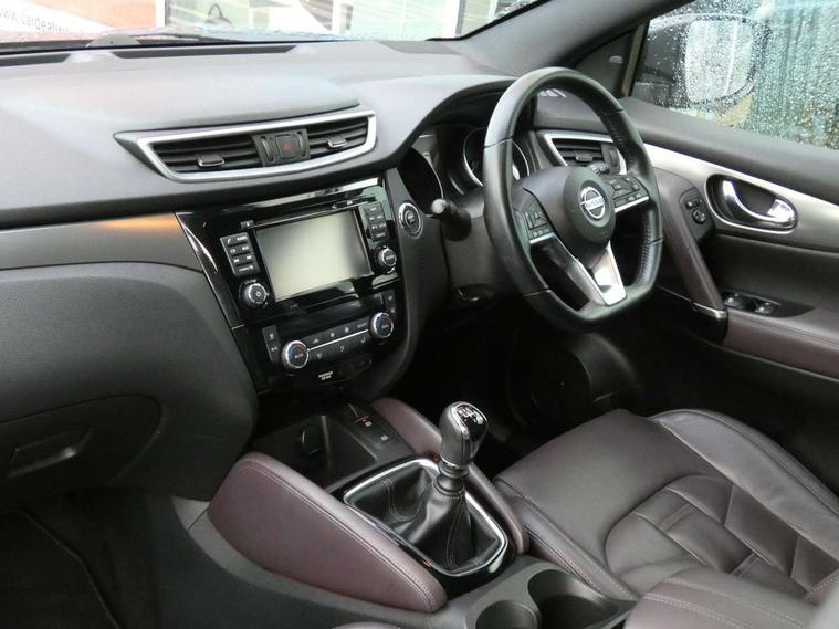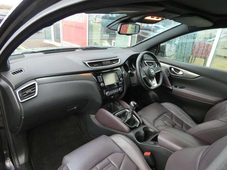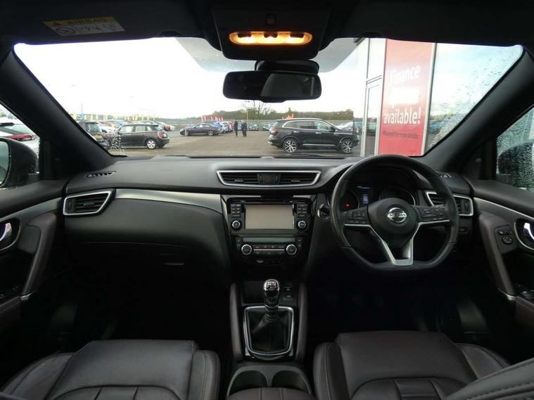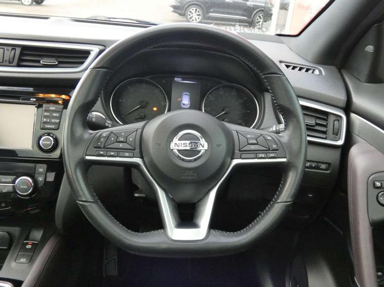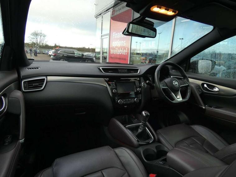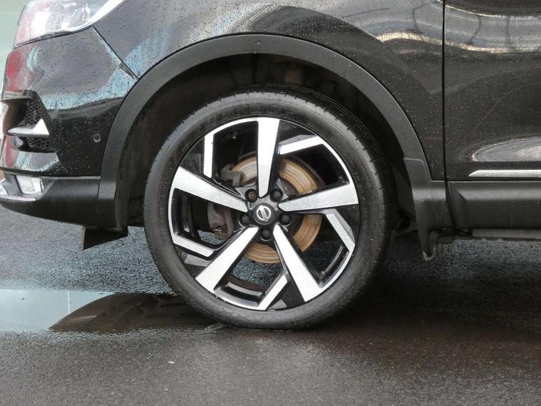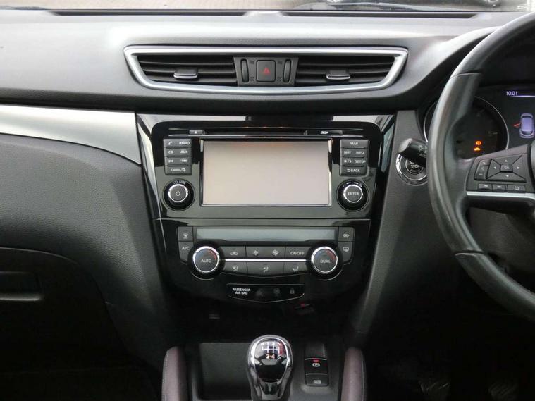 5" TFT driver information centre, Around View Monitor, Blind spot monitoring, Bluetooth phone integration system, Cruise control, Electric speed sensitive power steering, Front and rear parking sensors, Intelligent parking assist, Lane departure warning system, Nissan connect sat nav system, Outside temperature display, Push button starter, Rear view camera, Service interval indicator, Speed limiter, Traffic sign recognition, Trip computer, Diesel particulate filter, 'Shark fin' mobile antenna, Bose premium 8 speaker system, DAB Digital radio, Radio/CD, Smartphone apps, Steering wheel mounted audio controls, USB/aux input socket, Automatic headlamp activation, Body colour bumpers, Body colour door handles, Chrome window surround, Electric folding and heated door mirrors, High beam assist, Interior mirror with auto anti dazzle, LED indicators in door mirrors, One touch electric front/rear windows, Panoramic sunroof with one touch shade, Privacy glass, Rain sensor windscreen wipers, Rear roof spoiler, Rear wiper, Silver door mirrors, Silver roof rails, 2 X front 12v power sockets, 4 way lumbar support with memory function, 60/40 split folding rear seat, Ambient interior lighting, Centre console with armrest, Chrome interior door handles, Configurable luggage board system, Dark headlining, Dual zone climate control, Electric adjust driver's seat, Electric front passenger seat, Front and rear door pockets with bottle holders, Front headrests, Front seat belt pre-tensioners with load limiters, Illuminated electric window switch, Isofix child seat preparation, Leather gearknob, Leather interior door handles, Leather knee rest, Leather steering wheel, Luggage compartment lighting, Map reading lamp, Parcel shelf, Pollen filter, Rake/reach adjustable steering wheel, Rear headrests, Heat package - Qashqai, LED pack - Qashqai, ABS, brake assist and EBD, Child locks on rear doors, Curtain airbags, Driver/front passenger airbag, Electronic parking brake, ESP + traction control, Forward emergency braking, Front passenger airbag deactivation, Height adjustable front seatbelts, Hill start assist, Seatbelt warning, Side airbags, Three 3 point rear seatbelts, Tyre pressure monitoring system, Alarm, Immobiliser, Intelligent Key, Remote central locking, Graphite interior trim, Tyre puncture repair kit,