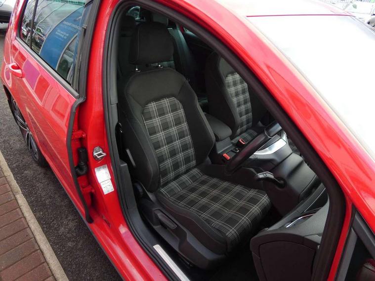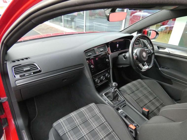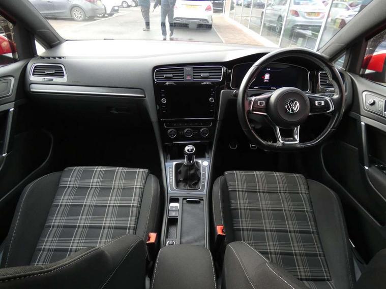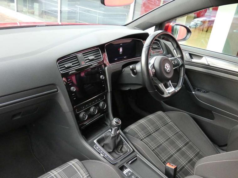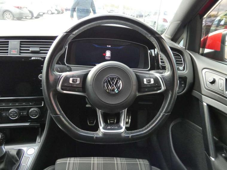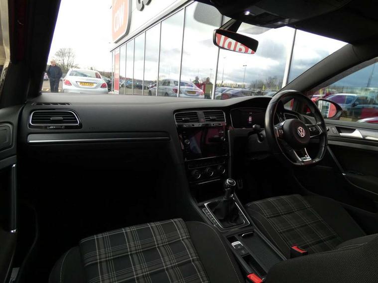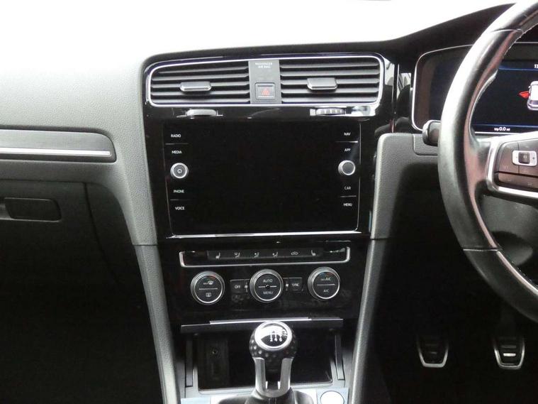 'Lights On' Reminder warning buzzer, 8" touch screen, Adaptive Cruise Control with pedestrian detection and speed limiter, App-Connect, Bluetooth hands free telephone connection, Brake pad wear indicator warning light, Drive mode selector, Driver alert system, Driver profile selection, Exterior temperature gauge, Instrument cluster in white, Multifunction computer, Progressive power assisted steering, Rev counter, Trip and service interval display, Ultrasonic front and rear optical and audible parking sensors, Warning buzzer and light for front seatbelts unfastened, Anti-tramp function, Diesel particulate filter, Lowered sports suspension, XDS plus electronic differential lock, CD/MP3/WMA, USB and SD card reader, aux-in, Composition media system, DAB Digital radio, 3D-LED-SBBR with sweeping indicator, Auto dimming rear view mirror, Automatic coming/leaving home lighting function, Automatic headlights, Black rear diffuser, Body colour door handles, Body colour door mirrors, Body colour rear roof spoiler, Body colour sports bumpers, Electric front windows, Electric rear windows, Electrically adjustable and heated door mirrors, Heated rear windscreen, Honeycomb radiator grille - black, LED daytime running lights, LED front fog lights, LED rear lights, Rain sensor, Rear windscreen washer and wiper with interval delay, Twin exhaust tailpipe, 12V socket in luggage compartment, 3 rear headrests, 3 spoke steering wheel, 60/40 split folding rear seat, Air conditioning - 2 zone electronic climate control, Bag hook in luggage compartment, Black headlining, Boot lashing points, Cooled glovebox, Courtesy light delay, Cover for storage compartment in centre, Dust/pollen filter, Front + rear carpet mats, Front centre armrest with storage box and rear air vents, Front passenger drawer stowage, Front passenger seat height adjust, Front seat back storage pockets, Grab handles, Height adjustable driver's seat, Height/reach adjust steering wheel, Illuminated door sills, Illuminated vanity mirrors, Isofix preparation for 2 rear child seats, Leather gear knob and handbrake grip, Load through provision with rear centre armrest and cupholders x2, Luggage compartment cover, Luggage compartment lighting, Multifunction leather steering wheel with grey stitching leather trimmed gear knob including paddle shift, Overhead storage box, Stainless steel pedals, Storage box in luggage compartment, Storage compartments in doors, Sun visors, Variable boot floor, height adjustable and removable, Ambient lighting pack - Golf, Mirror pack - Golf, 3 point height adj front seatbelts + pretensioners, 3 rear 3 point seatbelts, ABS, Automatic post collision braking, Child locks on rear doors, Driver/Front Passenger airbags, Driver/Passenger whiplash optimised head restraints, Drivers knee airbag, Electronic parking brake with auto hold, ESP with EDL + ASR, Front and rear curtain airbags, Front passenger airbag deactivation, Front side airbags, Pre crash system, Tyre pressure monitor, Alarm with interior protection, Electronic engine immobiliser, Remote central locking with 2 remote folding keys, Chrome-plated light switch surround, Honeycomb black decorative inserts, Piano black centre console, Space saver spare wheel,