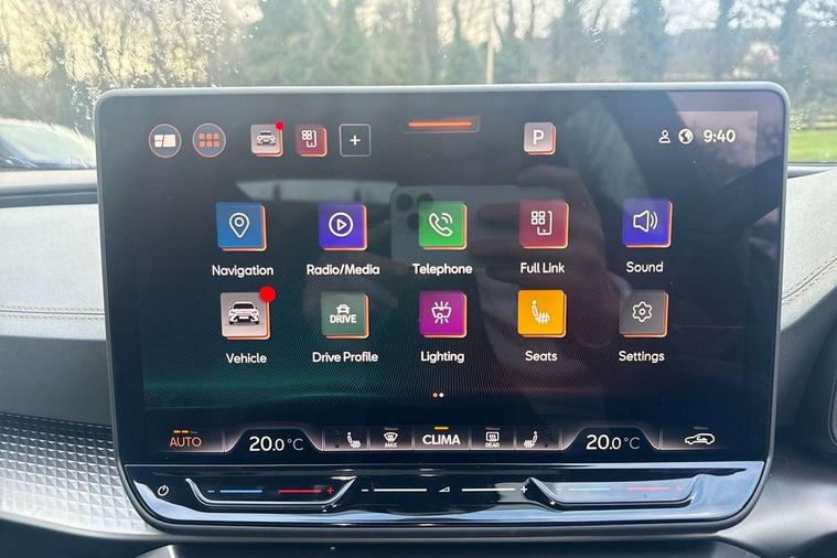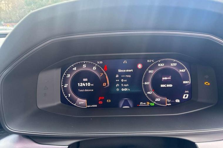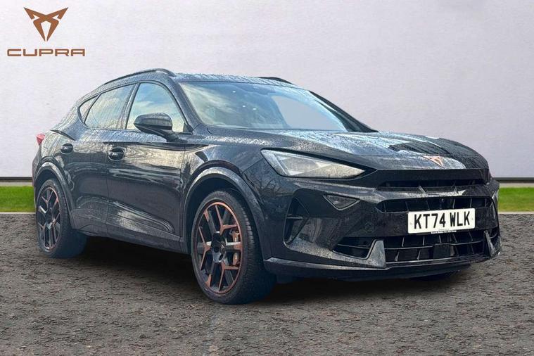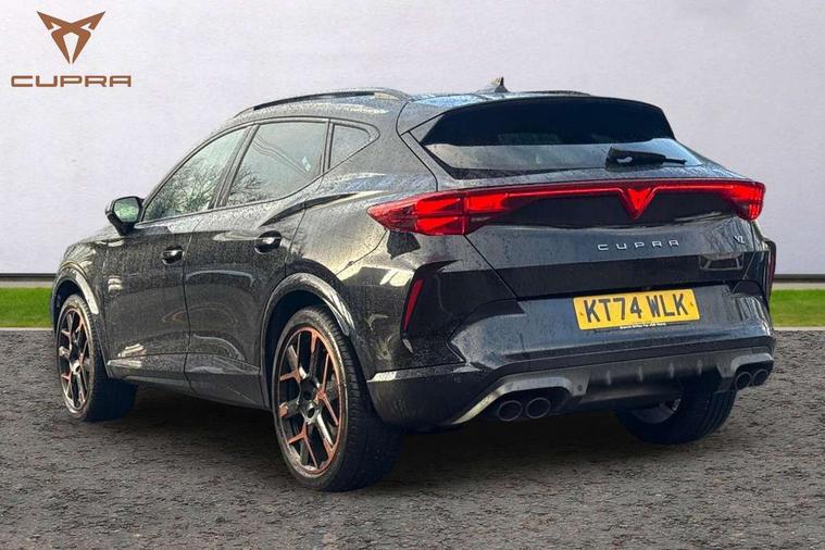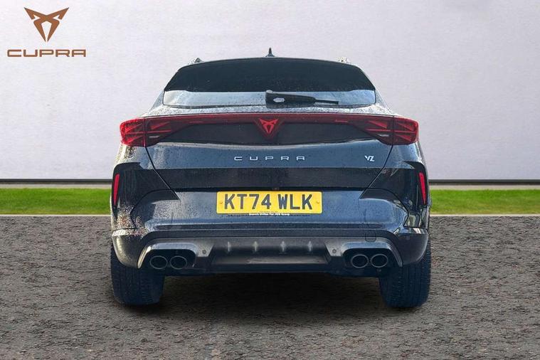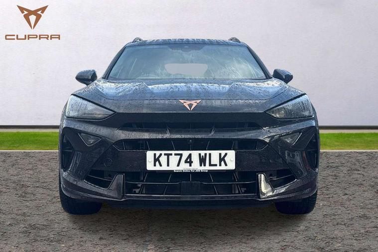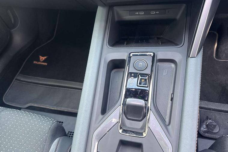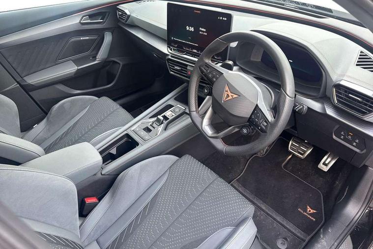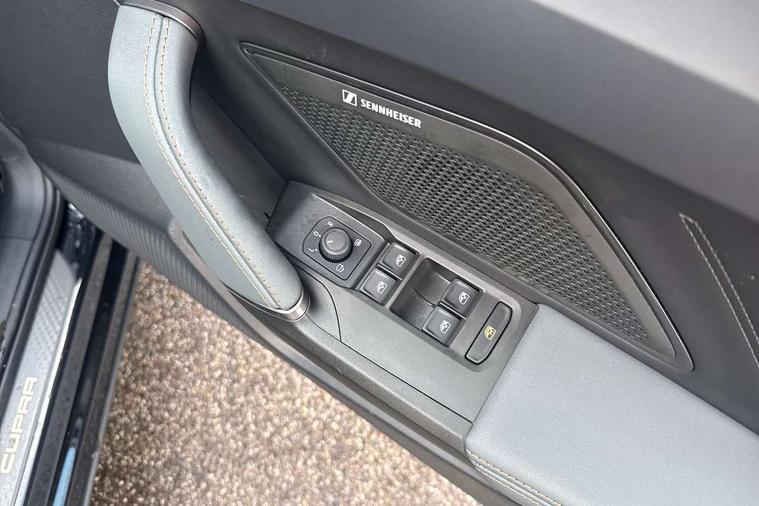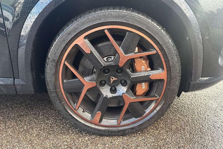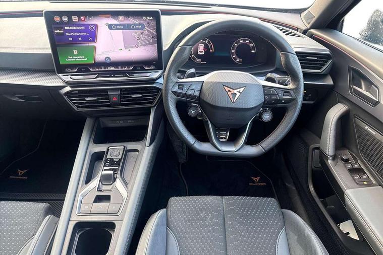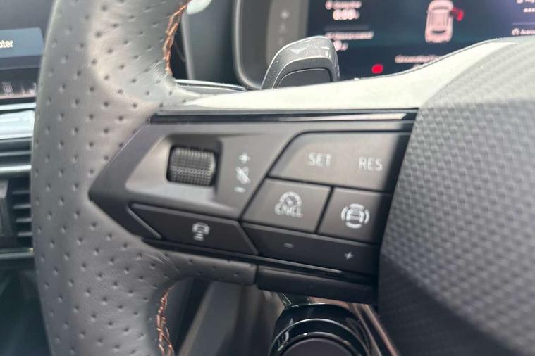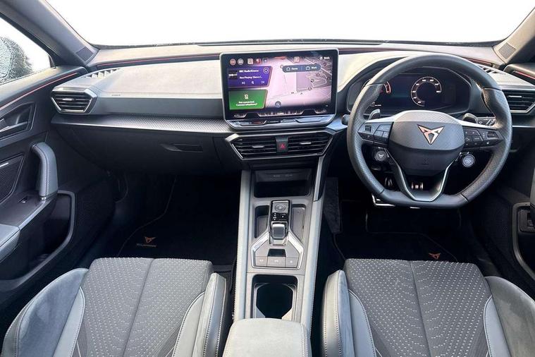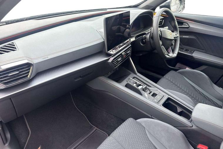10.25" digital cockpit and configurable dashboard, Adaptive cruise control with follow-to-stop and speed limiter, Advanced driver alert system, Advanced lane assist with semi-automatic vehicle control in a medical emergency and traffic jam assist, Dynamic chassis control with driving profile selection (Comfort, Sport, CUPRA, Individual), Dynamic road sign display, Emergency steering support with turn assist, Forward collision warning with automatic braking, Full link phone integration, Intelligent park assist, RPM, trip computer, outside temp gauge, instrument light brightness, low fuel warning light, lights on reminder, gearshift indicator, Service interval indicator, Side and exit assist, Speed sensitive power steering, Start/stop system with regenerative braking, Top view camera, Virtual pedal and electric tailgate, Voice control system, Wired Android Auto, Wireless apple carplay, Wireless phone charger, Adaptive chassis control with continuous operation, CUPRA sport suspension, Electronic locking differential and dynamic traction support, 2 front and 2 rear USB type C sockets, Immersive by Sennheiser TM - 10 speakers, 1 central speaker, 1 subwoofer, Media system with navigation, 12.9" touchscreen display, voice control, DAB, steering wheel mounted controls, Auto dimming rear view mirror, Black roof spoiler, Body colour door handles, Body coloured bumpers, Dark grey wing mirror, Daytime running light with automatic headlight control and coming home feature, Door panel ambient lighting, Dynamic headlight range control, Electric front/rear windows, Electrically adjustable heated and folding door mirrors with memory function, Gloss black roof rails and window surrounds, High beam assist, LED 3rd brake light, LED front fog lamps with cornering function, LED Taillights with dynamic indicator, Matrix LED headlights with multifunction camera, Rain sensing wipers, Rear diffuser with twin exhaust pipe on each side, Rear fog lights, Rear side wing doors, Rear wash/wipe, Side skirts, Tinted rear windows, Welcome lights (within exterior mirror housing), 12V socket, 2 front and 2 rear reading lights, 3 seat bench in 2nd row, 60/40 split rear bench seat with armrest and mechanical seat release, Black headlining, Black interior roof lining, Cupra sports pedals, Dust/pollen filter, Electrically adjustable front seats with lumbar support and memory function, Front and rear head restraints, Front centre armrest, Heated front seats, Heated supersports multifunction leather steering wheel with satellite buttons and gear shift paddles, Height/reach adjust steering wheel, Illuminated aluminium doorsteps, Illuminated interior front door sills, Illuminated sunvisor with mirror, Isofix, Leather dashboard, door insert and side trim panel, LED smart wraparound lighting, PVC/Textile upholstery + cup bucket seats, Satellite steering wheel, Single front passenger seat, Three zone climate control with control panel in rear, Variable luggage/load compartment floor, 3 point seatbelts on all rear seats, ABS, Akebono brakes, Brake control system - ESC and brake booster, Child proof door locks, Driver and front passenger airbags with front passenger airbag de-activation, Driver and front passenger knee airbag, Electronic parking brake, Hill hold control, Performance brakes with front brembo calipers, Pre-crash front and rear seat belt tensioner, window closure and hazard lights, Public e-call, Seat belt reminder for front and rear seats, Side airbag for front and rear with curtain airbags, Tyre pressure monitoring system, Anti theft alarm system, KESSY Advanced - Keyless start, keyless entry with SAFELOCK, Locking wheel bolts, Copper and aluminium interior detailing, 19" Hailstorm forged machined R black and copper alloy wheels, Breakdown and tool kit,
