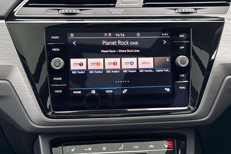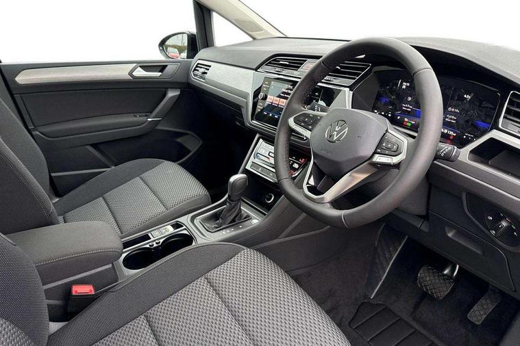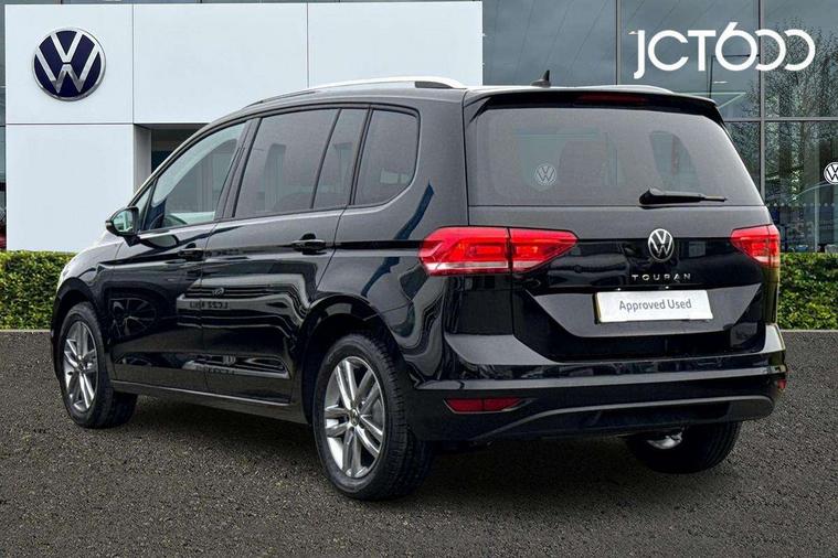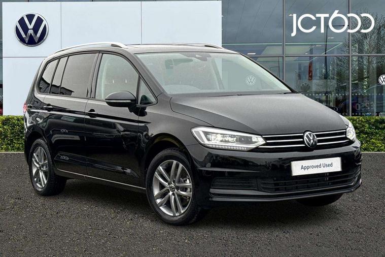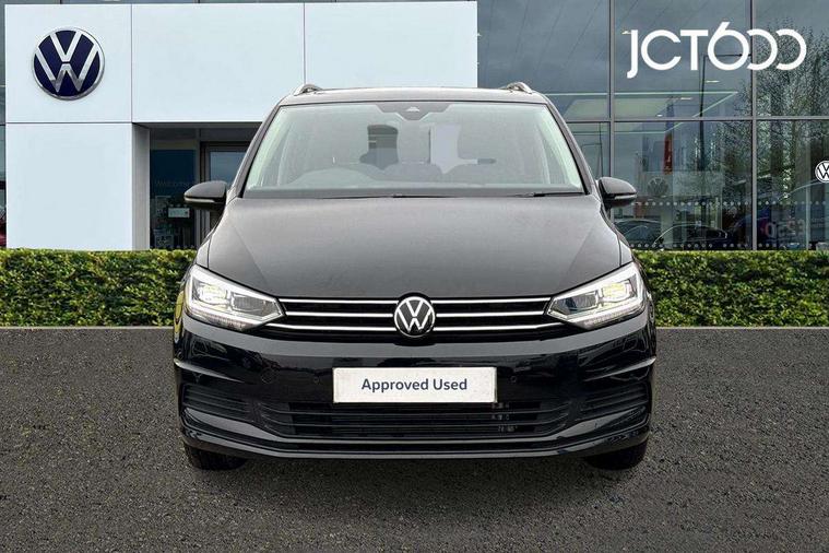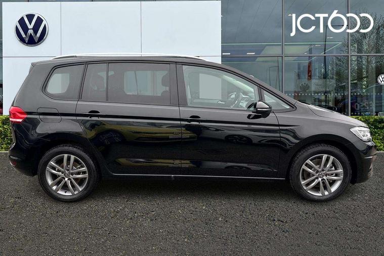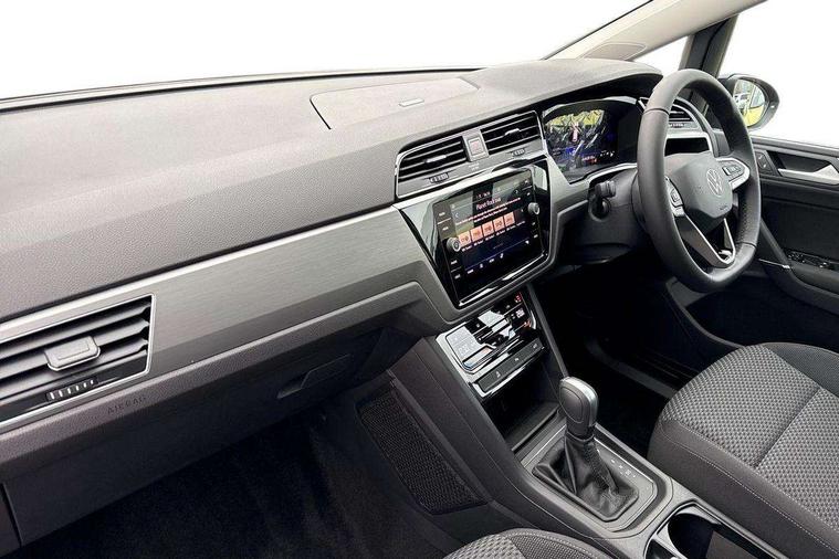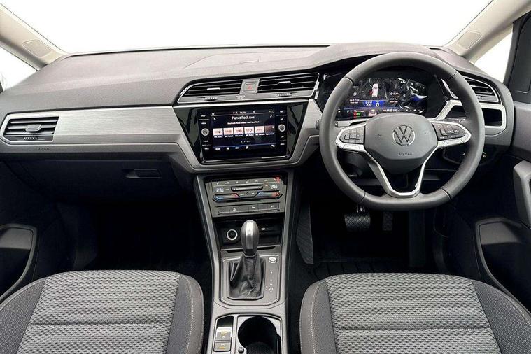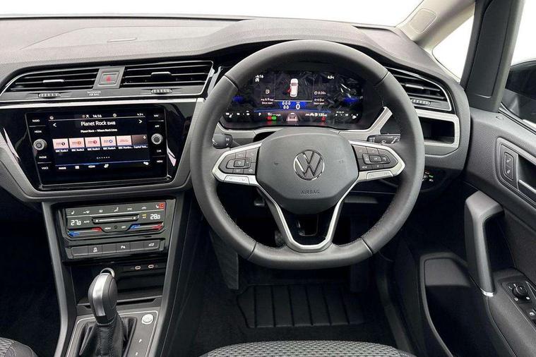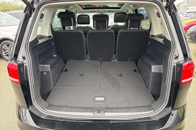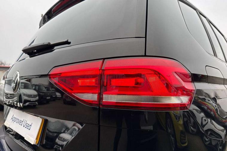 Adaptive cruise control, Audible lights on warning, Discover media navigation touchscreen navigation/radio system with streaming and internet, Driver alert system, Driver profile selection, Dynamic road sign display, Electric tailgate, Electronic odometer, Emergency services call system, Extended, crash-active and proactive Pedestrian and cyclist monitoring, External temperature gauge, Front parking sensors, Lane change system side assist and rear traffic alert, Lane keep assist, Misfuelling protection device, Mobile pairing with SMS function, Mobile phone interface with inductive charging, Rear view camera displayed via vehicles audio system display, Rev counter with fuel gauge, Side scan, Speed limiter, Speed sensitive power steering, Stop/start system, Think blue trainer driver tips and journey analysis, Trip and service interval display, We connect' and 'We connect plus' functionality, Petrol Particulate Filter, Rear stabiliser bar, XDS electronic differential lock, 4x20 watt output, 8 Speakers, Audio Connectivity System, DAB Digital radio, External USB-C data socket with increased charging performance - 2 USB sockets 45W, MP3/WMA compatability, SD card slot, Title and cover art display, USB connection, Aerial integrated into side window, Auto dimming door mirrors, on driver side, surround lighting and front passenger side mirror lowering function, Auto dimming rear view mirror, Automatic coming/leaving home lighting function, Body colour bumpers, Body colour door handles, Body colour door mirrors with integral indicators, Door mirrors with memory function, Dusk sensor + auto driving lights, Electric folding door mirrors, Electric heated + adjustable door mirrors, Electric, glass sliding/tilting panoramic sunroof including integrated roller blind and LED lighting around aperture, Front and rear electric windows, Fully galvanised body, Gloss black finish B pillar, Green tinted heat insulating glass, High level third brake light, Rain sensor, Rear fog lights, Rear side wing doors, Rear tinted glass from B-pillar backwards approx 65% tinted, Rear wash/wipe with intermittent wipe setting, Removable engine badge, Silver roof rails, Tailgate wiper- reverse gear activation, Twin chrome exhaust tailpipes, Volkswagen roundel, Windscreen wipers intermittent wipe, 12V power point for Row 2, 12V socket in luggage compartment, 2 individual fold flat 3rd row seats, 2 three point seatbelts in 3rd row, 2nd row centre armrest, 2nd row centre seat converts into table, 3 single slide/fold/removable 2nd row seats, 3 spoke steering wheel, 3x3 point seatbelts on 2nd row with height adjust on outer seats, 4 boot load lashing points, 4 way adjustable front head restraints, 5 headrests, Activated charcoal canister for intensified evaporation system, Air care climatronic 3 zone air conditioning system with rear air conditioning control panel, Chrome plated radiator grille inserts, air vent surrounds and light switch surrounds, Driver and front passenger under seat drawer, Dust/pollen filters, Foldable front passenger seat backrest with load through function, Front and rear reading lights X 2, Front centre armrest with storage compartment, Front comfort seats with lumbar support, Front cupholders x 2, Front passenger seat height adjust, Front seat storage pockets, Front seatback folding tables, Height adjustable driver's seat, Height/reach adjust steering wheel, Illuminated glovebox, Instrument lighting white adjustable panel illumination with red night time illumination, Interior light with delay, Isofix on 2nd row outer seats, Isofix on 3rd row seats, Large storage compartment in roof console, Lasano cloth upholstery, Leather multifunction steering wheel with gear knob, Leatherette on rear of front seats, Low tunnel 2nd row seat, Luggage compartment lighting, Media box in dashboard on passenger side, Multi storage in passenger/luggage areas, Multi-function centre console with storage facilities, Retractable luggage cover, Split folding rear seat backrests, Storage bins on all doors, Sun visors with illuminated vanity mirrors, Family Pack - Touran, Winter pack without heated washer jet - Touran, 3 point height adjustable front seatbelts, Auto hold function, Automatic post collision braking system, Door open warning reflectors, Driver/Front Passenger airbags, Drivers knee airbag, EDL + ASR, Electronic parking brake, Energy recovery system, ESC with ABS, First aid kit, Front and rear (row 2) curtain airbags, Front assist with autonomous emergency braking, Front seat side impact airbags, Front seatbelt pretensioners, Front/rear disc brakes, Hill hold control, Hydraulic Brake Assist (HBA), Loose wheel warning function, Manual passenger airbag deactivation function, Pre crash preventive occupant protection, Proactive passenger protection system with front and side assist, Rear child proof door locks, Road sign recognition, Seatbelt warning lamp and buzzer, Traction control, Two tone horn, Warning triangle, Alarm with remote central locking and interior protection, Electronic engine immobiliser, Keyless Access Keyless locking and starting system with SAFELOCK, New brushed design decorative inserts in dash and front doors, 17" Salvador alloy wheels with anti-theft wheel bolts, 215/55 R17 self sealing tyres with low rolling resistance,