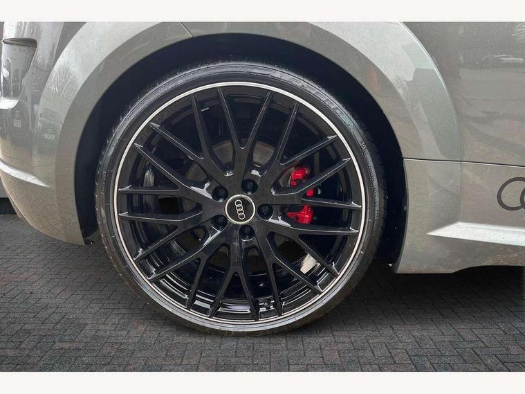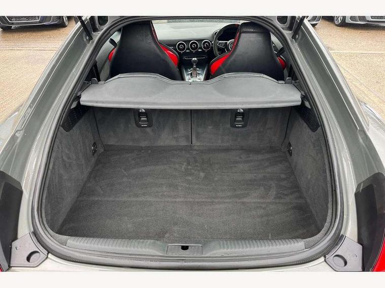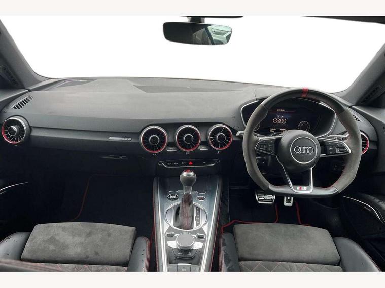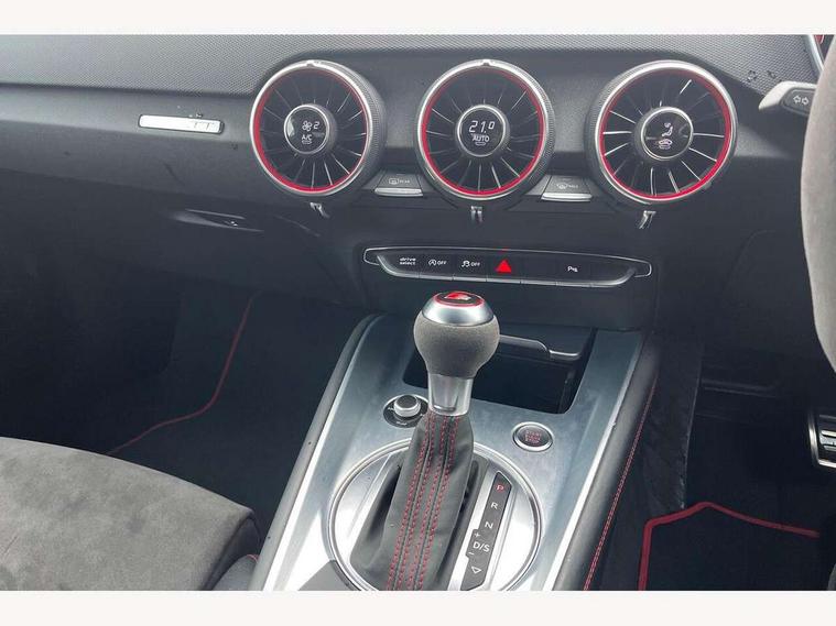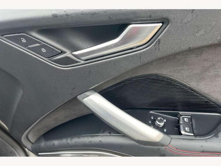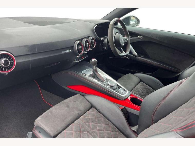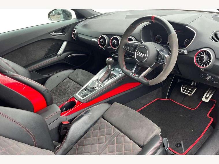 Audi drive select with 4 Pre configured modes, Audi smartphone interface, Audi virtual cockpit - 12.3" high-resolution LCD display with fully customisable instrument cluster, Cruise control + speed limiter, Emergency call service, Mobile phone preparation with bluetooth interface, Progressive power assisted steering, Rear parking sensors, Service interval indicator, Start/Stop system with energy recuperation, TP memo, Sports suspension, 8 Speakers, AM/FM radio, Bluetooth audio streaming, DAB Digital radio, Audi Beam uses LEDs to project the Audi Sport logo, Audi rings decals, Auto dimming rear view mirror, Auto headlight range control, Black chrome tailpipe, Black door mirrors, Dark privacy glass from B-pillar backwards, Electric folding door mirrors, Electric front windows, Electrically adjustable and heated door mirrors with integrated LED side indicators, Heat insulating glass in windshield, Heat reflecting windows, LED 3rd brake light, LED daytime running lights, LED headlights with LED rear lights + dynamic rear indicators, Light and rain sensors, Rear boot, 12V socket, 2 rear seats, 3 spoke flat bottomed high multi-function leather sport steering wheel with gearshift paddles, 4 way electric lumbar support for driver and front passenger, Alcantara leather with 12o'clock marker and express red contrast stitching in steering wheel, Alcantara/leather upholstery with S embossing + contrasting express red stitching on upholstery, Steering wheel and gear knob gaiter, Black headlining, Door sill trims, Extended aluminium look with stainless steel pedals, Front centre armrest, Front passenger seat, Front super sports seats, Heated front seats, Integrated head restraints, ISOFIX child seat mounting for front passenger seat with airbag deactivation, Manual adjustment of seat height, fore/aft position, seat angle, seat depth and backrest angle, Rear head restraints, Rear top tether child seat ISOFIX attachment, Red piped floor mats, Split folding rear seat, Black styling package - TT, Leather pack - TT, LED interior light pack - TT/TTS, Non smoking pack - TT/TT RS, Technology pack without Audi phone box - TT, 3 point front seat belts, ABS, ASR traction control, Curtain airbags, Driver and front passenger airbag with front passenger airbag deactivation, EDL traction control, Electromechanical parking brake, ESP, First aid kit, Front side airbags, Head airbags, Hill hold assist, Red brake callipers, Seatbelt warning, Tyre pressure loss indicator, Warning triangle, Anti theft alarm, Anti theft wheel bolts, Immobiliser, Keyless Go, Remote central locking, Matt brushed aluminium inlays, Tool kit, Tyre repair kit,