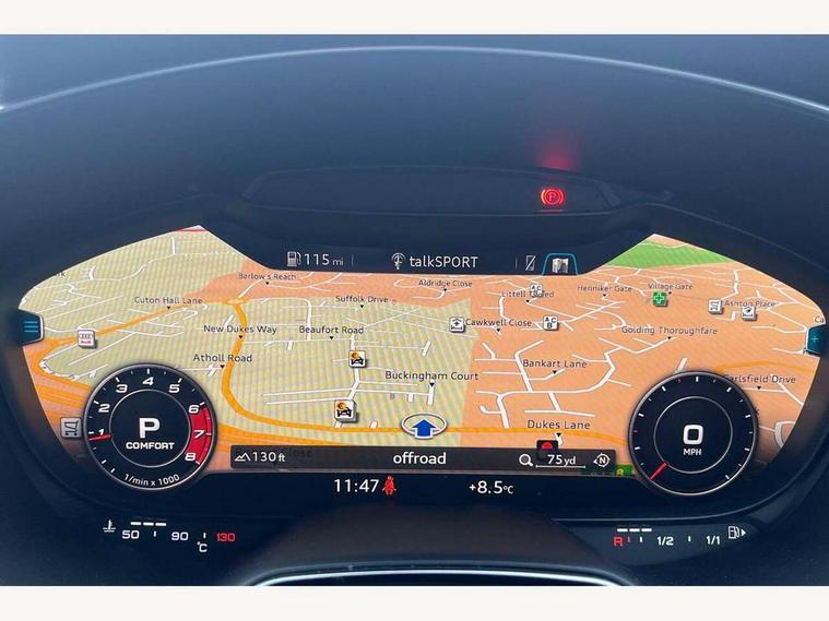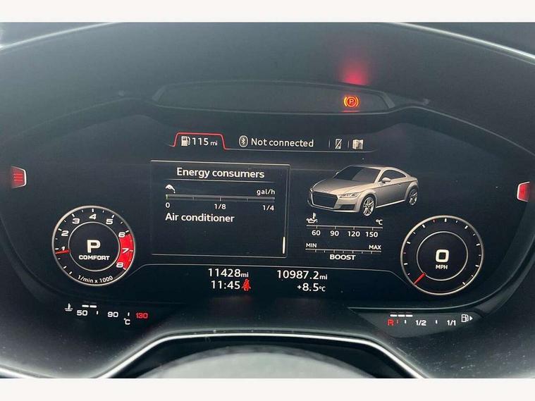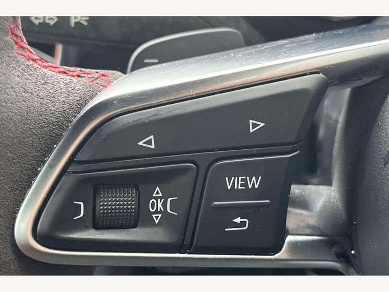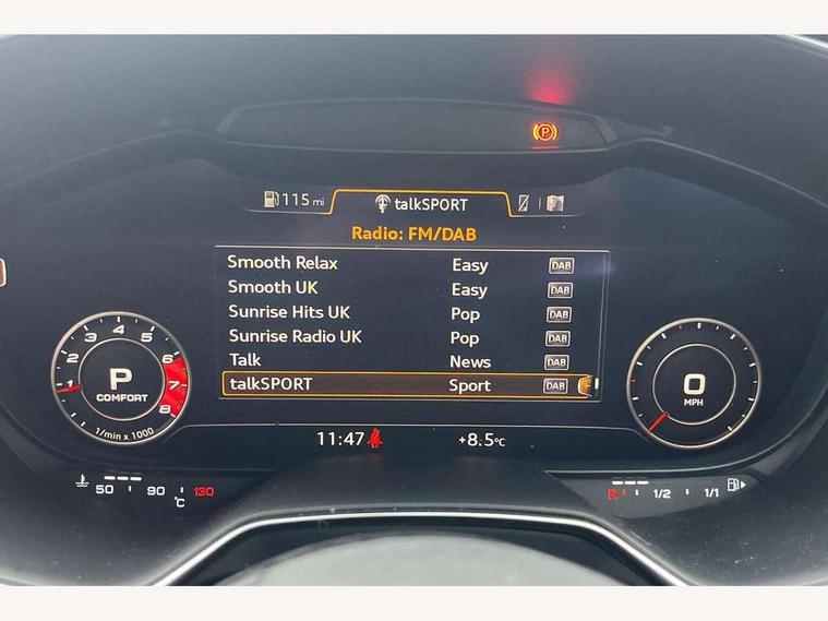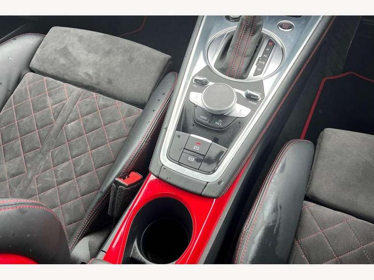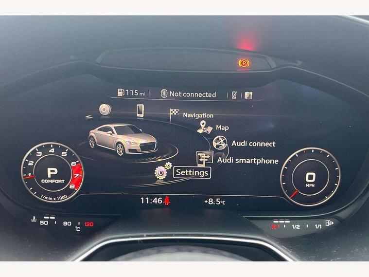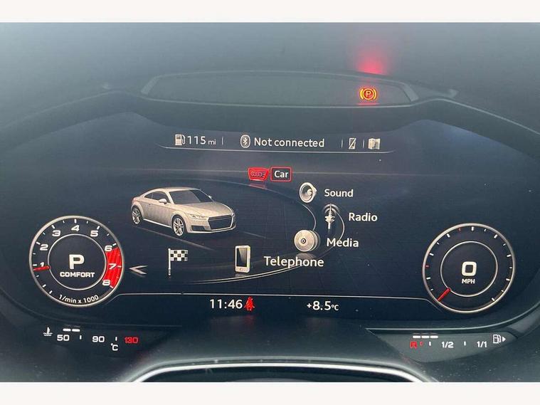 Audi drive select with 4 Pre configured modes, Audi smartphone interface, Audi virtual cockpit - 12.3" high-resolution LCD display with fully customisable instrument cluster, Cruise control + speed limiter, Emergency call service, Mobile phone preparation with bluetooth interface, Progressive power assisted steering, Rear parking sensors, Service interval indicator, Start/Stop system with energy recuperation, TP memo, Sports suspension, 8 Speakers, AM/FM radio, Bluetooth audio streaming, DAB Digital radio, Audi Beam uses LEDs to project the Audi Sport logo, Audi rings decals, Auto dimming rear view mirror, Auto headlight range control, Black chrome tailpipe, Black door mirrors, Dark privacy glass from B-pillar backwards, Electric folding door mirrors, Electric front windows, Electrically adjustable and heated door mirrors with integrated LED side indicators, Heat insulating glass in windshield, Heat reflecting windows, LED 3rd brake light, LED daytime running lights, LED headlights with LED rear lights + dynamic rear indicators, Light and rain sensors, Rear boot, 12V socket, 2 rear seats, 3 spoke flat bottomed high multi-function leather sport steering wheel with gearshift paddles, 4 way electric lumbar support for driver and front passenger, Alcantara leather with 12o'clock marker and express red contrast stitching in steering wheel, Alcantara/leather upholstery with S embossing + contrasting express red stitching on upholstery, Steering wheel and gear knob gaiter, Black headlining, Door sill trims, Extended aluminium look with stainless steel pedals, Front centre armrest, Front passenger seat, Front super sports seats, Heated front seats, Integrated head restraints, ISOFIX child seat mounting for front passenger seat with airbag deactivation, Manual adjustment of seat height, fore/aft position, seat angle, seat depth and backrest angle, Rear head restraints, Rear top tether child seat ISOFIX attachment, Red piped floor mats, Split folding rear seat, Black styling package - TT, Leather pack - TT, LED interior light pack - TT/TTS, Non smoking pack - TT/TT RS, Technology pack without Audi phone box - TT, 3 point front seat belts, ABS, ASR traction control, Curtain airbags, Driver and front passenger airbag with front passenger airbag deactivation, EDL traction control, Electromechanical parking brake, ESP, First aid kit, Front side airbags, Head airbags, Hill hold assist, Red brake callipers, Seatbelt warning, Tyre pressure loss indicator, Warning triangle, Anti theft alarm, Anti theft wheel bolts, Immobiliser, Keyless Go, Remote central locking, Matt brushed aluminium inlays, Tool kit, Tyre repair kit,
