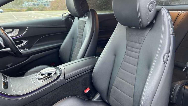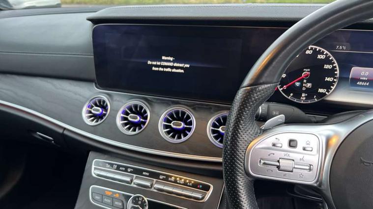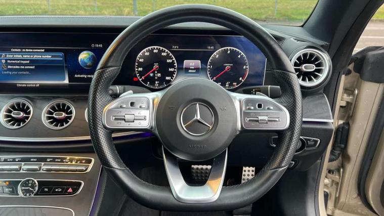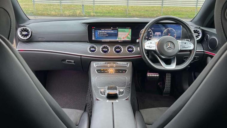 Active parking assist including front and rear parking sensors, Analogue clock, Attention assist, Blind spot assist, Bluetooth interface for hands free telephone, Brake wear warning display, Cockpit display 12.3" widescreen digital instrument cluster, Collision prevention assist plus, Direct steer speed sensitive steering, Direct steering, DYNAMIC SELECT with a choice of driving modes (ECO, Comfort, Sport, Sport+ and Individual), ECO start/stop function, Engine start/stop button, High resolution 12.3" multimedia colour display, Mercedes connect me, Multi function trip computer, Outside temperature display, Remote boot release, Reversing camera, SD card based satellite navigation system, Service indicator (ASSYST), Status display for rear seat belts in instrument cluster, Touchpad with control wheel, 25 litre AdBlue tank, 66 litre fuel tank, Agility control sports suspension with selective damping system, Diesel particulate filter, Incorrect fuelling protection, 2 USB ports in centre console, Audio 20 with USB, touchpad and control wheel with Media Interface with Bluetooth interface and hands-free function, DAB Digital radio, Adaptive brake lights, AMG bodystyling front and rear aprons, side skirts, AMG boot lid spoiler in body colour, AMG front, rear apron and side skirts, Body colour door handles, Body coloured bumpers, Electric windows with one touch opening/closing and obstruction sensors, Exterior mirrors heated and electronically adjustable, Illuminated front door sill panels with Mercedes-Benz lettering, LED high performance headlamps with integrated LED daytime running lights, Magic Vision Control heated windscreen wiper system, Pre-installation for roof rail systems, Privacy glass Includes rear side windows and rear windscreen, Rain sensing windscreen wipers, Rear LED lights, Top surround of side windows in polished aluminium, Visible twin pipe exhaust system integrated into bumper, 3-spoke flat bottom multifunction AMG steering wheel with Touch Control buttons, trimmed in black nappa leather, 4 way adjustable front head restraints and 2 way rear head restraints, 40:20:40 split folding rear seats, Artico man-made leather upper dashboard and beltlines with contrast stitching, Automatic child seat recognition sensor, Automatic two zone climate control, Bag hook in luggage compartment, Belt feeder driver and front passenger seat belt automatically positioned within easier reach, Black roof lining, Central stowage compartment with 12 V socket in centre console, Centre armrest and door handle illumination, Chrome door pins, Easy entry seats, Floor mats with AMG lettering, Front and rear door pockets, Front centre armrest with stowage compartment, Front footwell lights, Glasses compartment in overhead control panel, Glove compartment - lockable, air conditioned and illuminated, Heated front seats, Interior lighting - 64 colour Ambient lighting, Interior rear light/integral reading lights, Isofix rear child seat fastenings, Multi contour front sports seats, Multi function steering wheel, Partial electric front seats/backrest/height adjust, Rear centre armrest with 2 cupholders + storage, Seat occupancy sensor for front passenger seat, Sports pedals in brushed stainless steel with black rubber studs, Steering column manually adjustable for height and reach, Steering wheel gearshift paddles, Steering wheel touch control buttons for audio and onboard settings, Storage net in luggage compartment, Sunvisors with illuminated vanity mirrors, Twin front cupholders, Mirror pack - E Class, Seat comfort pack - E Class, Stowage pack - E Class, Active bonnet, Active brake assist, Adaptive brake system, Adaptive driver and front passenger airbags, Anti-lock braking system (ABS), Crash sensor (auto door unlocking), Drivers knee airbag, Electric parking brake, Electronic Stability Programme, Front and rear window airbags, Front seatbelt pretensioners, Front side airbags, Head airbags, Hill hold function, Perforated front brake discs with "Mercedes-Benz" lettering, Seatbelt warning, Three point rear seat belts, Tyre pressure monitoring system, Warning triangle and first aid kit, Alarm system/interior protection/immobiliser, Central locking with interior switch, automatic locking and crash sensor with emergency opening function, Chrome surround in electric key, Keyless entry go starting function, Black open pore ash wood, Open pore black ash wood centre console, Run flat tyres,