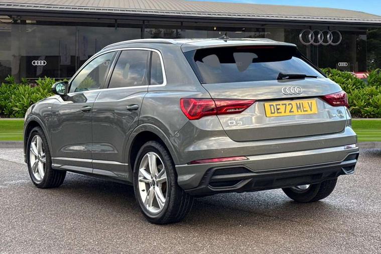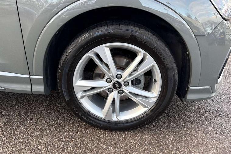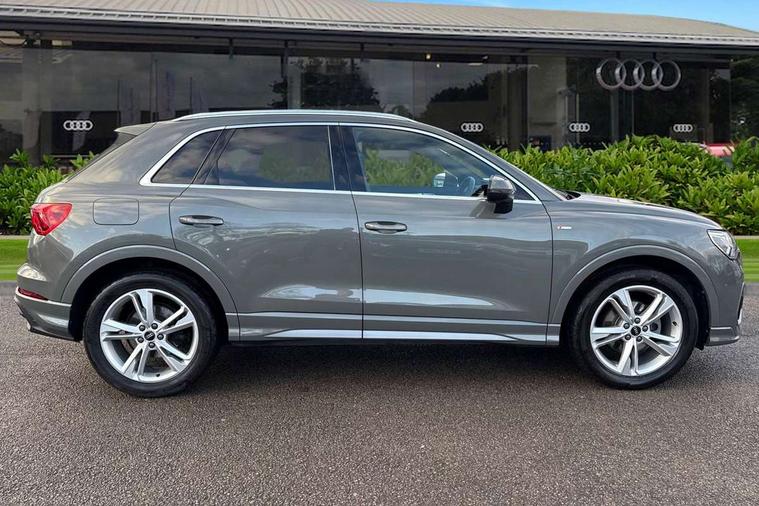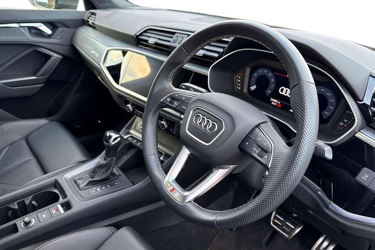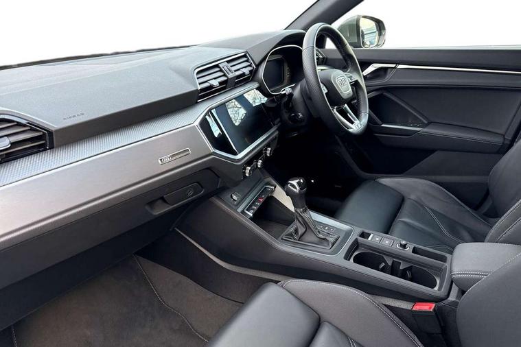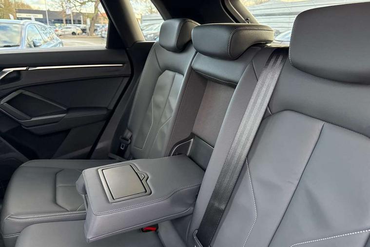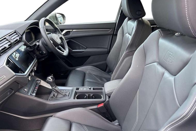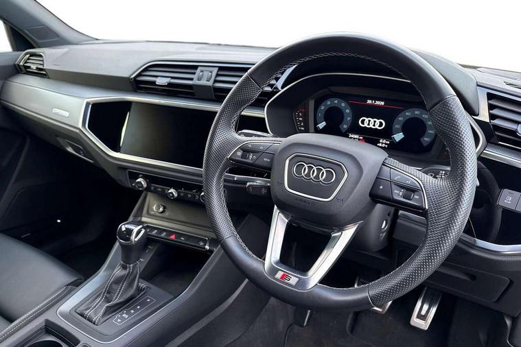 Amazon alexa Integration, Audi drive select, Audi lane departure warning, Audi Virtual Cockpit - 10.25" display, Bluetooth interface, Camera based traffic sign recognition, Legal emergency call, MMI Navigation Plus with high resolution 10.1 inch touchscreen colour display, Power operated tailgate, Progressive steering, Service interval indicator, Smartphone interface includes wireless Apple carplay/Android Auto, Start stop system with recuperation, Voice control system with natural language interaction, Sports suspension, 2 USB-C ports with charge and data functions, 6 passive loudspeakers, DAB digital radio module, Acoustic windscreen, Aluminium roof rails, Aluminium window trim, Auto dimming frameless rear view mirror, Body colour front spoiler blade, Body coloured bumpers, Electrically folding, adjustable and heated door mirrors with integrated LED side indicators and kerb view function for passenger side, Front and rear electric windows, Front fog lights, Front side air inlets in matt platinum grey, Grille vertical bars in aluminium silver/Matt, High gloss black finish B and C pillars, LED Dynamic rear indicators, LED headlights with LED daytime running lights, LED rear lights, LED third brake light, Privacy glass dark tinted rear and rear-side windows (from B-pillar backwards), Rain and light sensors, Rear diffuser grille in grained matt black, Rear diffuser strip in matt titanium black, Rear side wing doors, Rear wiper, S line badges on front wings, S Line front and rear bumpers, Side skirt insert in matt Platinium grey, Titanium black radiator grille, Variable front intermittent wipers, 12V socket in rear centre console, 3 seat bench in 2nd row, 40:20:40 folding with manual adjustment for 60:40 forwards/backwards position and backrest angle, Adjustable rear seat bench/backrest with centre armrest and cupholder, Black cloth headlining, Dual zone electronic climate control, Front and rear black floor mats with contrast stitching in rock grey, Front and rear headrests, Front and rear roof module including reading lights, Front centre armrest, Glove compartment lighting, Height and reach adjustable steering wheel, Illuminated door sill trims with S logo, ISOFIX child seat mounting for front passenger with airbag deactivation and outer rear seat including top tether attachment point for outer rear seats, Luggage compartment light, Manual front seats with height adjustment, Perforated leather gearknob, Single front passenger seat, Stainless steel luggage compartment sill finisher, Stainless steel pedals, Ambient lighting pack - Q3, Non smoking pack - Q3, 3x3 point rear seatbelts, 6 airbags - Driver, front passenger, curtain and side windows, Audi pre-sense front with pedestrain and cyclist recognition, Electrically operated child locks on rear doors, Electromechanical parking brake, Electronic stabilisation control including ABS, ASR and EDL, Front seatbelt reminder, Hill descent control, Hill hold assist, Pre sense basic, Seatbelt monitoring, Tyre pressure warning, Warning triangle and first aid kit, Anti theft alarm, Anti theft wheel bolts, Immobiliser, Remote central locking, Dark matt brushed aluminium inlay, Detail dashboard around MMI touch colour display in glass look, black with surround in aluminium look, Leatherette door armrest,