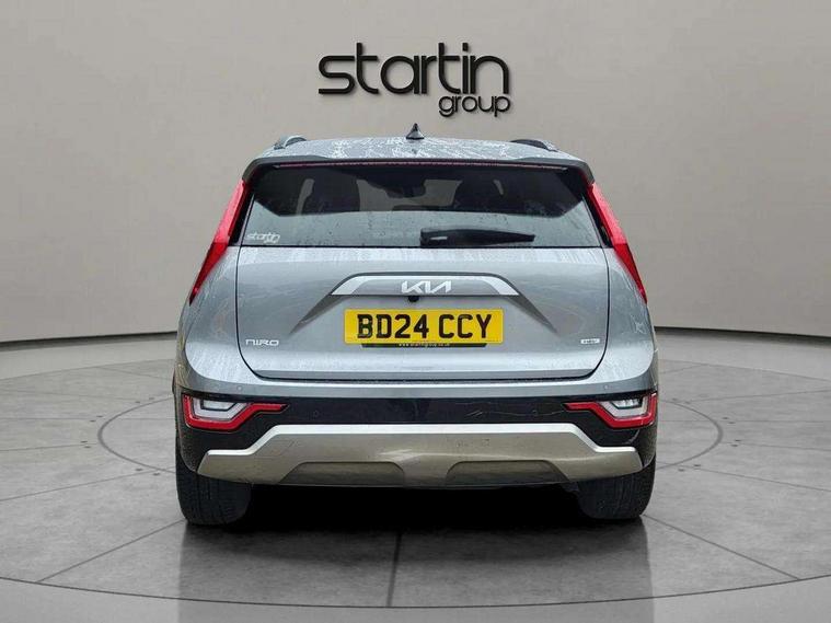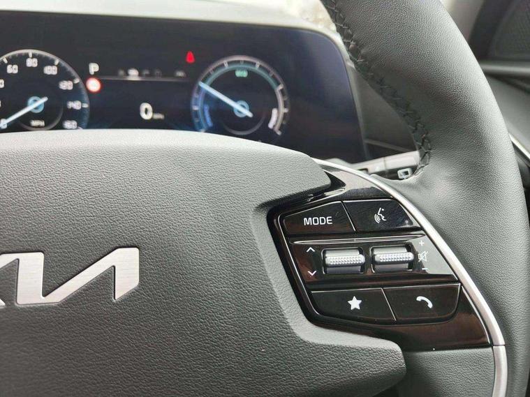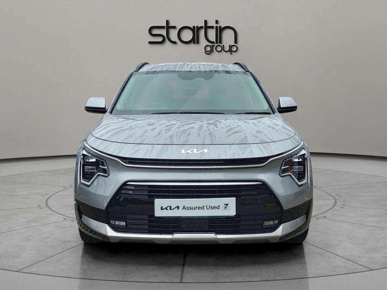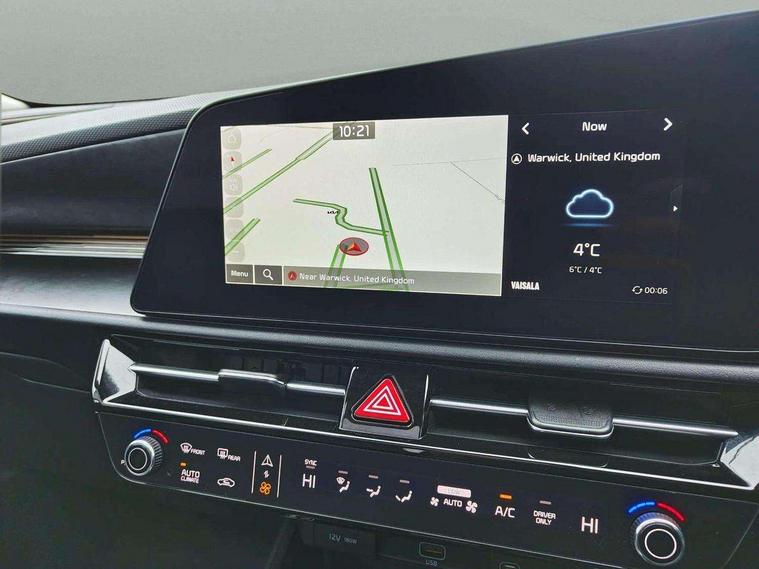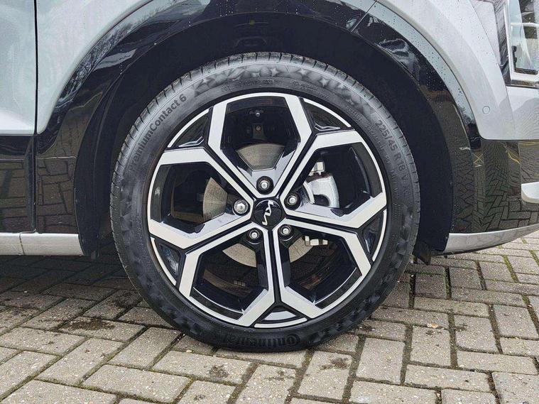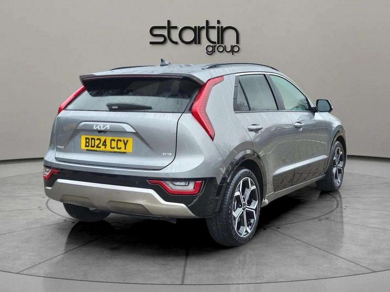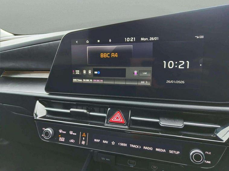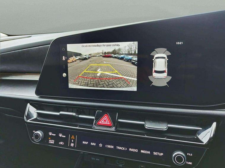 10.25" Supervision colour cluster display, 10.25" touchscreen satellite navigation, Adaptive smart cruise control function (SCC) with stop and go, Apple car play/Android Auto with voice control, Blind spot collision avoidance assist, Drive mode select (Eco, sport), E-call, Emergency stop signalling system, Forward Collision-Avoidance Assist (FCA) 1.5 - City/Pedestrian/Cyclist/Junction turning, Front parking sensors, Head up Display, Highway Driving Assist (HDA), Kia Connect (UVO), Lane Following Assist (LFA), Lane keep assist, Motor driven power steering, Parking collision avoidance assist (PCA), Power opening/closing tailgate, Rear cross traffic alert, Rear parking sensors, Remote smart parking assist, Reversing camera with dynamic guide lines, Safe exit warning (SEW), Speed limit assist, Trip computer with distance/fuel consumption/average speed, Wireless Smartphone charger, 220v AC Inverter, 'Shark fin' mobile antenna, 2 Front USB Charge port (one for C-type/one for USB), 2 type C USB ports on front seats, 6 speakers, Bluetooth with music streaming, DAB Digital radio, Steering wheel mounted controls, Acoustic windshield, All round electric windows with drivers and front passenger auto up/down and safety function, Auto dimming rear view mirror, Automatic defog system, Automatic headlight control system, Black grille with chrome surround, Body colour bumpers, Body colour exterior door handles, Deluxe door scuff plates, Dual LED headlights (low and high projection), Electric heated door mirrors, Electrically folding door mirrors, Front and rear chrome skid plates, Front fog lights, Heated rear window with timer, High gloss black cladding, High gloss black door mirrors, LED daytime running lights, LED rear combination lights, LED third brake light, One touch single tilting/sliding power sunroof, Privacy glass - Rear windows and tailgate, Rain sensing front wipers, Rear fog lights, Rear side wing doors, Rear spoiler, Rear wiper, Roof rails, Solar glass windscreen, Welcome and follow-me home light functionality, Windscreen Washer Level Warning, 12V socket in front, 12V socket in luggage compartment, 3 seat bench in 2nd row, 60:40 split remote folding rear seats, All-round height adjustable headrests, Aluminium pedals, Artificial leather centre console storage box, Artificial leather steering wheel, Centre console cupholder, Chrome coating interior door handles, Driver and front passenger power adjusted seat, Driver power adjusted memory seat, Driver/passenger sunvisors with illuminated vanity mirrors, Drivers seat power lumbar support, Dual zone automatic air conditioning, Front and rear door storage, Heated front seats, Heated outer rear seats, Heated steering wheel, Illuminated glovebox, Interior door lock/unlock function, ISOFIX Child seat top tethers and anchor fixings, LED overhead console, 2nd row and luggage lamp, Luggage area load cover, Luggage board, Paddle shifts, Passenger premium relaxation seat, Power adjustable lumbar support on front passenger seat, Rear armrest, Seatback pocket - driver, Seatback pocket - front passenger, Shift by wire SBW, Single front passenger seat, Tilt/telescopic adjustable steering wheel, Vegan leather upholstery, Ventilated front seats, Ventiliation ducts to rear compartment, Towing pack - Niro, 3 point seatbelts on all seats, ABS, Automatic unlocking of doors in case of impact, Centre side front airbags, Curtain and side airbags, Drivers knee airbag, Dual shell horn, Electric parking brake with auto hold function, Electronic stability control, Front passenger airbag deactivation, Height adjustable front seatbelts, Hill start assist control (HAC), Manual rear child locks, Rear seat alert system, Traction control, Tyre pressure monitoring system, Alarm system and engine immobiliser, Deadlocks, Engine Start/Stop Button with Smart Entry System, Locking wheel nuts, Visible vehicle identification number, Warranty - 7 Years/ 100, 000 miles, Centre fascia chopped carbon, 18" Alloy wheels, Tyre mobility kit,