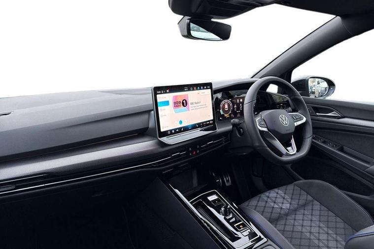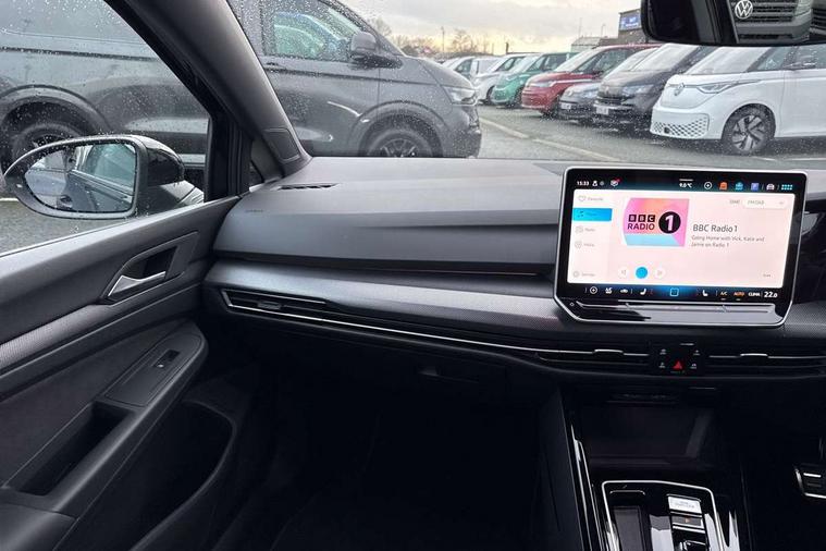 Activated carbon canister, Adaptive cruise control (ACC), Advanced driver attention and drowsiness monitor, Dynamic road sign display, Dynamic steering, E-Sim card for online connectivity, eCall emergency call system, Multi-color Digital cockpit pro, selection of different info profile possible, Multifunction front facing camera for distance control, Navigation system, Oncoming vehicle braking when turning including swerve support, Speed limiter, Speedo, rev counter, electronic odometer, trip, service interval display, exterior temperature and fuel gauge, Traffic jam assist, Voice enhancer and voice control, Warning signal and warning light for front and rear seatbelts not fastened, We connect plus preparation, We connect preparation, Wireless app connect, Hybrid propulsion system, Petrol Particulate Filter, Start-stop system with battery regeneration (recuperation - energy recovery during braking), XDS electronic differential lock for improved traction and handling, 2 USB C ports in front, 2 USB charging sockets on the centre console in the rear charging capacity upto 45W, Digital radio reception (DAB), Diversity antenna for FM reception, Gaming platform via car app, Infotainment system with 12.9" display, Mobile phone interface with inductive charging feature, 3rd brake light, Auto dimming rear view mirror, Automatic headlamp activation with Coming home and Leaving home feature, Body colored bumpers in R-Line style, Body colour door handles, Exterior ambient lighting, Exterior mirrors convex on the left and aspherical on the right, Front and rear electric windows, Heat insulating windshield made of laminated glass, LED separate daytime running light, Rain sensor, Rear exhaust tailpipe, Rear fog light on one side and reversing lights on both sides, Rear side wing doors, Rear windscreen washer and wiper with interval delay, Remote electrically foldable door mirrors, puddle lights and reverse activated passenger's door mirror, Volkswagen logo in front, illuminated lighting animation with wake up/goodbye scenario and illuminated door handles, Welcome light with surround lighting, 12V socket in front centre console, 12V socket in luggage compartment, 3 rear head restraints, 3 seat bench in 2nd row, Ambient lighting with 30 colour including LED light unit in front footwell with selectable light colour, Black roof lining, Brushed stainless steel pedals, Chrome plated radiator grille inserts, air vent surrounds and light switch surrounds, Door insert, side trim panel and arm support in leatherette, Front + rear black carpet mats, Front centre armrest, Front seat lumbar support adjuster, Integrated front head restraints, ISOFIX anchors for child seats on outer rear bench seats and on front passanger seat compatible for i-Size, Luggage compartment lighting, Manual height adjustable front passenger seat, Manually height adjustable driver seat, Plastic gear knob, Premium sports seats in front, Rear cupholder and loadthough, Sardegna cloth upholstery with front and outer rear seats Art Velour inner sides of bolsters, Single front passenger seat, Split folding backrest with centre armrest and unsplit rear seat bench, Sun visors with illuminated vanity mirrors, Titanium black instrument panel, Black exterior Styling package with Matrix LED headlights - Golf, Winter package - Golf DSG Estate/Hatchback, 3 point height adj front seatbelts + pretensioners, 3 rear three point seatbelts, ABS, Autonomous emergency braking front assist with pedestrian and cyclist monitoring, Child locks on rear doors, Driver and front passenger airbag with front passenger airbag deactivation, Electronic parking brake with auto hold, ESC (Electronic Stability Control), Extended pedestrian protection measures, Hill start assist, Rear disc brakes, Two tone horn, Tyre pressure loss indicator, Volkswagen roadside assistance, Anti theft wheel bolts, Preparation for alcohol interlock, Decorative inserts carbon grey for dashboard and front door trim panels, 18" Leeds alloy wheels, Tool kit for tyre mobility set, Tyre mobility kit Includes 12V compressor and tyre sealant,